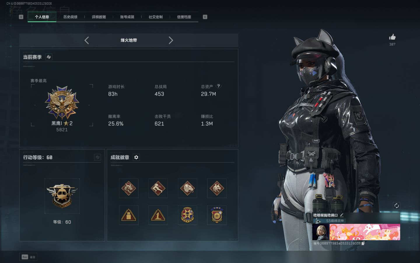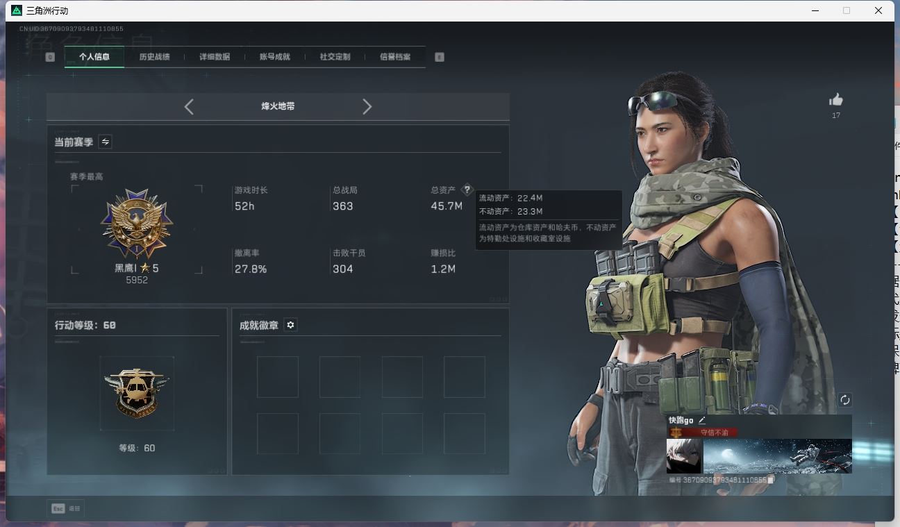 【账号佳】 ljh AK025962 包人脸 行动等级60黑鹰 总资产29.7m 满体【典藏 余烬之影2s】【M4A1突击步枪-蚀金玫瑰ASh-12战斗步枪-鹅鸭杀0C0171冲锋枪-鹅鸭杀0JB201轻机枪-鹅鸭杀SCAR-H战斗步枪-启航联动 R93狙击步枪-维什戴尔M250通用机枪-骑士之心K437突击步枪-北极星0C0171冲锋枪-北极星 AK-12突击步枪-特斯拉线圈UZ1冲锋枪-特斯拉线圈联动 M4A1突击步枪-阿米娅腾龙突击步枪-捞点薯条AWM狙击步枪-捞点薯条93R-捞点薯条 】【近战 信条 北极星 黑海 影锋 黑鹰】【角色皮肤 红狼-蚀金玫瑰 威龙-壮志凌云 无名-夜鹰 蜂医-送葬人无题密令 深蓝-不破誓约 露娜-黑天际线】----安全箱等时效性道具请以游戏内数据为准:详情请看图----截图展示段位不代实际段位,赛季更新等不可抗拒因素发生变化、时限道具不保证所剩时间、标题未写送三角币默认不送】【主播担保+安全至上+性价比 买号卖号只选金牌商家一左友】