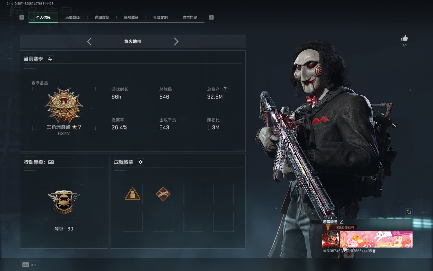 【账号佳】 ljh AK027612 包人脸 行动等级60钻石 总资产182.9m 满体 【KC17突击步枪-电锯惊魂M14射手步枪-电锯惊魂G3战斗步枪-骑士ASh-12战斗步枪-鹅鸭杀0C0171冲锋枪-鹅鸭杀0JB201轻机枪-鹅鸭杀SCAR-H战斗步枪-启航 UZ1冲锋枪-特斯拉线圈SR-3M紧凌突击步枪-特斯拉线圈联动 M4A1突击步枪-阿米娅联动 勇士冲锋枪-能天使-午夜邮差腾龙突击步枪-捞点薯条 】【近战 怜悯 黑鹰】【角色皮肤 红狼-蚀金玫瑰 红狼-电锯惊魂 威龙-飞虎 威龙-壮志凌云 无名-夜鹰 蜂医-送葬人无题密令 深蓝-不破誓约 露娜-黑天际线 】----安全箱等时效性道具请以游戏内数据为准:详情请看图----截图展示段位不代实际段位,赛季更新等不可抗拒因素发生变化、时限道具不保证所剩时间、标题未写送三角币默认不送】【主播担保+安全至上+性价比 买号卖号只选金牌商家一左友】