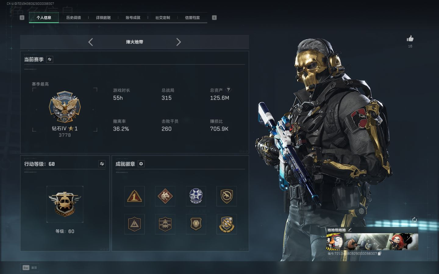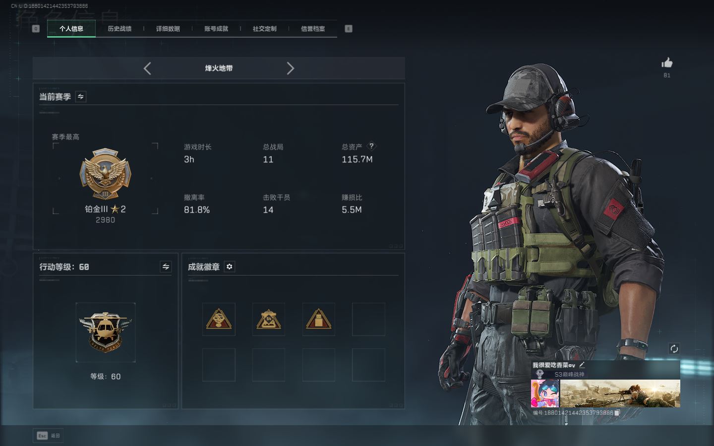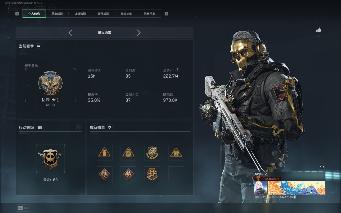 【账号佳】 ljh AK027550 包人脸 行动等级60铂金 总资产115.7m 满体【ASh-12战斗步枪-鹅鸭杀0CQ171冲锋枪-鹅鸭杀0JB201轻机枪-鹅鸭杀SCAR-H战斗步枪-启航G3战斗步枪-骑士M250通用机枪-骑士之心AK-12突击步枪-特斯拉线圈UZ1冲锋枪-特斯拉线圈 联动 M4A1突击步枪-阿米娅腾龙突击步枪-捞点薯条AWM狙击步枪-捞点薯条93R-捞点薯条联动 725双管霰弹枪-送葬人-无题密令 】【近战 黑鹰】【角色皮肤 威龙-壮志凌云 蜂医-送葬人无题密令 露娜-黑天际线 骇爪-水墨云图 】----安全箱等时效性道具请以游戏内数据为准:详情请看图----截图展示段位不代实际段位,赛季更新等不可抗拒因素发生变化、时限道具不保证所剩时间、标题未写送三角币默认不送】【主播担保+安全至上+性价比 买号卖号只选金牌商家一左友】