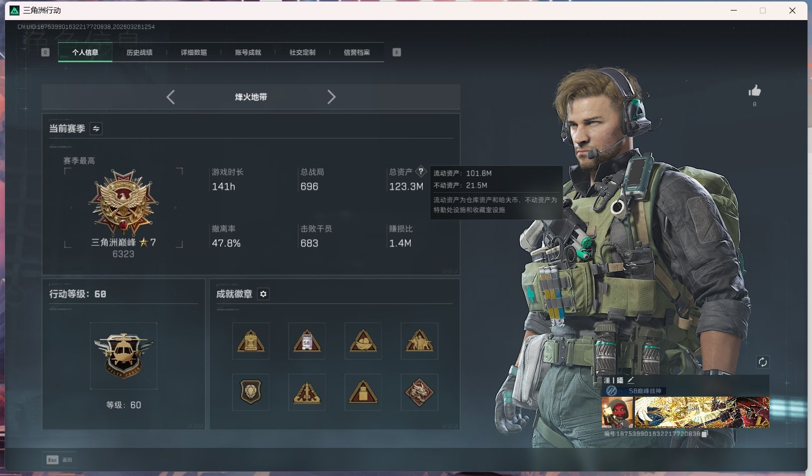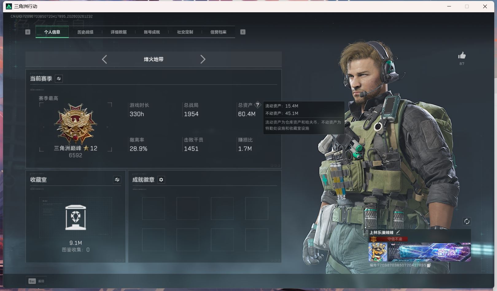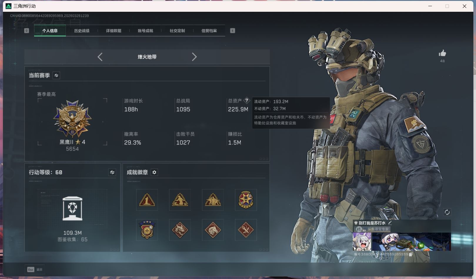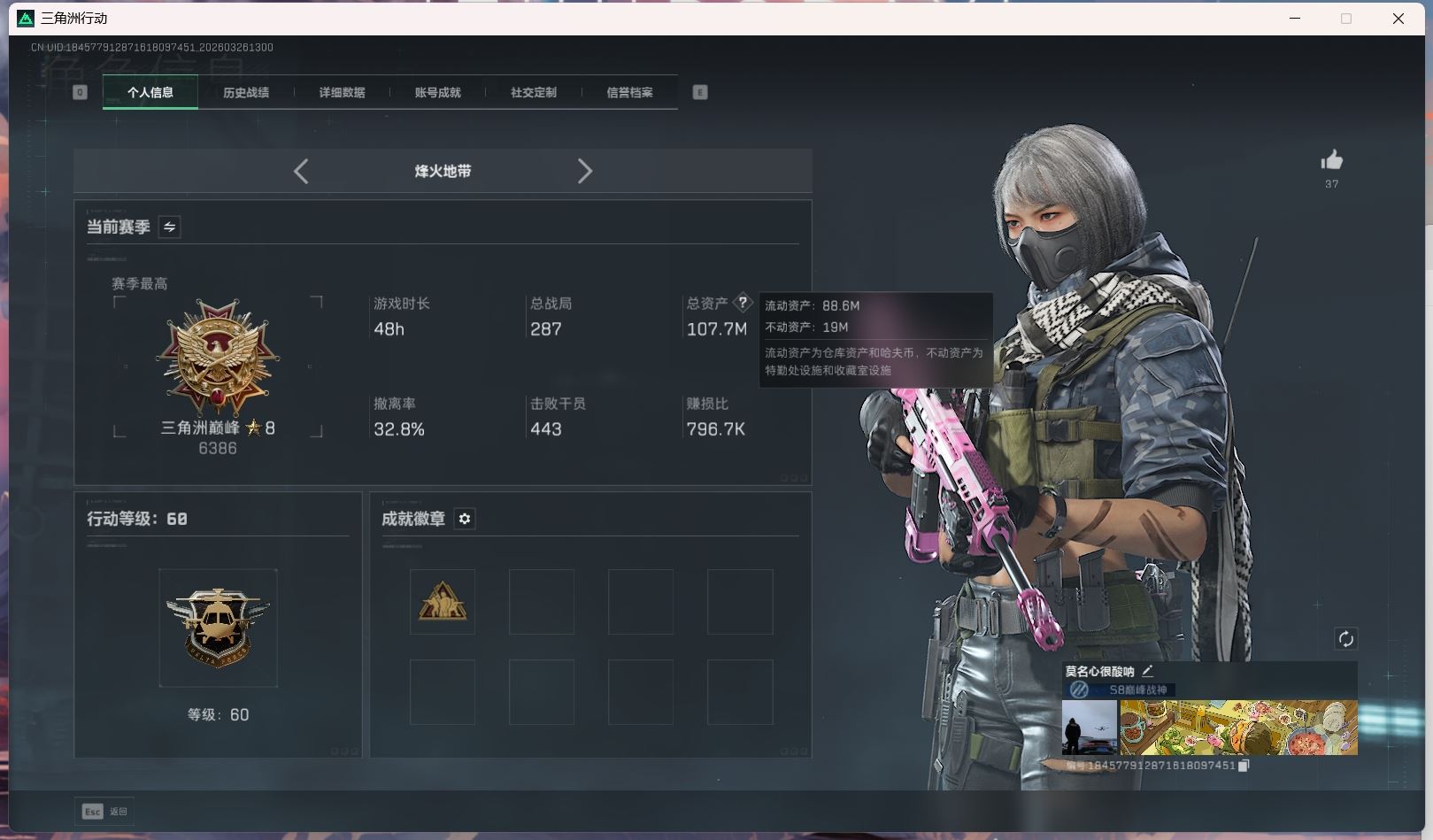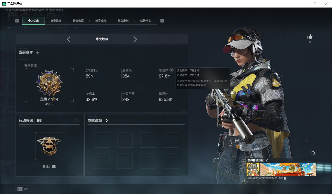 【账号佳】 hmc AK035271行动等级:60三角洲巅峰,总资产123m哈夫币【满体 s8赛季33 零号玩家】【角色皮肤:蛊-不羁人生 乌鲁鲁-荒原猎手】【近战:近战-暗星 黑鹰 处刑者】----安全箱等时效性道具请以游戏内数据为准:详情请看图----截图展示段位不代实际段位,赛季更新等不可抗拒因素发生变化、时限道具不保证所剩时间、标题未写送点券默认不送】【主播担保+安全至上+性价比 买号卖号只选金牌商家一左友】