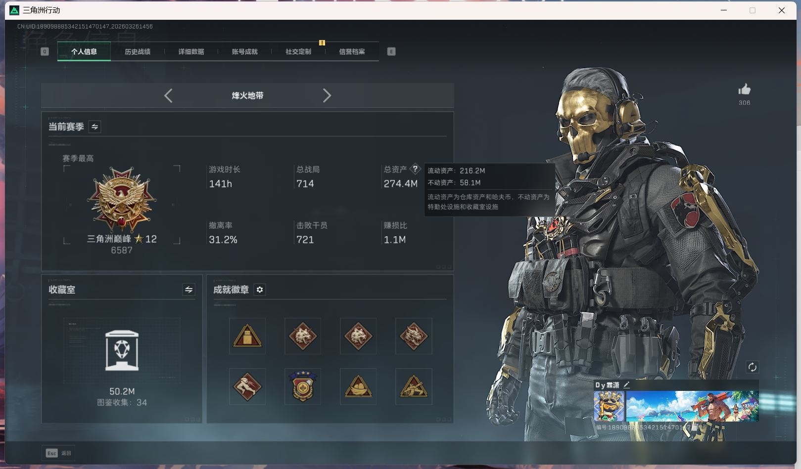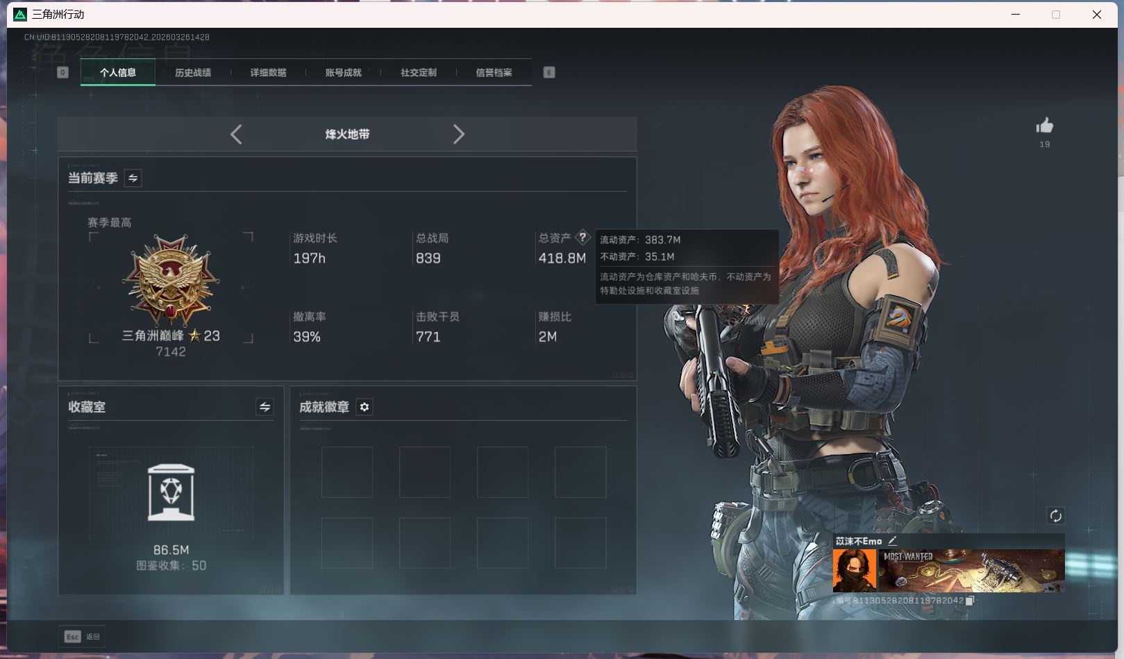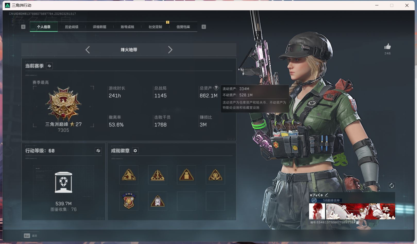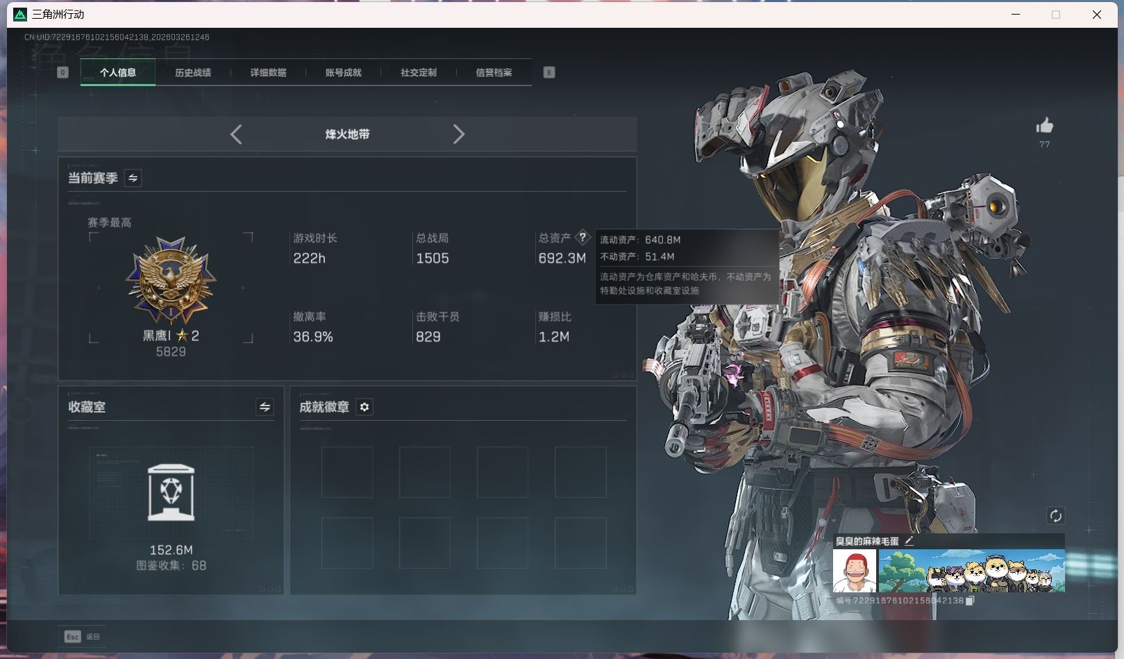 【账号佳】 hmc AK035271行动等级:60三角洲巅峰,总资产123m哈夫币【满体 s8赛季33 零号玩家】【角色皮肤:蛊-不羁人生 乌鲁鲁-荒原猎手】【近战:近战-暗星 黑鹰 处刑者】----安全箱等时效性道具请以游戏内数据为准:详情请看图----截图展示段位不代实际段位,赛季更新等不可抗拒因素发生变化、时限道具不保证所剩时间、标题未写送点券默认不送】【主播担保+安全至上+性价比 买号卖号只选金牌商家一左友】
