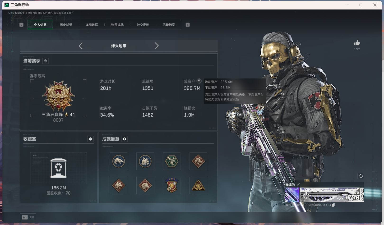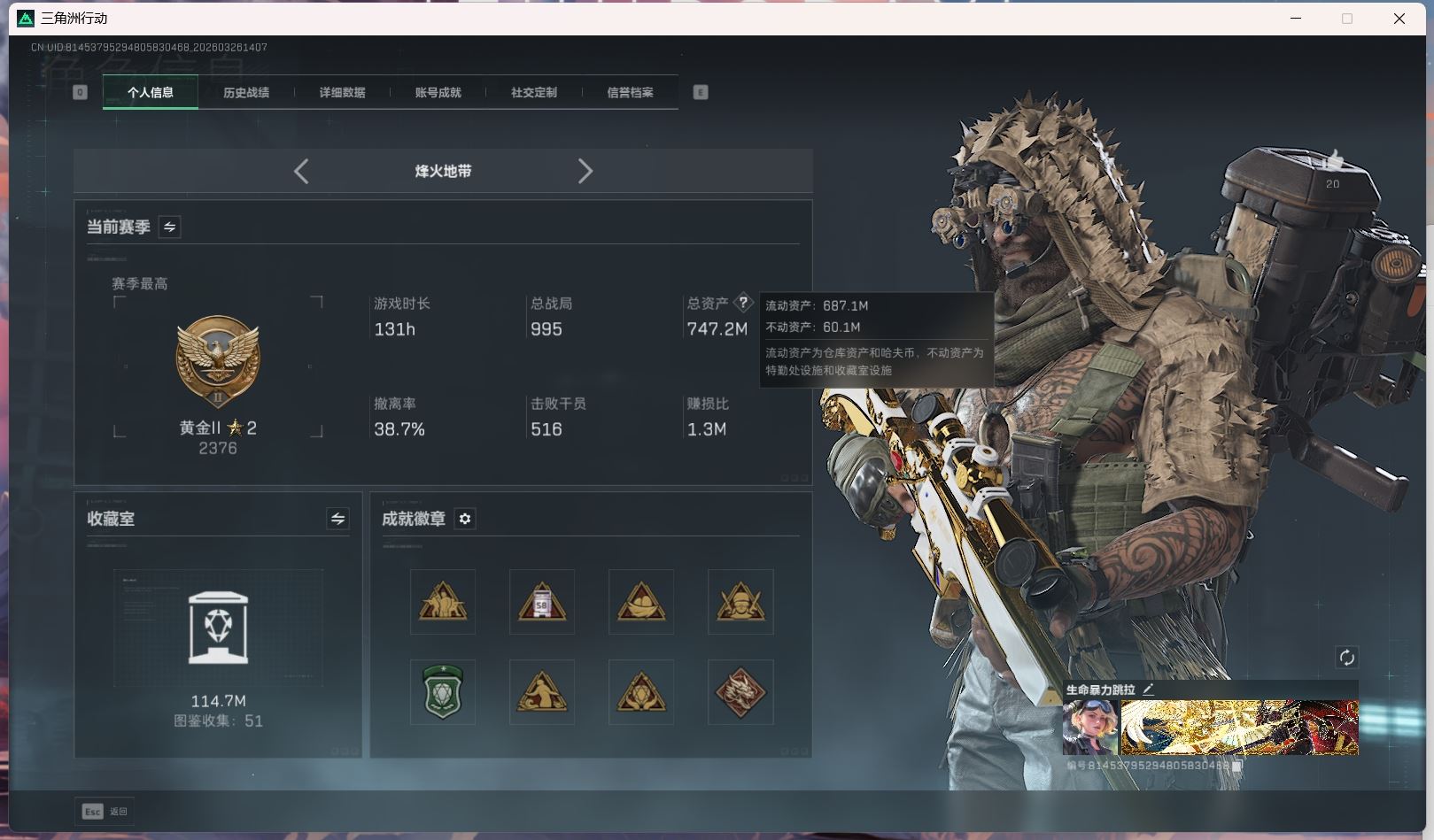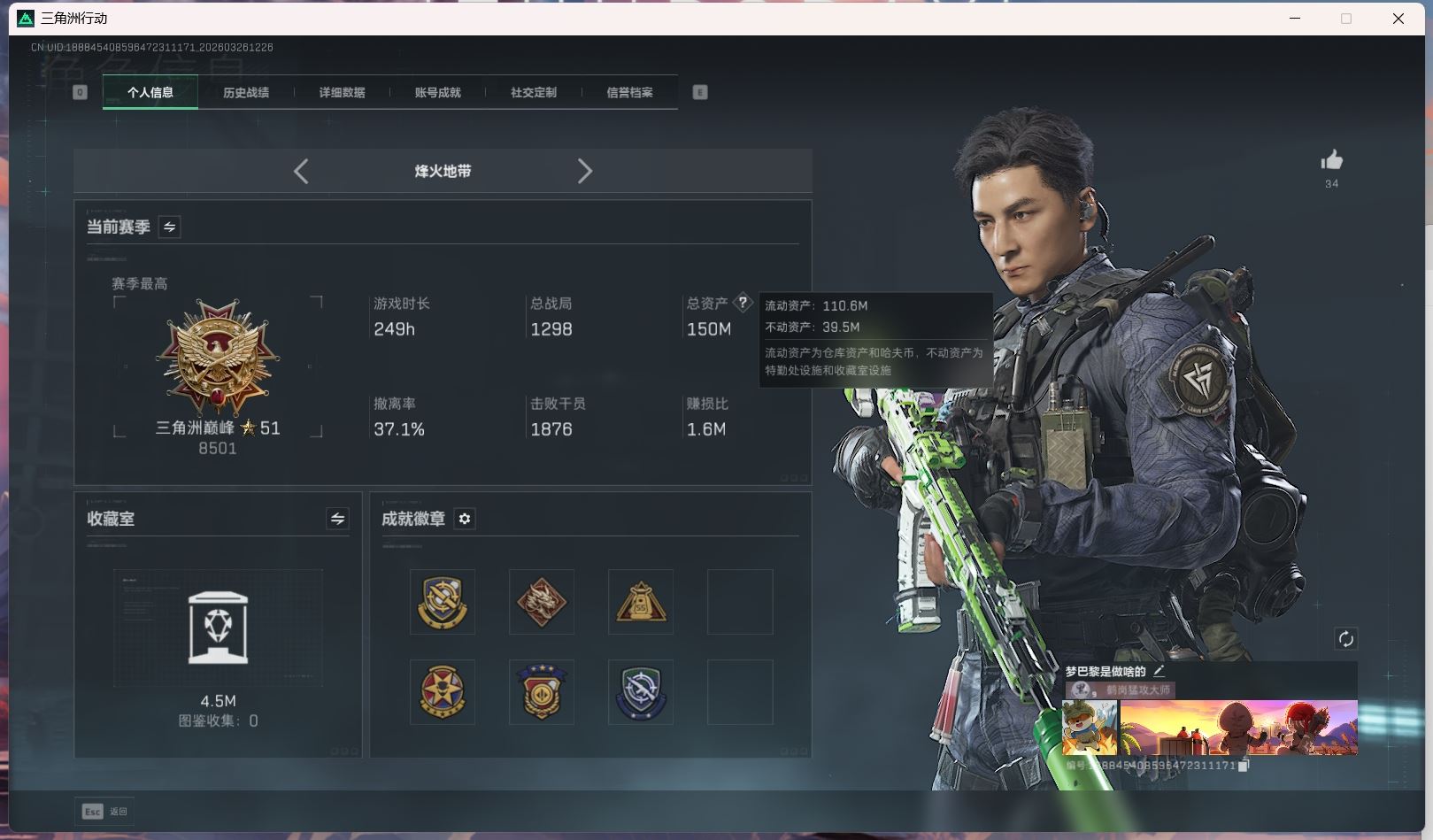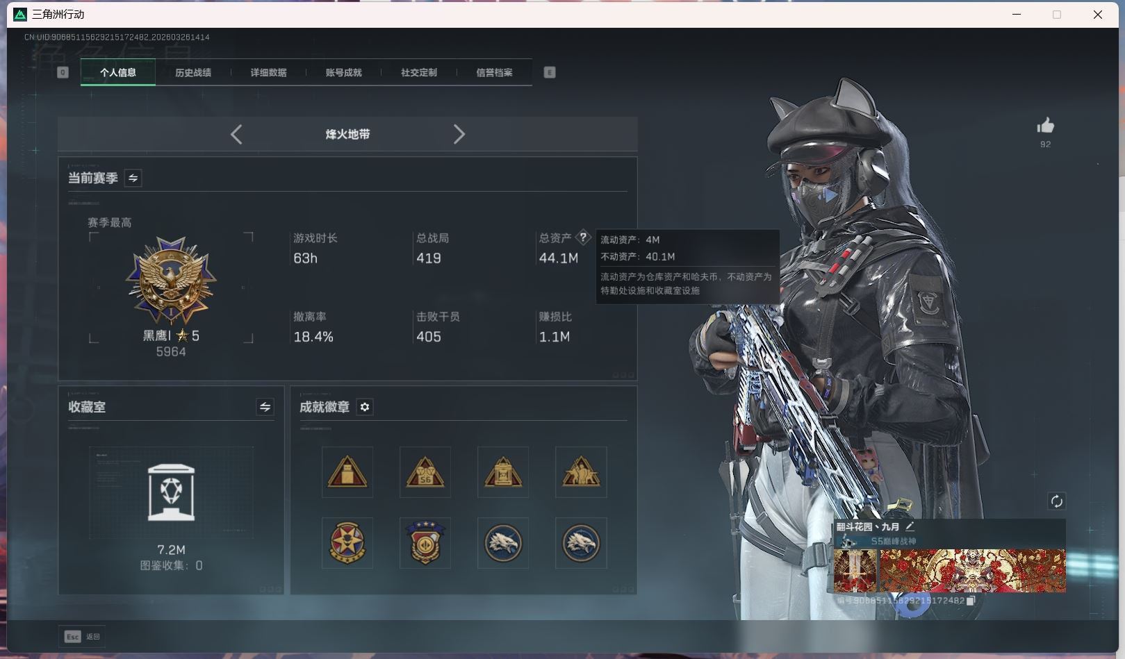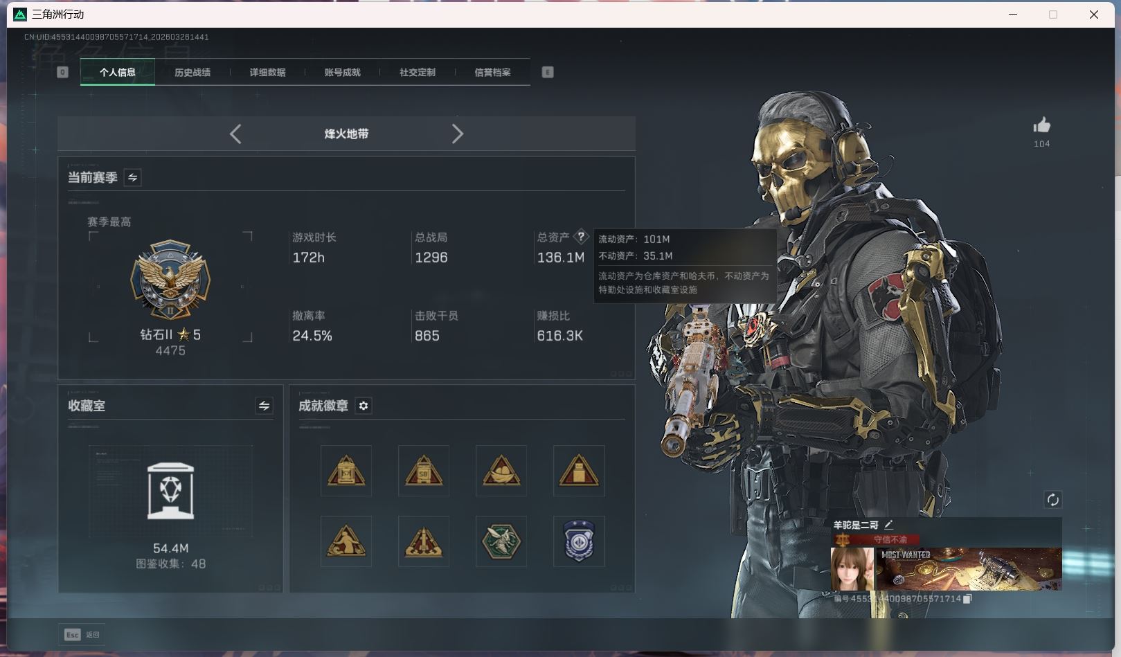 【账号佳】 hmc AK035271行动等级:60三角洲巅峰,总资产123m哈夫币【满体 s8赛季33 零号玩家】【角色皮肤:蛊-不羁人生 乌鲁鲁-荒原猎手】【近战:近战-暗星 黑鹰 处刑者】----安全箱等时效性道具请以游戏内数据为准:详情请看图----截图展示段位不代实际段位,赛季更新等不可抗拒因素发生变化、时限道具不保证所剩时间、标题未写送点券默认不送】【主播担保+安全至上+性价比 买号卖号只选金牌商家一左友】
