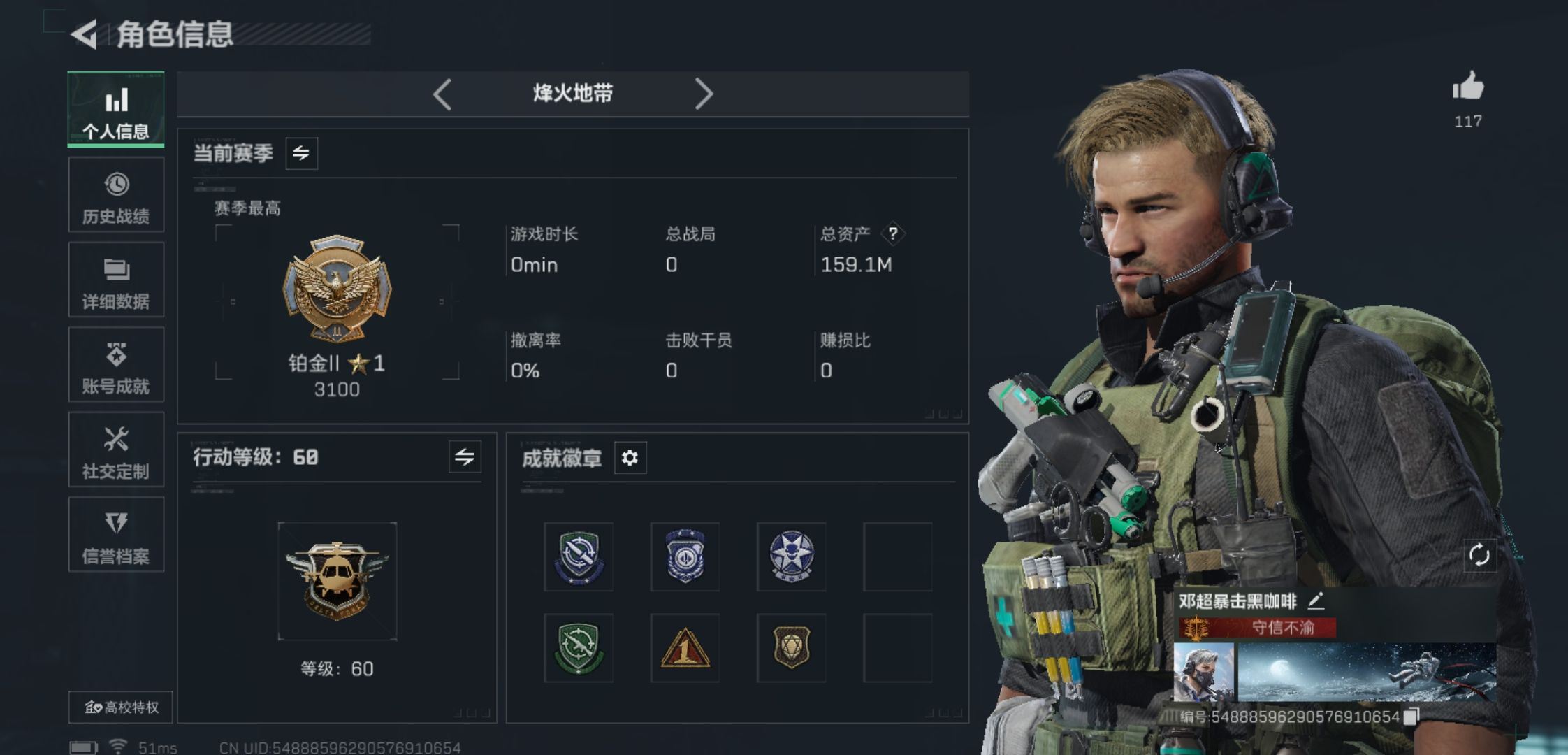 【账号佳】 R46309 可二次 QQ 《战斗等级60》《总资产159.1》《战场等级1》《仓库8 指挥中心5 训练等级6 靶场6 潜水中心1 收藏室1》《黑鹰》《M41A突击步枪阿米娅 M41A突击步枪蚀金玫瑰 ASh12战斗步枪鹅鸭杀 AK12突击步枪特斯拉线圈 AK12突击步枪夜鹰 SCARH战斗步枪启航 G3战斗步枪骑士 CAR15突击步枪阿米娅 腾龙突击步枪捞点薯条 UZI冲锋枪特斯拉线圈 SR紧凑突击步枪特斯拉线圈 勇士冲锋枪能天使午夜邮差 QCQ171冲锋枪鹅鸭杀 725双管霰弹枪送葬人无题密令 M250通用机抢骑士之心 QJB201轻机枪鹅鸭杀 M700狙击步枪创意工坊 AWM狙击步枪捞点薯条 93R捞点薯条 复合弓黑天际线》《无名夜鹰 蜂医送葬人无题密令》各种道具详情看截图、低价出售找回包 赔、截图展示段位不带表实际段位,如赛季更新等不可抗拒因素发生变化、时限道具不保证所剩时间、标题未写送点券默认不送【卖号买号首选亿梦】