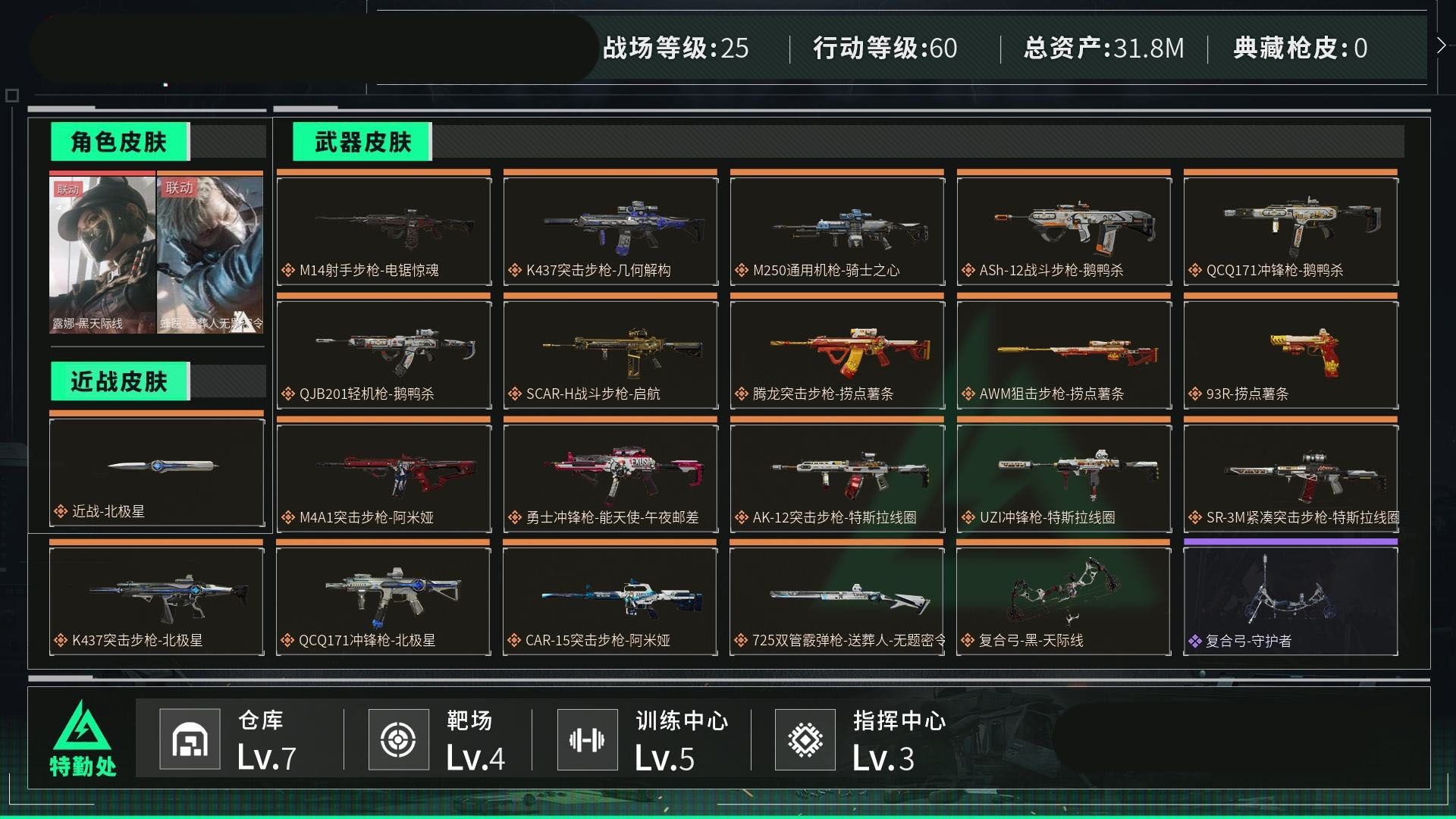 【账号佳】 胖16685战场等级:25 上等兵,行动等级:60 铂金【哈夫币】26w【总资产】31M【货币】22三角币/0曼德尔币/0三角券【安全箱】基础安全箱2(1x2)/进阶安全箱4(2x2)【通行证】通行证免费版【特勤处】制药台Lv.2/工作台Lv.2/仓库Lv.7/防具台Lv.3/训练中心Lv.5/靶场Lv.4/技术中心Lv.3/指挥中心Lv.3/潜水中心Lv.0/收藏室Lv.1【角色皮肤】露娜-黑天际线/蜂医-送葬人无题密令/【已拥有捆绑包】北极星捆绑包/捞点薯条捆绑包/特斯拉线圈捆绑包/鹅鸭杀捆绑包/【近战皮肤】近战-黑鹰/近战-北极星/【步枪皮肤】AUG突击步枪-蝮蛇/K437突击步枪-北极星/AS Val突击步枪-典狱官/腾龙突击步枪-无垢/SCAR-H战斗步枪-囚徒/M16A4突击步枪-竞赛选手/CAR-15突击步枪-阿米娅/M4A1突击步枪-阿米娅/腾龙突击步枪-捞点薯条/AK-12突击步枪-特斯拉线圈/ASh-12战斗步枪-鹅鸭杀/K437突击步枪-几何解构/SCAR-H战斗步枪-启航/【冲锋枪皮肤】SR-3M紧凑突击步枪-荒野求生/SR-3M紧凑突击步枪-特斯拉线圈/SR-3M紧凑突击步枪-战术竞备/UZI冲锋枪-特斯拉线圈/QCQ171冲锋枪-北极星/MP7冲锋枪-无垢/勇士冲锋枪-能天使-午夜邮差/P90冲锋枪-紧急戒备/MP7冲锋枪-守护者/勇士冲锋枪-工业狂潮/QCQ171冲锋枪-鹅鸭杀/MP5冲锋枪-战术竞备/【霰弹枪皮肤】725双管霰弹枪-送葬人-无题密令/【轻机枪皮肤】PKM通用机枪-蝮蛇/PKM通用机枪-荒野求生/M250通用机枪-囚徒/QJB201轻机枪-OldHabits/M250通用机枪-骑士之心/QJB201轻机枪-鹅鸭杀/【精准射手步枪皮肤】PSG-1射手步枪-无垢/M14射手步枪-电锯惊魂/【狙击步枪皮肤】SV-98狙击步枪-囚徒/M700狙击步枪-蝮蛇/SV-98狙击步枪-林中猎手/SVD狙击步枪-荒野求生/AWM狙击步枪-捞点薯【手枪皮肤】93R-捞点薯条/【特殊武器】复合弓-黑-天际线/复合弓-守护者/【挂饰】挂饰-枪匠/诡影狙击兵/诡影喷火兵/挂饰-大白鹅/挂饰-启程/挂饰-水墨云图/挂饰-北极星/阿萨拉霰弹兵/挂饰-晶石幻想/挂饰-阿米娅/挂饰-来点薯条/挂饰-能天使/挂饰-特斯拉线圈/阿萨拉徽章/紧急会议/崩岩重炮/【载具】M1A4坦克-烈焰/