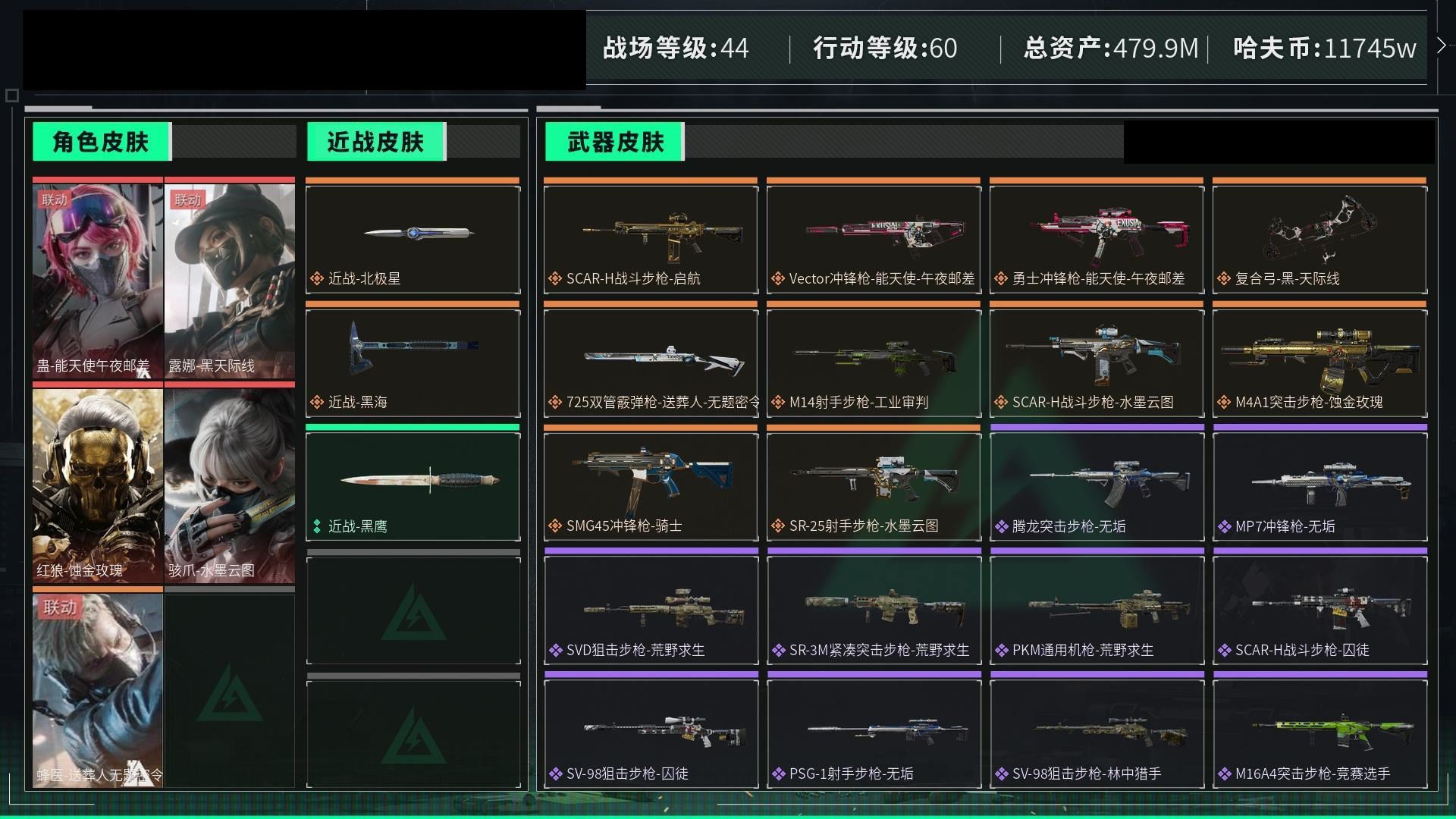 【账号佳】 惠3525857总资产479M,哈夫币11745w,枪皮数量157,战场等级:44 上等兵,行动等级:60 钻石,角色皮肤数量5,蛊-能天使午夜邮差/露娜-黑天际线/红狼【个人信息】战场等级:44 上等兵,行动等级:60 钻石【哈夫币】11745w【总资产】479M【货币】48三角币/60曼德尔币/80三角券【安全箱】基础安全箱2(1x2)【通行证】通行证免费版【特勤处】制药台Lv.3/工作台Lv.3/仓库Lv.9/防具台Lv.3/训练中心Lv.7/靶场Lv.7/技术中心Lv.3/指挥中心Lv.6/潜水中心Lv.3/收藏室Lv.2【角色皮肤】蛊-能天使午夜邮差/露娜-黑天际线/骇爪-水墨云图/红狼-蚀金玫瑰/蜂医-送葬人无题密令/【近战皮肤】近战-黑鹰/近战-黑海/近战-北极星/【步枪皮肤】M4A1突击步枪-蚀金玫瑰/QBZ95-1突击步枪-曙光/SCAR-H战斗步枪-水墨云图/SR-3M紧凑突击步枪-英雄/AUG突击步枪-蝮蛇/G3战斗步枪-战场英杰/M14射手步枪-禁卫/AKM突击步枪-林中猎手/M14射手步枪-工业审判/PTR-32突击步枪-英雄/腾龙突击步枪-无垢/SCAR-H战斗步枪-囚徒/M16A4突击步枪-竞赛选手/SR-3M紧凑突击步枪-荒野求生/SCAR-H战斗步枪-启航/【冲锋枪皮肤】Vector冲锋枪-阿萨拉文明/MP5冲锋枪-深海恐惧/勇士冲锋枪-深海恐惧/SMG45冲锋枪-骑士/MP7冲锋枪-无垢/勇士冲锋枪-能天使-午夜邮差/Vector冲锋枪-能天使-午夜邮差/【霰弹枪皮肤】S12K霰弹枪-曙光/M1014霰弹枪-林中猎手/725双管霰弹枪-送葬人-无题密令/【轻机枪皮肤】PKM通用机枪-蝮蛇/PKM通用机枪-英雄/PKM通用机枪-荒野求生/【精准射手步枪皮肤】SR-25射手步枪-水墨云图/SR-25射手步枪-战场英杰/PSG-1射手步枪-无垢/【狙击步枪皮肤】SVD狙击步枪-阿萨拉工艺/SV-98狙击步枪-囚徒/M700狙击步枪-蝮蛇/SVD狙击步枪-暗夜猎手/SV-98狙击步枪-林中猎手/SVD狙击步枪-荒野求生/【手枪皮肤】沙漠之鹰-曙光/QSZ92G-风林火山/93R-博士/【特殊武器】复合弓-黑-天际线/【挂饰】挂饰-枪匠/挂饰-维什戴尔/挂饰-启程/挂饰-水墨云图/挂饰-蚀金玫瑰/持盾者/持剑者/挂饰-Relink/雄狮之盾/演出导演/重装记者/挂饰-彩蛋/乐队纪念/阿萨拉霰弹兵/阿萨拉狙击兵/挂饰-晶石幻想/挂饰-能天使/阿萨拉徽章/【载具】突击直升机-狮王/(典藏皮肤颜色请以典藏展示为准,安全箱等时效性道具请以游戏内数据为准)