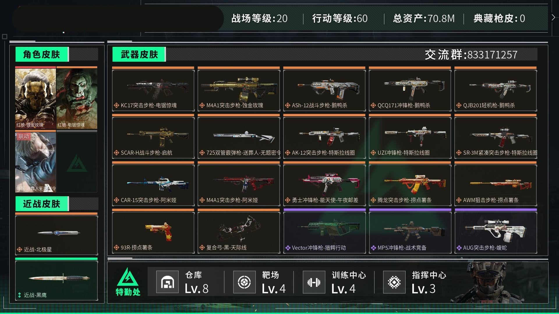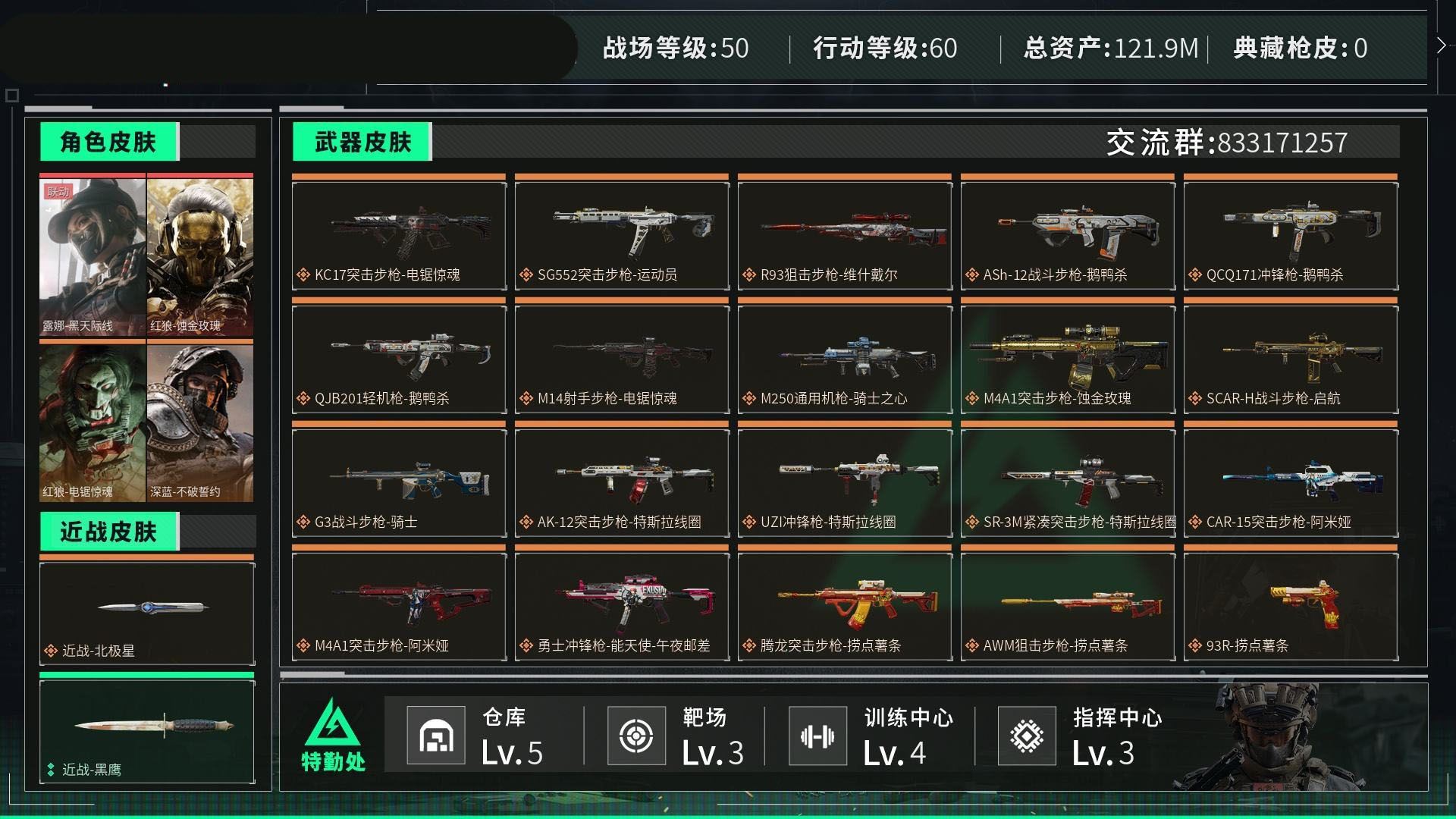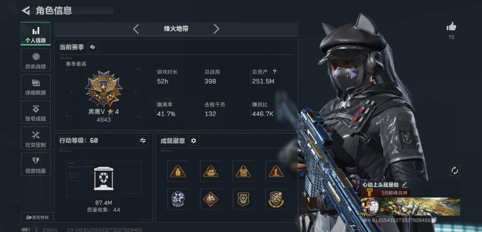 【账号佳】 R46220 可二次 QQ 《行动等级60》《总资产251.5M》《战场等级40》《仓库8 指挥中心3 训练中心6 靶场6 潜水中心1 收藏室1》《黑鹰》《M4A1突击步枪金蚀玫瑰 M4A1突击步枪阿米娅 ASh12战斗步枪鹅鸭杀 手中剑为屠龙剑 AK12突击步枪特斯拉线圈 SCARH战斗步枪启航 G3战斗步枪骑士 CAR15突击步枪阿米娅 腾龙突击步枪捞点薯条 KC17突击步枪电锯惊魂 UZI冲锋枪特斯拉线圈 SR3M紧凑突击步枪特斯拉线圈 勇士冲锋枪能天使午夜邮差 QCQ171冲锋枪鹅鸭杀 725双管霰弹枪送葬人无题密令 M250通用机抢骑士之心 QJB201轻机枪鹅鸭杀 M700狙击步枪创意工坊 AWM狙击枪捞点薯条 93R捞点薯条 复合弓黑天际线》《红狼蚀金玫瑰 蜂医送葬人无题密令 深蓝不破誓约 露娜黑天际线》各种道具详情看截图、低价出售找回包 赔、截图展示段位不带表实际段位,如赛季更新等不可抗拒因素发生变化、时限道具不保证所剩时间、标题未写送点券默认不送【卖号买号首选亿梦】