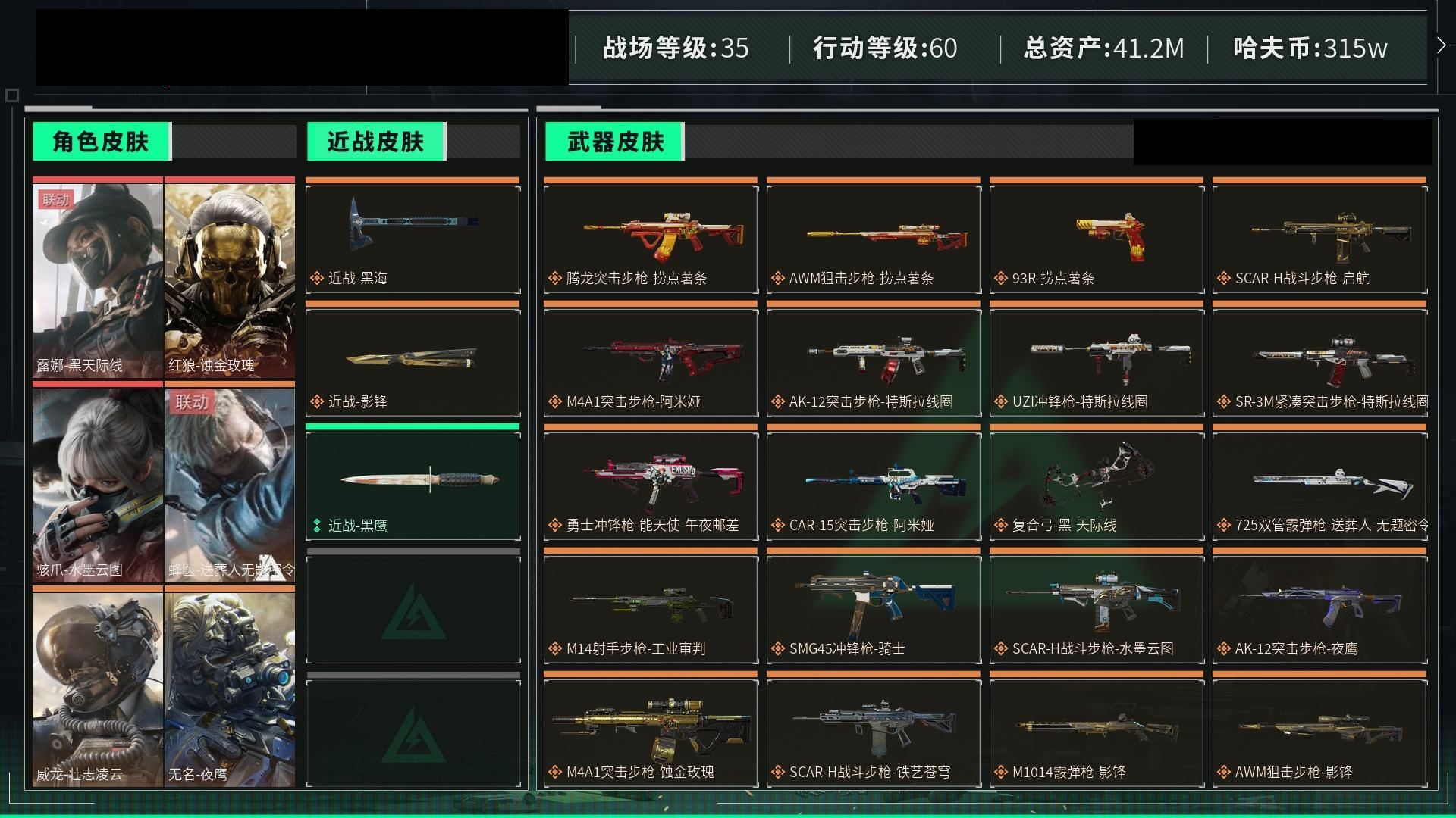 【账号佳】 惠3995032总资产41M,哈夫币315w,枪皮数量199,战场等级:35 上等兵,行动等级:60 钻石,角色皮肤数量6,露娜-黑天际线/红狼-蚀金玫瑰/骇爪-水墨云图【个人信息】战场等级:35 上等兵,行动等级:60 钻石【哈夫币】315w【总资产】41M【货币】28三角币/14曼德尔币/0三角券【安全箱】基础安全箱2(1x2)【通行证】通行证免费版【特勤处】制药台Lv.3/工作台Lv.3/仓库Lv.5/防具台Lv.3/训练中心Lv.5/靶场Lv.3/技术中心Lv.3/指挥中心Lv.5/潜水中心Lv.0/收藏室Lv.0【角色皮肤】露娜-黑天际线/骇爪-水墨云图/红狼-蚀金玫瑰/威龙-壮志凌云/无名-夜鹰/蜂医-送葬人无题密令/【已拥有捆绑包】影锋捆绑包/捞点薯条捆绑包/特斯拉线圈捆绑包/【近战皮肤】近战-黑鹰/近战-影锋/近战-黑海/【步枪皮肤】M4A1突击步枪-蚀金玫瑰/QBZ95-1突击步枪-曙光/AS Val突击步枪-刀锋/SCAR-H战斗步枪-铁艺苍穹/SCAR-H战斗步枪-水墨云图/SR-3M紧凑突击步枪-英雄/QBZ95-1突击步枪-ACE/AUG突击步枪-蝮蛇/G3战斗步枪-战场英杰/AUG突击步枪-特勤执行/M4A1突击步枪-特勤执行/PTR-32突击步枪-ACE/AK-12突击步枪-夜鹰/SG552突击步枪-深海恐惧/SG552突击步枪-尖端治疗/AS Val突击步枪-尖端治疗/ASh-12战斗步枪-守夜人/AKM突击步枪-林中猎手/M14射手步枪-工业审判/PTR-32突击步枪-英雄/腾龙突击步枪-无垢/SCAR-H战斗步枪-囚徒/M16A4突击步枪-竞赛选手/SR-3M紧凑突击步枪-荒野求生/CAR-15突击步枪-阿米娅/M4A1突击步枪-阿米娅/腾龙突击步枪-捞点薯条/AK-12突击步枪-特斯拉线圈/SR-3M紧凑突击步枪-特斯拉线圈/SCAR-H战斗步枪-启航/【冲锋枪皮肤】UZI冲锋枪-特斯拉线圈/Vector冲锋枪-阿萨拉文明/Vector冲锋枪-红色彗星/MP5冲锋枪-深海恐惧/勇士冲锋枪-深海恐惧/SMG45冲锋枪-骑士/MP7冲锋枪-无垢/勇士冲锋枪-能天使-午夜邮差/勇士冲锋枪-工业狂潮/【霰弹枪皮肤】S12K霰弹枪-曙光/M1014霰弹枪-影锋/M1014霰弹枪-林中猎手/725双管霰弹枪-送葬人-无题密令/【轻机枪皮肤】PKM通用机枪-蝮蛇/PKM通用机枪-英雄/PKM通用机枪-守夜人/PKM通用机枪-荒野求生/M250通用机枪-囚徒/QJB201轻机枪-OldHabits/【精准射手步枪皮肤】SR-25射手步枪-水墨云图/SKS射手步枪-ACE/M14射手步枪-黑鹰坠落/SR-25射手步枪-尖端治疗/PSG-1射手步枪-无垢/【狙击步枪皮肤】SVD狙击步枪-阿萨拉工艺/M700狙击步枪-竞技风/SV-98狙击步枪-囚徒/AWM狙击步枪-影锋/M700狙击步枪-蝮蛇/SVD狙击步枪-暗夜猎手/M700狙击步枪-守夜人/SV-98狙击步枪-林中猎手/SVD狙击步枪-荒野求生/AWM狙击步枪-捞点薯条/【手枪皮肤】沙漠之鹰-曙光/QSZ92G-风林火山/93R-博士/93R-捞点薯条/【特殊武器】复合弓-黑-天际线/【挂饰】挂饰-黄金坦克/挂饰-三联装手炮/挂饰-枪匠/挂饰-影锋/诡影狙击兵/诡影喷火兵/挂饰-启程/挂饰-水墨云图/挂饰-蚀金玫瑰/挂饰-王牌座驾/挂饰-Relink/挂饰-小羊/阿萨拉盾兵/阿萨拉霰弹兵/挂饰-晶石幻想/挂饰-阿米娅/挂饰-来点薯条/挂饰-特斯拉线圈/阿萨拉徽章/紧急会议/【载具】M1A4坦克-黑骑士/步战车-黑骑士/步战车-卦象/防空车-黑骑士/防空车-卦象/突击直升机-黑骑士/侦察直升机-卦象/(典藏皮肤颜色请以典藏展示为准,安全箱等时效性道具请以游戏内数据为准)