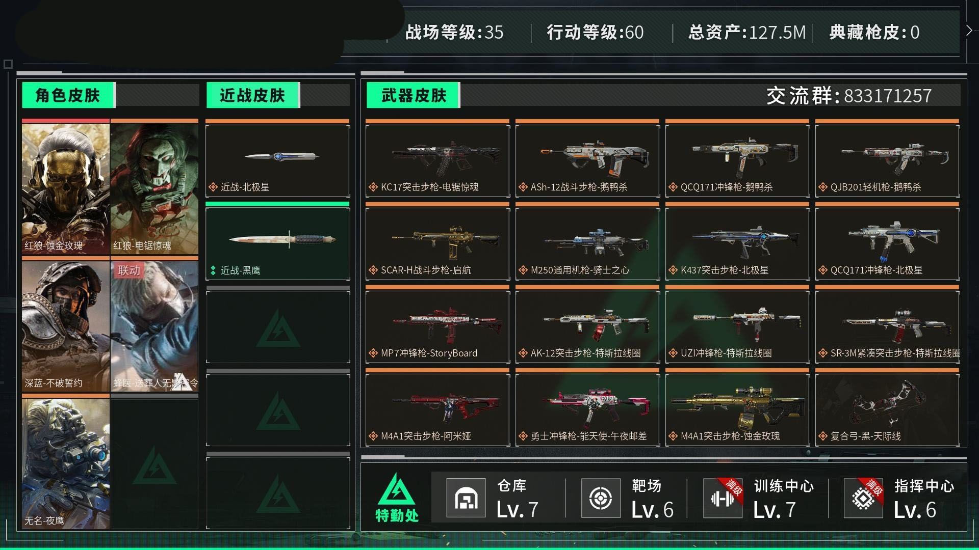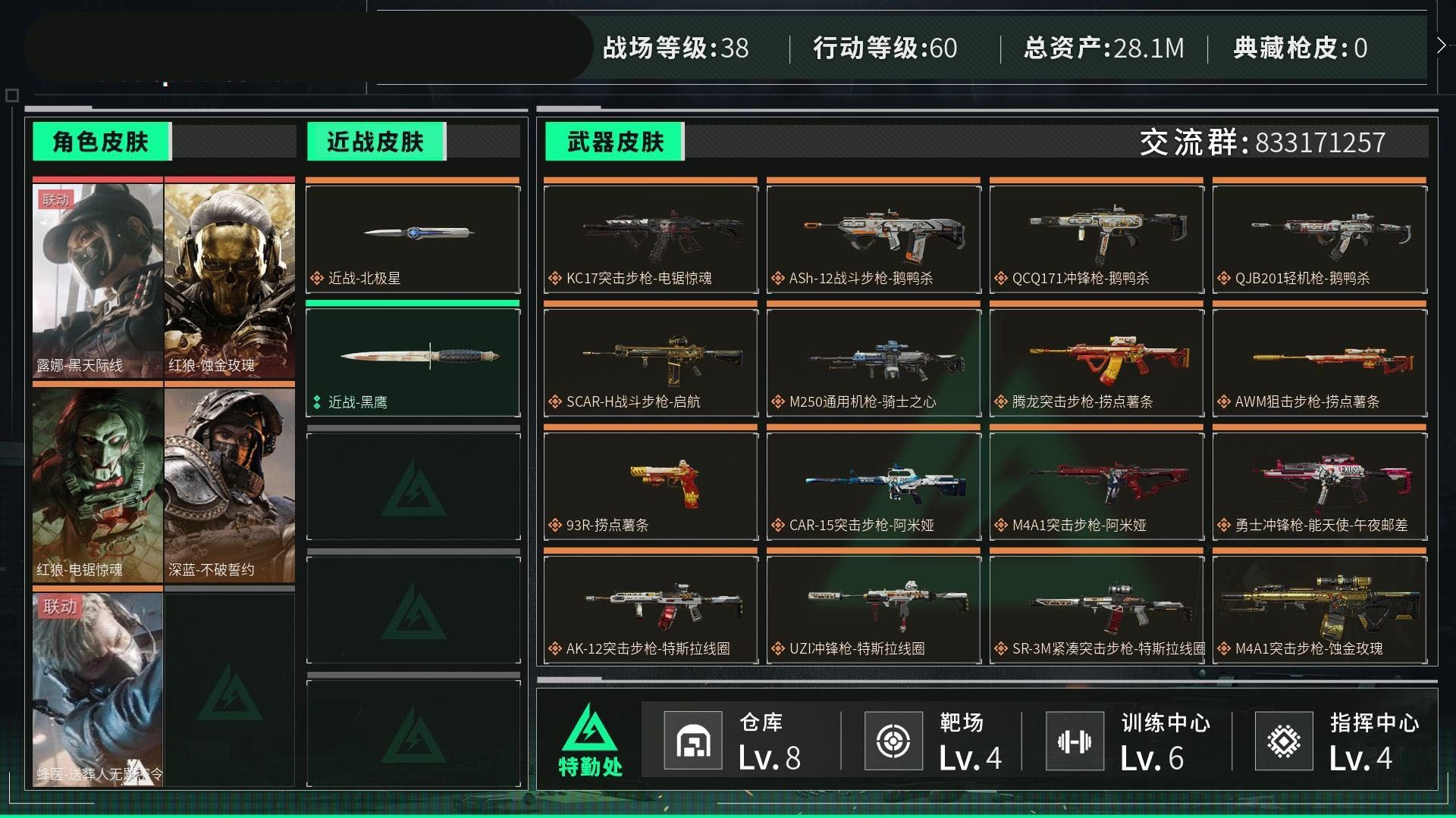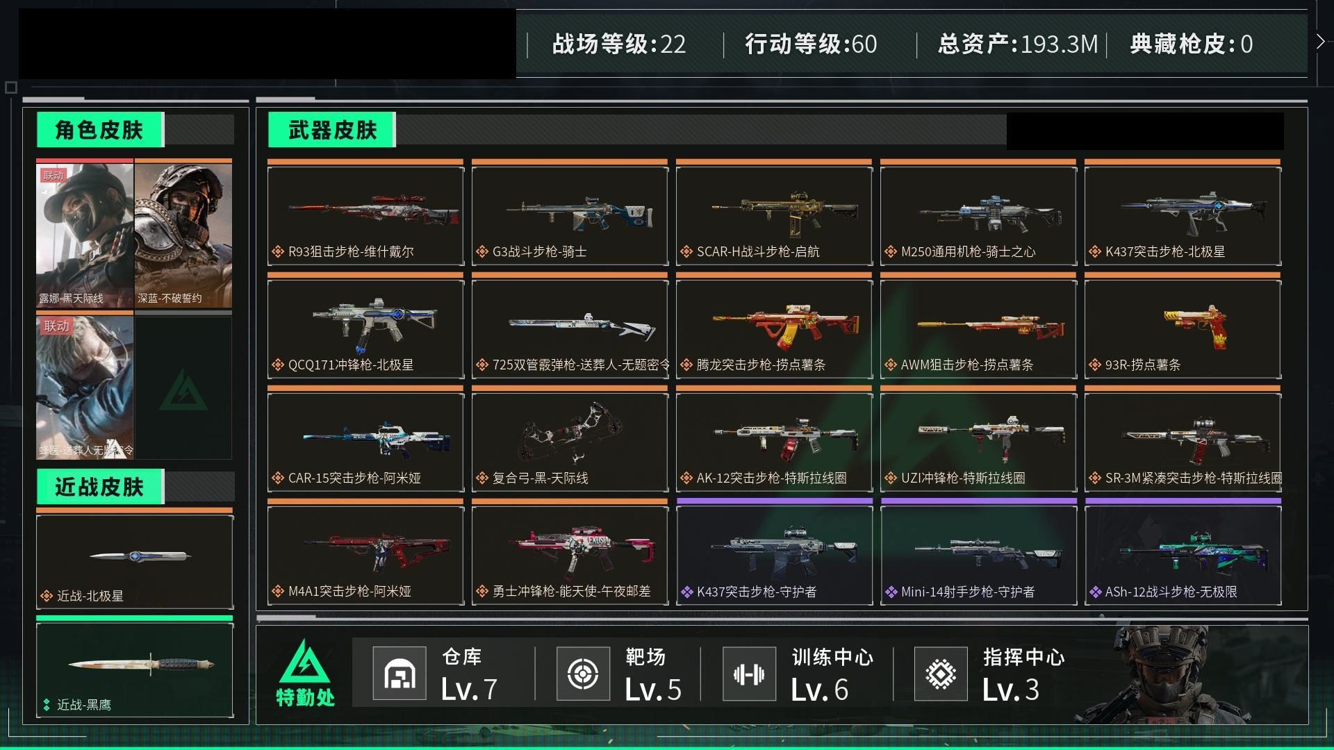【账号佳】 惠3695839总资产193M,哈夫币463w,近战2,枪皮数量135,战场等级:22 上等兵,行动等级:60 黑鹰,角色皮肤数量3,露娜-黑天际线/深蓝-不破誓约/蜂医-送葬【个人信息】战场等级:22 上等兵,行动等级:60 _黑鹰【哈夫币】463w【总资产】193M【货币】1150三角币/0曼德尔币/374三角券【安全箱】基础安全箱2(1x2)/S6高级安全箱6(2x3)【通行证】烽火地带限定版【特勤处】制药台Lv.3/工作台Lv.3/仓库Lv.7/防具台Lv.3/训练中心Lv.6/靶场Lv.5/技术中心Lv.3/指挥中心Lv.3/潜水中心Lv.1/收藏室Lv.1【角色皮肤】露娜-黑天际线/蜂医-送葬人无题密令/深蓝-不破誓约/【已拥有捆绑包】北极星捆绑包/捞点薯条捆绑包/特斯拉线圈捆绑包/【近战皮肤】近战-黑鹰/近战-北极星/【步枪皮肤】AUG突击步枪-蝮蛇/SG552突击步枪-深海恐惧/K437突击步枪-北极星/AS Val突击步枪-典狱官/腾龙突击步枪-无垢/SCAR-H战斗步枪-囚徒/M16A4突击步枪-竞赛选手/SR-3M紧凑突击步枪-荒野求生/CAR-15突击步枪-阿米娅/M4A1突击步枪-阿米娅/腾龙突击步枪-捞点薯条/AK-12突击步枪-特斯拉线圈/SR-3M紧凑突击步枪-特斯拉线圈/K437突击步枪-守护者/ASh-12战斗步枪-无极限/G3战斗步枪-骑士/SCAR-H战斗步枪-启航/SR-3M紧凑突击步枪-战术竞备/【冲锋枪皮肤】UZI冲锋枪-特斯拉线圈/QCQ171冲锋枪-北极星/MP7冲锋枪-无垢/勇士冲锋枪-能天使-午夜邮差/P90冲锋枪-紧急戒备/MP7冲锋枪-守护者/勇士冲锋枪-工业狂潮/MP5冲锋枪-战术竞备/【霰弹枪皮肤】725双管霰弹枪-送葬人-无题密令/【轻机枪皮肤】PKM通用机枪-蝮蛇/PKM通用机枪-荒野求生/M250通用机枪-囚徒/QJB201轻机枪-OldHabits/M250通用机枪-骑士之心/【精准射手步枪皮肤】PSG-1射手步枪-无垢/Mini-14射手步枪-守护者/【狙击步枪皮肤】SV-98狙击步枪-囚徒/R93狙击步枪-维什戴尔/SV-98狙击步枪-林中猎手/SVD狙击步枪-荒野求生/AWM狙击步枪-捞点薯条/【手枪皮肤】沙漠之鹰-曙光/93R-捞点薯条/【特殊武器】复合弓-黑-天际线/复合弓-守护者/【挂饰】麦小鼠/诡影狙击兵/诡影喷火兵/挂饰-骑士之心/挂饰-维什戴尔/挂饰-启程/挂饰-蚀金玫瑰/挂饰-北极星/挂饰-晶石幻想/挂饰-阿米娅/挂饰-来点薯条/挂饰-特斯拉线圈/紧急会议/(典藏皮肤颜色请以典藏展示为准,安全箱等时效性道具请以游戏内数据为准)