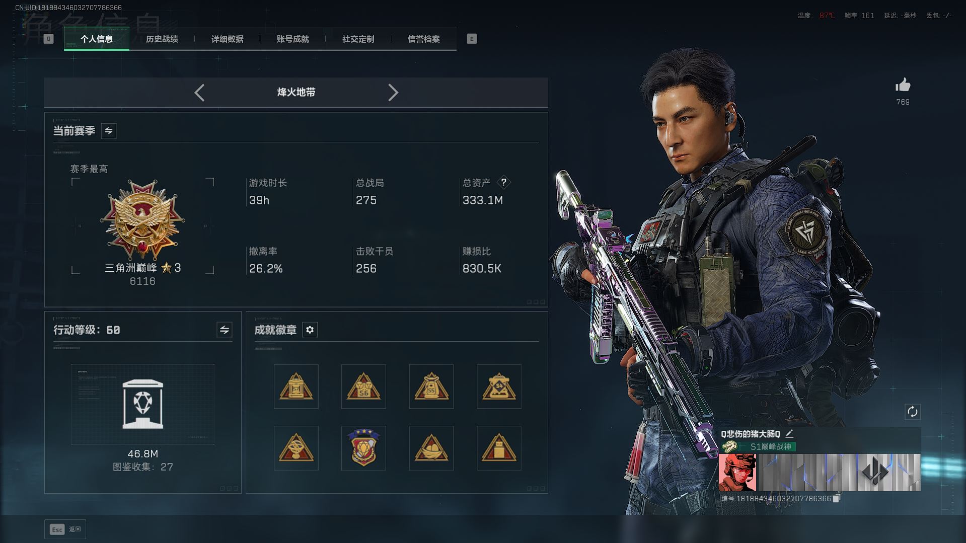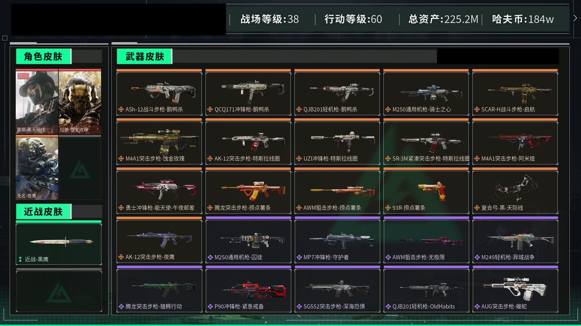【账号佳】 惠3917025总资产225M,哈夫币184w,枪皮数量153,战场等级:38 军士长,行动等级:60 黑鹰,角色皮肤数量3,露娜-黑天际线/红狼-蚀金玫瑰/无名-夜鹰【个人信息】战场等级:38 军士长,行动等级:60 _黑鹰【哈夫币】184w【总资产】225M【货币】60三角币/0曼德尔币/43三角券【安全箱】基础安全箱2(1x2)/S6高级安全箱6(2x3)【通行证】烽火地带限定版【特勤处】制药台Lv.3/工作台Lv.3/仓库Lv.8/防具台Lv.3/训练中心Lv.7/靶场Lv.7/技术中心Lv.3/指挥中心Lv.6/潜水中心Lv.1/收藏室Lv.1【仓库】海洋之泪/【角色皮肤】露娜-黑天际线/红狼-蚀金玫瑰/无名-夜鹰/【已拥有捆绑包】捞点薯条捆绑包/特斯拉线圈捆绑包/【近战皮肤】近战-黑鹰/【步枪皮肤】M4A1突击步枪-蚀金玫瑰/AUG突击步枪-蝮蛇/AK-12突击步枪-夜鹰/SG552突击步枪-深海恐惧/SG552突击步枪-尖端治疗/AS Val突击步枪-尖端治疗/ASh-12战斗步枪-守夜人/AKM突击步枪-林中猎手/PTR-32突击步枪-英雄/SCAR-H战斗步枪-囚徒/M16A4突击步枪-竞赛选手/M4A1突击步枪-阿米娅/腾龙突击步枪-捞点薯条/AK-12突击步枪-特斯拉线圈/SR-3M紧凑突击步枪-特斯拉线圈/腾龙突击步枪-猎鳄行动/ASh-12战斗步枪-鹅鸭杀/SCAR-H战斗步枪-启航/SR-3M紧凑突击步枪-战术竞备/【冲锋枪皮肤】UZI冲锋枪-特斯拉线圈/Vector冲锋枪-阿萨拉文明/勇士冲锋枪-深海恐惧/勇士冲锋枪-能天使-午夜邮差/P90冲锋枪-紧急戒备/MP7冲锋枪-守护者/勇士冲锋枪-工业狂潮/QCQ171冲锋枪-鹅鸭杀/【霰弹枪皮肤】M1014霰弹枪-林中猎手/【轻机枪皮肤】PKM通用机枪-守夜人/M250通用机枪-囚徒/QJB201轻机枪-OldHabits/M249轻机枪-异域战争/M250通用机枪-骑士之心/QJB201轻机枪-鹅鸭杀/【精准射手步枪皮肤】M14射手步枪-黑鹰坠落/SR-25射手步枪-尖端治疗/【狙击步枪皮肤】M700狙击步枪-竞技风/SV-98狙击步枪-囚徒/SVD狙击步枪-暗夜猎手/M700狙击步枪-守夜人/SV-98狙击步枪-林中猎手/AWM狙击步枪-捞点薯条/【手枪皮肤】沙漠之鹰-曙光/.357左轮-幸运时刻/93R-捞点薯条/【特殊武器】复合弓-黑-天际线/【挂饰】挂饰-枪匠/诡影狙击兵/诡影喷火兵/挂饰-大白鹅/挂饰-启程/挂饰-水墨云图/挂饰-蚀金玫瑰/低音艺术家/演出导演/重装记者/挂饰-小羊/挂饰-彩蛋/乐队纪念/阿萨拉霰弹兵/阿萨拉狙击兵/挂饰-阿米娅/挂饰-来点薯条/挂饰-特斯拉线圈/阿萨拉徽章/紧急会议/【载具】侦察直升机-烈焰/(典藏皮肤颜色请以典藏展示为准,安全箱等时效性道具请以游戏内数据为准)