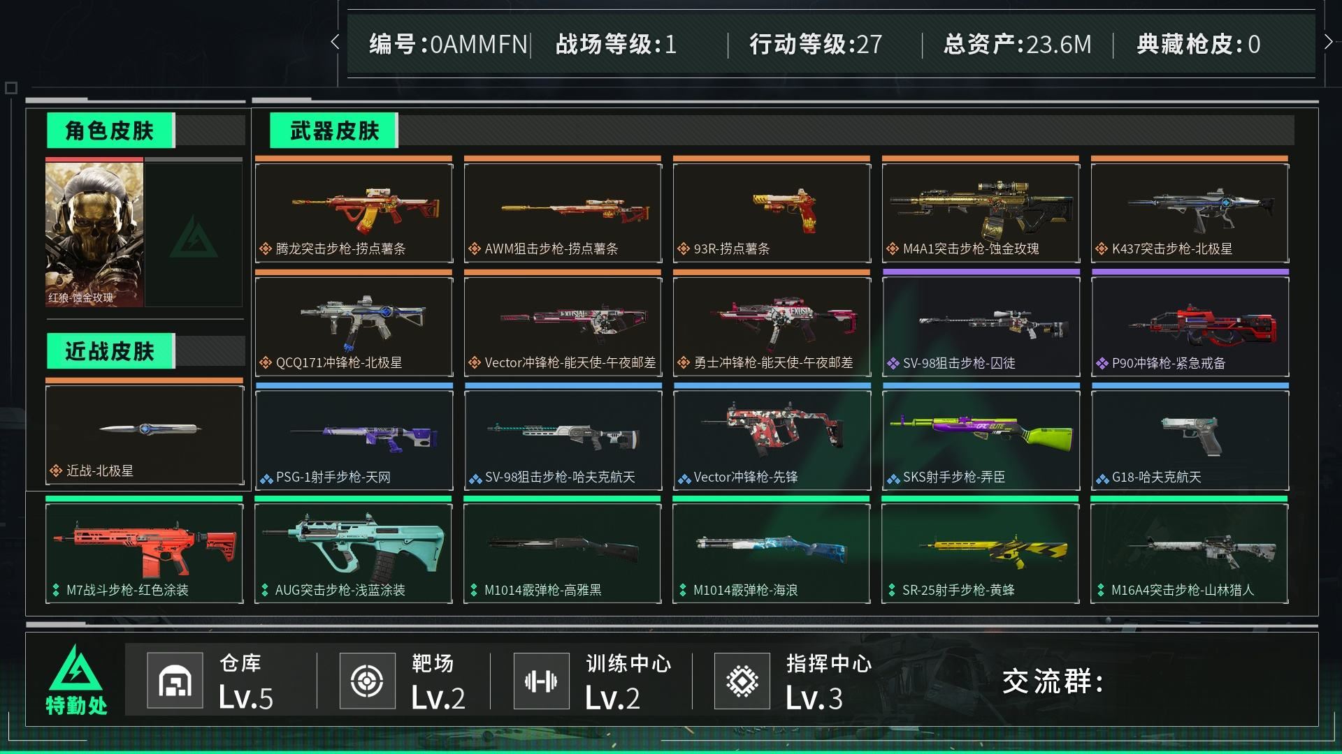 【账号佳】 胖12575战场等级:1 无军衔,行动等级:27 白银【哈夫币】1032w【总资产】23M【货币】30三角币/0曼德尔币/0三角券【安全箱】基础安全箱2(1x2)【通行证】通行证免费版【特勤处】制药台Lv.2/工作台Lv.2/仓库Lv.5/防具台Lv.2/训练中心Lv.2/靶场Lv.2/技术中心Lv.2/指挥中心Lv.3/潜水中心Lv.0/收藏室Lv.0【仓库】338AP/【角色皮肤】红狼-蚀金玫瑰/【已拥有捆绑包】北极星捆绑包/捞点薯条捆绑包/【近战皮肤】近战-黑鹰/近战-北极星/【步枪皮肤】M4A1突击步枪-蚀金玫瑰/K437突击步枪-北极星/腾龙突击步枪-捞点薯条/【冲锋枪皮肤】QCQ171冲锋枪-北极星/勇士冲锋枪-能天使-午夜邮差/Vector冲锋枪-能天使-午夜邮差/P90冲锋枪-紧急戒备/【狙击步枪皮肤】SV-98狙击步枪-囚徒/AWM狙击步枪-捞点薯条/【手枪皮肤】93R-捞点薯条/【挂饰】诡影狙击兵/挂饰-蚀金玫瑰/挂饰-北极星/阿萨拉霰弹兵/阿萨拉狙击兵/挂饰-来点薯条/阿萨拉徽章/紧急会议/