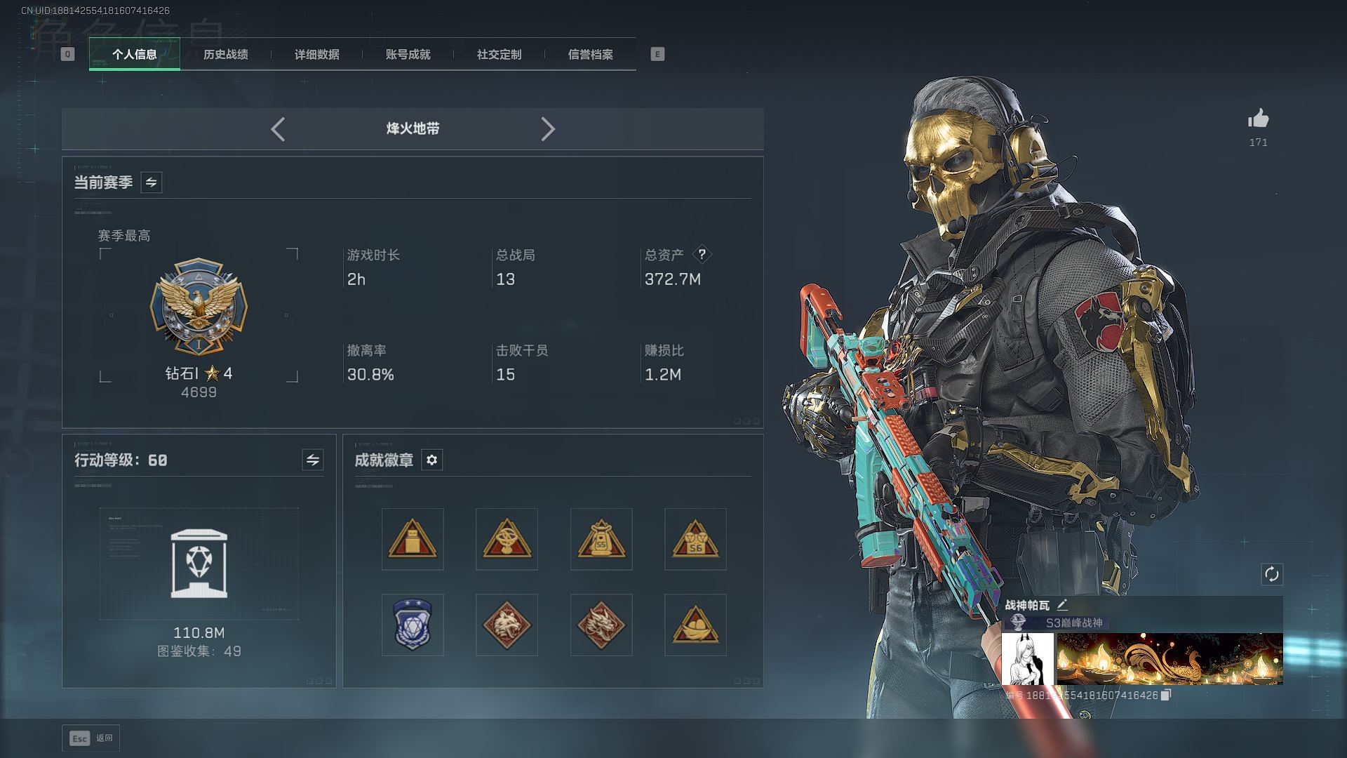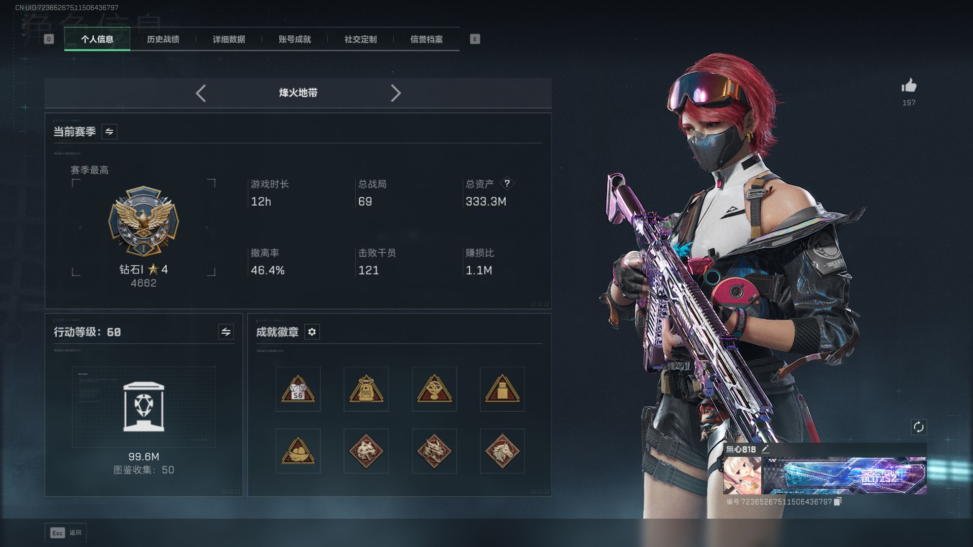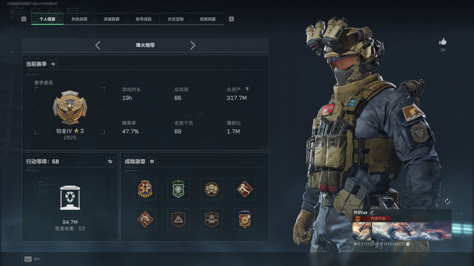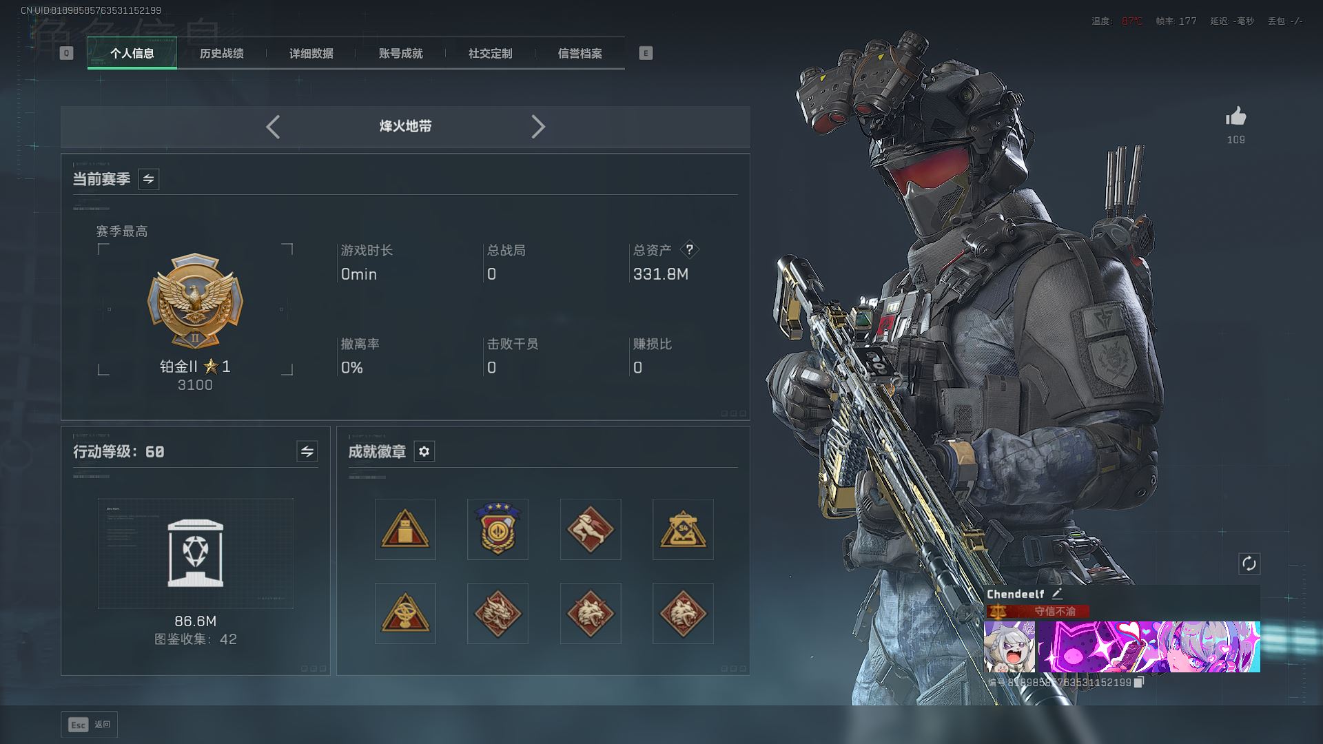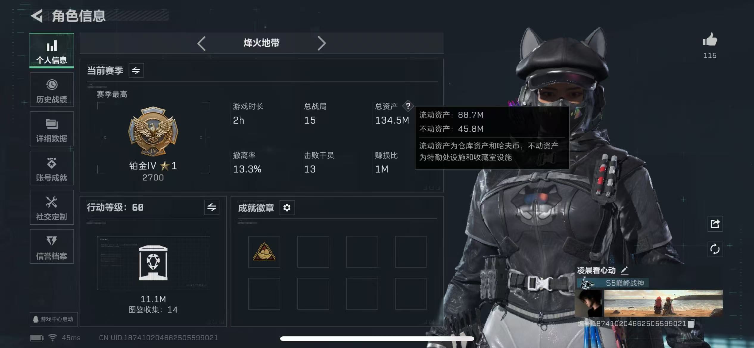 【账号佳】 总资产47M,哈夫币15w,近战2,枪皮数量237,战场等级:14 列兵,行动等级:60 铂金,角色皮肤数量7,蛊-能天使午夜邮差/露娜-黑天际线/红狼-蚀金玫瑰/蜂医-送葬人无题密令/牧羊人-街头之王/威龙-壮志凌云/无名-夜鹰,近战-影锋/近战-黑鹰,安全箱等时效性道具请以游戏内数据为准;详情请看图