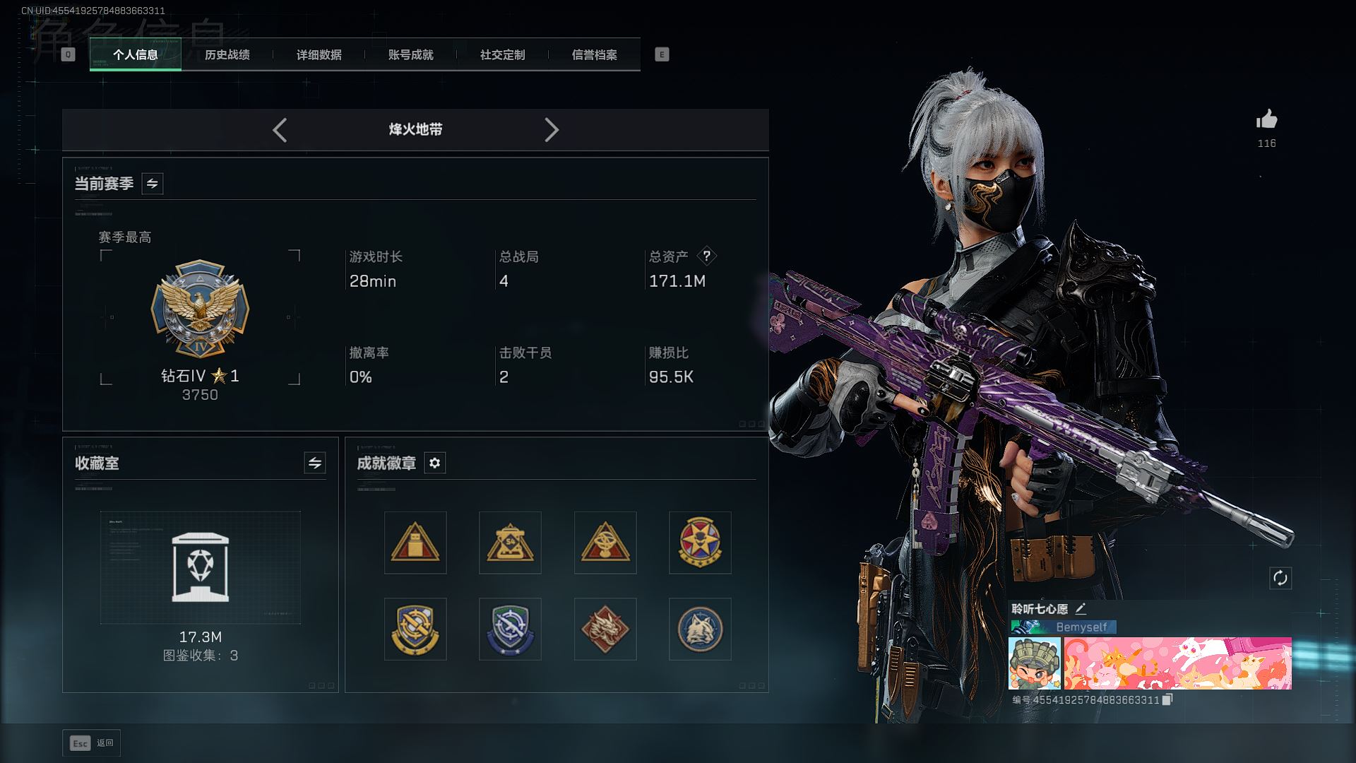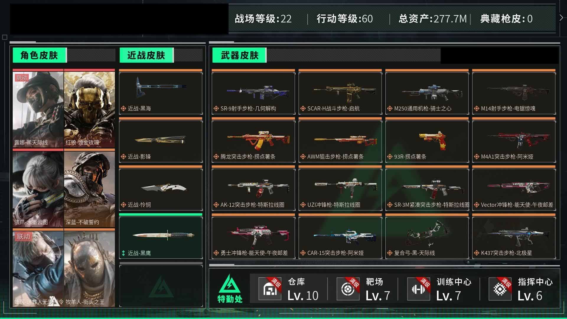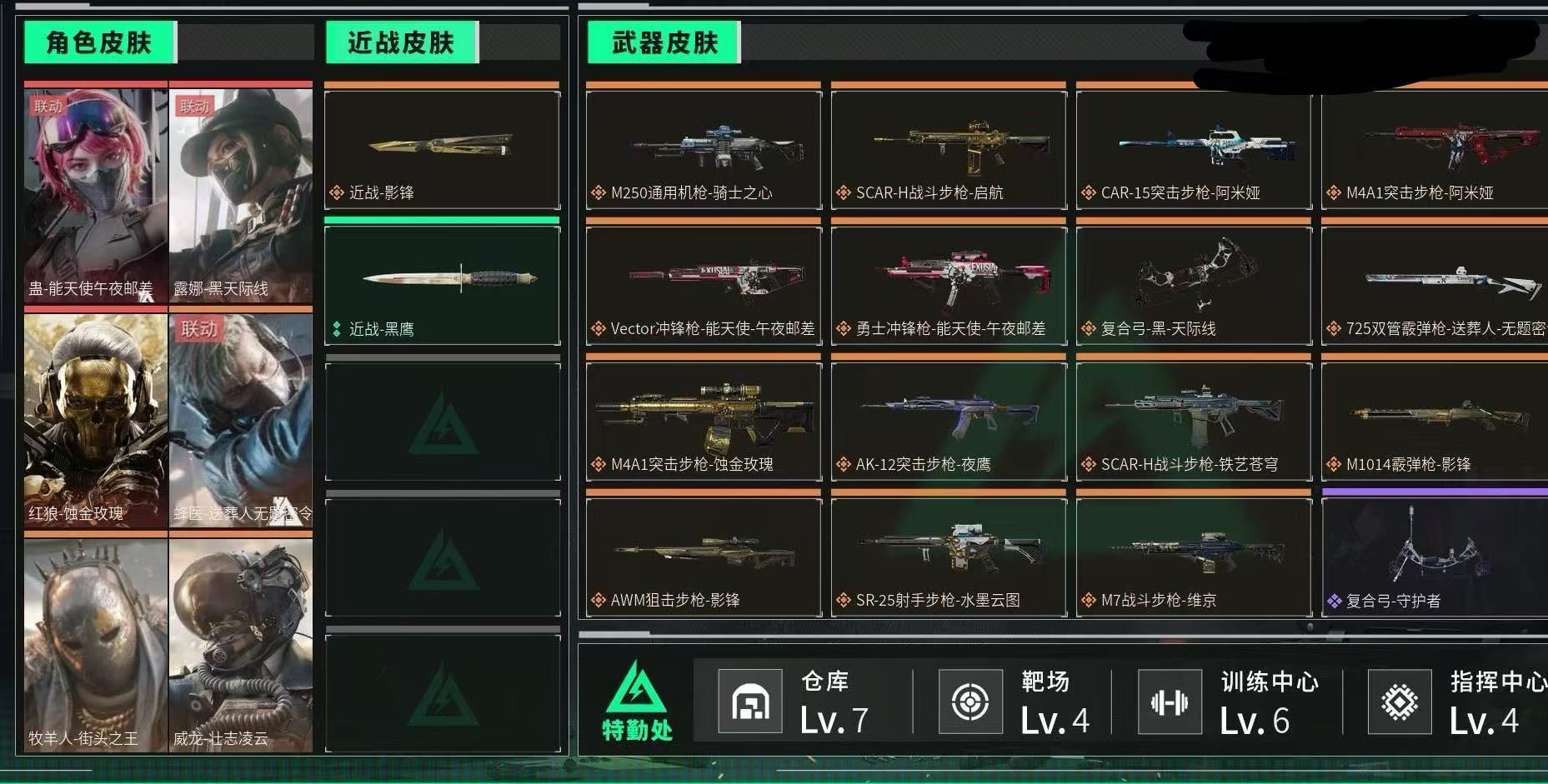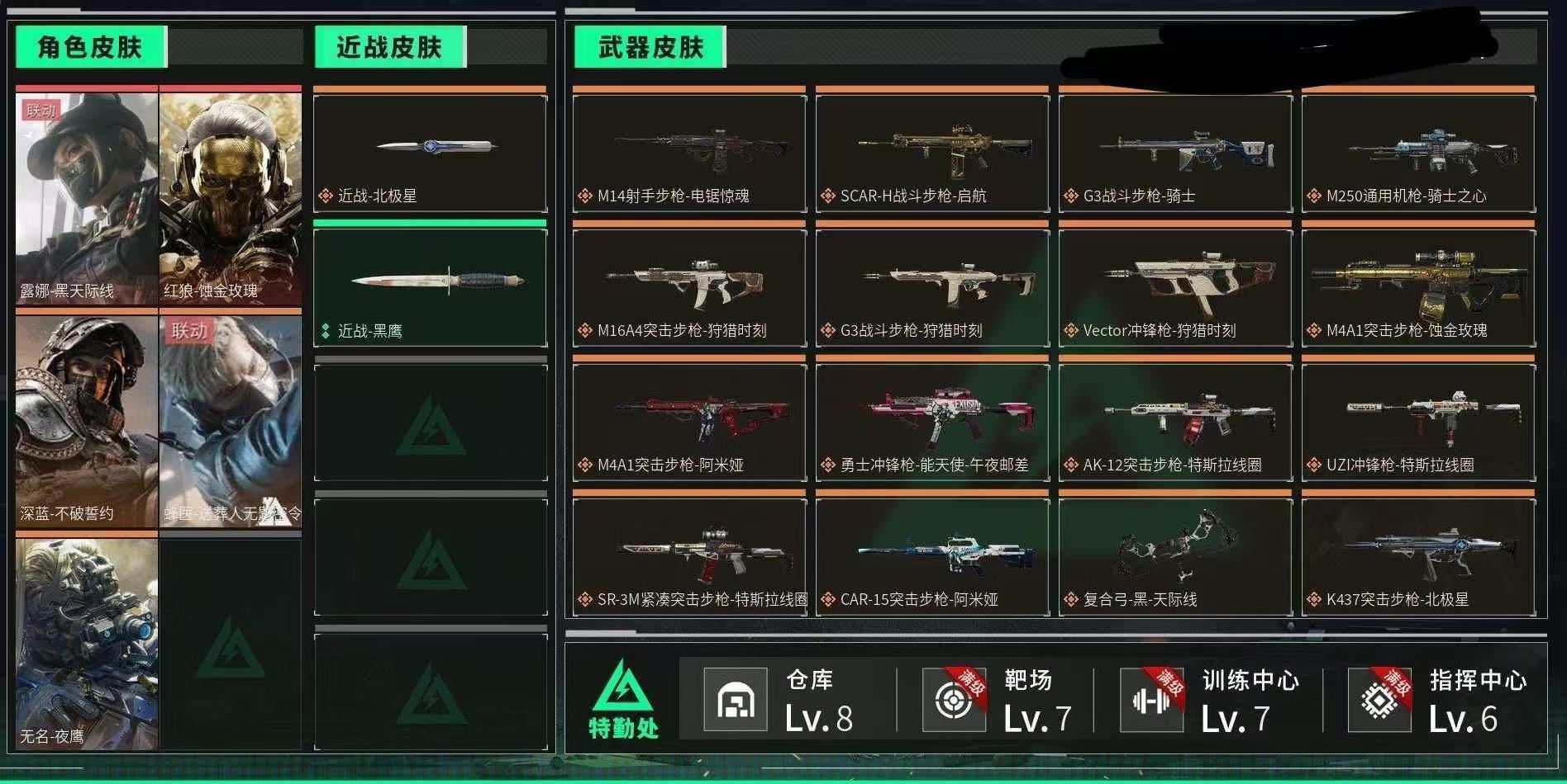 【账号佳】 惠3338724总资产277M,哈夫币982w,近战4,枪皮数量281,战场等级:22 上等兵,行动等级:60 黑鹰,角色皮肤数量8,露娜-黑天际线/红狼-蚀金玫瑰/骇爪【个人信息】战场等级:22 上等兵,行动等级:60 _黑鹰【哈夫币】982w【总资产】277M【货币】47三角币/10曼德尔币/10163三角券【安全箱】基础安全箱2(1x2)/S6高级安全箱6(2x3)【通行证】烽火地带限定版【特勤处】制药台Lv.3/工作台Lv.3/仓库Lv.10/防具台Lv.3/训练中心Lv.7/靶场Lv.7/技术中心Lv.3/指挥中心Lv.6/潜水中心Lv.3/收藏室Lv.2【仓库】338AP/【角色皮肤】露娜-黑天际线/骇爪-水墨云图/红狼-蚀金玫瑰/威龙-壮志凌云/牧羊人-街头之王/无名-夜鹰/蜂医-送葬人无题密令/深蓝-不破誓约/【已拥有捆绑包】怜悯捆绑包/影锋捆绑包/幻想曲捆绑包/捞点薯条捆绑包/特斯拉线圈捆绑包/【近战皮肤】近战-怜悯/近战-黑鹰/近战-影锋/近战-黑海/【步枪皮肤】M4A1突击步枪-蚀金玫瑰/ASh-12战斗步枪-怜悯/M7战斗步枪-怜悯/M7战斗步枪-维京/QBZ95-1突击步枪-曙光/SCAR-H战斗步枪-危险实验/SCAR-H战斗步枪-铁艺苍穹/SCAR-H战斗步枪-水墨云图/SR-3M紧凑突击步枪-英雄/QBZ95-1突击步枪-ACE/AUG突击步枪-蝮蛇/G3战斗步枪-战场英杰/AUG突击步枪-特勤执行/M4A1突击步枪-特勤执行/PTR-32突击步枪-ACE/AK-12突击步枪-夜鹰/SG552突击步枪-深海恐惧/SG552突击步枪-尖端治疗/AS Val突击步枪-尖端治疗/ASh-12战斗步枪-守夜人/AKM突击步枪-林中猎手/K416突击步枪-幻想曲/G3战斗步枪-幻想曲/PTR-32突击步枪-英雄/K437突击步枪-北极星/AS Val突击步枪-典狱官/腾龙突击步枪-无垢/SCAR-H战斗步枪-囚徒/M16A4突击步枪-竞赛选手/SR-3M紧凑突击步枪-荒野求生/CAR-15突击步枪-阿米娅/M4A1突击步枪-阿米娅/腾龙突击步枪-捞点薯条/AK-12突击步枪-特斯拉线圈/SR-3M紧凑突击步枪-特斯拉线圈/PTR-32突击步枪-OldHabits/腾龙突击步枪-猎鳄行动/K437突击步枪-守护者/ASh-12战斗步枪-无极限/SCAR-H战斗步枪-启航/SR-3M紧凑突击步枪-战术竞备/【冲锋枪皮肤】UZI冲锋枪-特斯拉线圈/Vector冲锋枪-阿萨拉文明/UZI冲锋枪-危险实验/Vector冲锋枪-红色彗星/MP5冲锋枪-深海恐惧/勇士冲锋枪-深海恐惧/SMG-45冲锋枪-骑士/MP7冲锋枪-无垢/勇士冲锋枪-能天使-午夜邮差/Vector冲锋枪-能天使-午夜邮差/P90冲锋枪-紧急戒备/Vector冲锋枪-猎鳄行动/MP7冲锋枪-守护者/勇士冲锋枪-工业狂潮/MP5冲锋枪-战术竞备/【霰弹枪皮肤】S12K霰弹枪-曙光/M1014霰弹枪-影锋/M1014霰弹枪-潜袭者/M1014霰弹枪-林中猎手/S12K霰弹枪-幻想曲/725双管霰弹枪-送葬人-无题密令/【轻机枪皮肤】M249轻机枪-维京/PKM通用机枪-蝮蛇/PKM通用机枪-英雄/PKM通用机枪-守夜人/PKM通用机枪-荒野求生/M250通用机枪-囚徒/QJB201轻机枪-OldHabits/M249轻机枪-异域战争/M250通用机枪-骑士之心/【精准射手步枪皮肤】SR-25射手步枪-水墨云图/SKS射手步枪-ACE/PSG-1射手步枪-原型机/SR-25射手步枪-尖端治疗/PSG-1射手步枪-无垢/M14射手步枪-电锯惊魂/Mini-14射手步枪-守护者/SR-9射手步枪-几何解构/【狙击步枪皮肤】SVD狙击步枪-阿萨拉工艺/SV-98狙击步枪-囚徒/AWM狙击步枪-影锋/M700狙击步枪-蝮蛇/SVD狙击步枪-暗夜猎手/M700狙击步枪-守夜人/SV-98狙击步枪-林中猎手/SVD狙击步枪-荒野求生/AWM狙击步枪-捞点薯条/SV-98狙击步枪-猎鳄行动/【手枪皮肤】沙漠之鹰-曙光/QSZ92G-风林火山/93R-博士/93R-捞点薯条/【特殊武器】复合弓-黑-天际线/复合弓-守护者/【挂饰】毁灭之源(A)/挂饰-怜悯/王国利刃/白王后/王国之杖/慵懒魔女/挂饰-影锋/诡影喷火兵/挂饰-骑士之心/挂饰-启程/挂饰-水墨云图/挂饰-蚀金玫瑰/挂饰-王牌座驾/挂饰-维京/低音艺术家/挂饰-小羊/挂饰-彩蛋/挂饰-幻想曲/阿萨拉机枪兵/阿萨拉盾兵/挂饰-晶石幻想/挂饰-阿米娅/挂饰-来点薯条/挂饰-特斯拉线圈/紧急会议/【载具】M1A4坦克-丛林猎手/M1A4坦克-黑骑士/M1A4坦克-紫电/