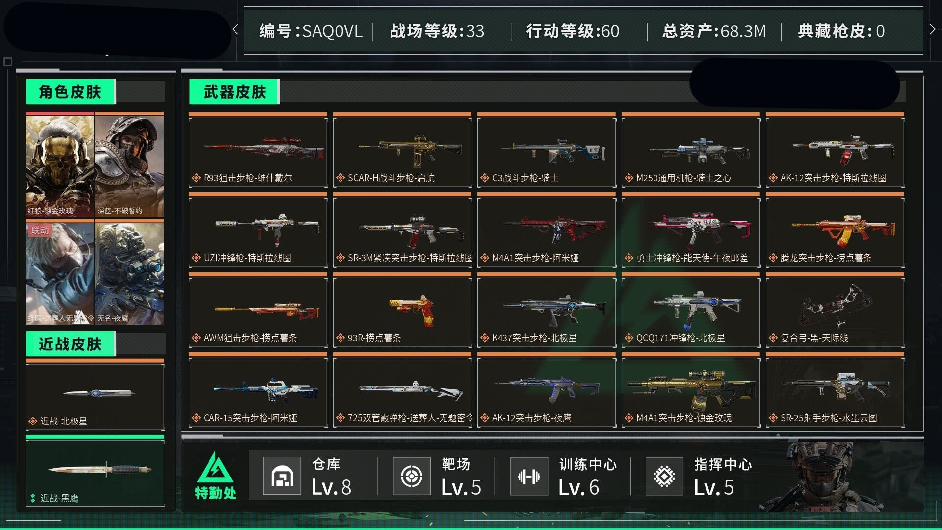 【账号佳】 汤21948总资产68M,哈夫币320w,近战-北极星,红狼-蚀金玫瑰/深蓝-不破誓约/蜂医-送葬人无题密令/无名-夜鹰,枪皮数量226,战场等级:33 上等兵,行动等级:60 黑鹰,安全箱等时效性道具请以游戏内数据为准;详情请看图【个人信息】战场等级:33 上等兵,行动等级:60 _黑鹰【哈夫币】320w【总资产】68M【货币】52三角币/0曼德尔币/436三角券【安全箱】基础安全箱2(1x2)/S6高级安全箱6(2x3)【通行证】烽火地带限定版【特勤处】制药台Lv.3/工作台Lv.3/仓库Lv.8/防具台Lv.3/训练中心Lv.6/靶场Lv.5/技术中心Lv.3/指挥中心Lv.5/潜水中心Lv.0/收藏室Lv.1【角色皮肤】红狼-蚀金玫瑰/无名-夜鹰/蜂医-送葬人无题密令/深蓝-不破誓约/【已拥有捆绑包】禁卫捆绑包/北极星捆绑包/捞点薯条捆绑包/特斯拉线圈捆绑包/【近战皮肤】近战-黑鹰/近战-北极星/【步枪皮肤】M4A1突击步枪-蚀金玫瑰/QBZ95-1突击步枪-曙光/SR-3M紧凑突击步枪-英雄/AUG突击步枪-蝮蛇/G3战斗步枪-战场英杰/M7战斗步枪-禁卫/M14射手步枪-禁卫/AK-12突击步枪-夜鹰/SG552突击步枪-深海恐惧/SG552突击步枪-尖端治疗/AS Val突击步枪-尖端治疗/ASh-12战斗步枪-守夜人/AKM突击步枪-林中猎手/PTR-32突击步枪-英雄/K437突击步枪-北极星/AS Val突击步枪-典狱官/腾龙突击步枪-无垢/SCAR-H战斗步枪-囚徒/M16A4突击步枪-竞赛选手/SR-3M紧凑突击步枪-荒野求生/CAR-15突击步枪-阿米娅/M4A1突击步枪-阿米娅/腾龙突击步枪-捞点薯条/AK-12突击步枪-特斯拉线圈/SR-3M紧凑突击步枪-特斯拉线圈/PTR-32突击步枪-OldHabits/腾龙突击步枪-猎鳄行动/K437突击步枪-守护者/ASh-12战斗步枪-无极限/G3战斗步枪-骑士/SCAR-H战斗步枪-启航/SR-3M紧凑突击步枪-战术竞备/【冲锋枪皮肤】UZI冲锋枪-特斯拉线圈/Vector冲锋枪-阿萨拉文明/QCQ171冲锋枪-禁卫/MP5冲锋枪-深海恐惧/勇士冲锋枪-深海恐惧/SMG-45冲锋枪-骑士/QCQ171冲锋枪-北极星/MP7冲锋枪-无垢/勇士冲锋枪-能天使-午夜邮差/P90冲锋枪-紧急戒备/Vector冲锋枪-猎鳄行动/MP7冲锋枪-守护者/勇士冲锋枪-工业狂潮/MP5冲锋枪-战术竞备/【霰弹枪皮肤】S12K霰弹枪-曙光/M1014霰弹枪-林中猎手/725双管霰弹枪-送葬人-无题密令/【轻机枪皮肤】PKM通用机枪-蝮蛇/PKM通用机枪-英雄/PKM通用机枪-守夜人/PKM通用机枪-荒野求生/M250通用机枪-囚徒/QJB201轻机枪-OldHabits/M250通用机枪-骑士之心/【精准射手步枪皮肤】SR-25射手步枪-水墨云图/SR-25射手步枪-尖端治疗/PSG-1射手步枪-无垢/Mini-14射手步枪-守护者/【狙击步枪皮肤】SVD狙击步枪-阿萨拉工艺/M700狙击步枪-竞技风/SV-98狙击步枪-囚徒/R93狙击步枪-维什戴尔/M700狙击步枪-蝮蛇/SVD狙击步枪-暗夜猎手/M700狙击步枪-守夜人/SV-98狙击步枪-林中猎手/SVD狙击步枪-荒野求生/AWM狙击步枪-捞点薯条/SV-98狙击步枪-猎鳄行动/【手枪皮肤】沙漠之鹰-曙光/QSZ92G-风林火山/93R-捞点薯条/【特殊武器】复合弓-黑-天际线/复合弓-守护者/【挂饰】挂饰-枪匠/王国利刃/牛角威龙/挂饰-骑士之心/挂饰-维什戴尔/挂饰-启程/挂饰-蚀金玫瑰/挂饰-小羊/挂饰-彩蛋/阿萨拉机枪兵/阿萨拉盾兵/挂饰-北极星/挂饰-晶石幻想/挂饰-阿米娅/挂饰-来点薯条/挂饰-特斯拉线圈/紧急会议/(典藏皮肤颜色请以典藏展示为准,安全箱等时效性道具请以游戏内数据为准)