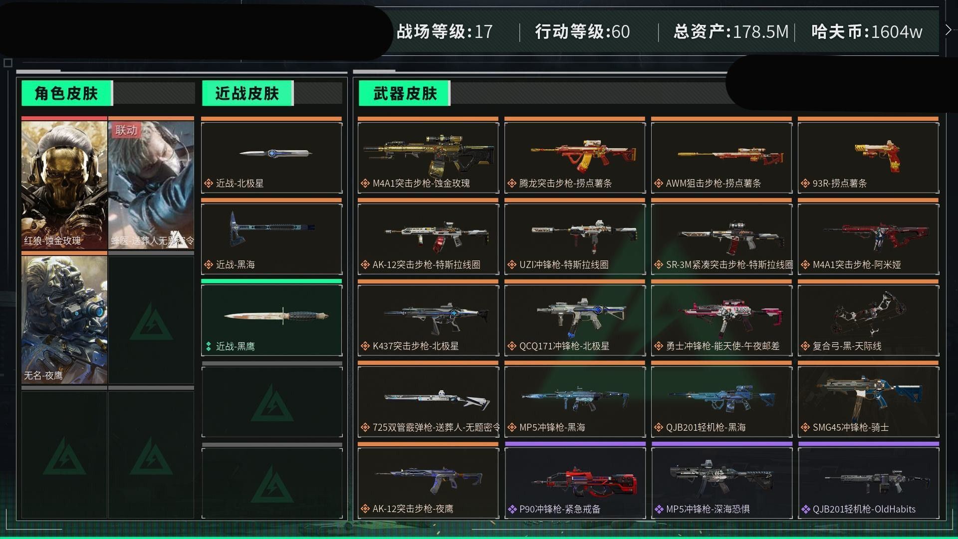 【账号佳】 总资产49M,哈夫币43w,近战2,枪皮数量211,战场等级:21 上等兵,行动等级:60 钻石,角色皮肤数量5,露娜-黑天际线/红狼-蚀金玫瑰/深蓝-不破誓约/蜂医-送葬人无题密令/无名-夜鹰,近战-北极星/近战-黑鹰,安全箱等时效性道具请以游戏内数据为准;详情请看图