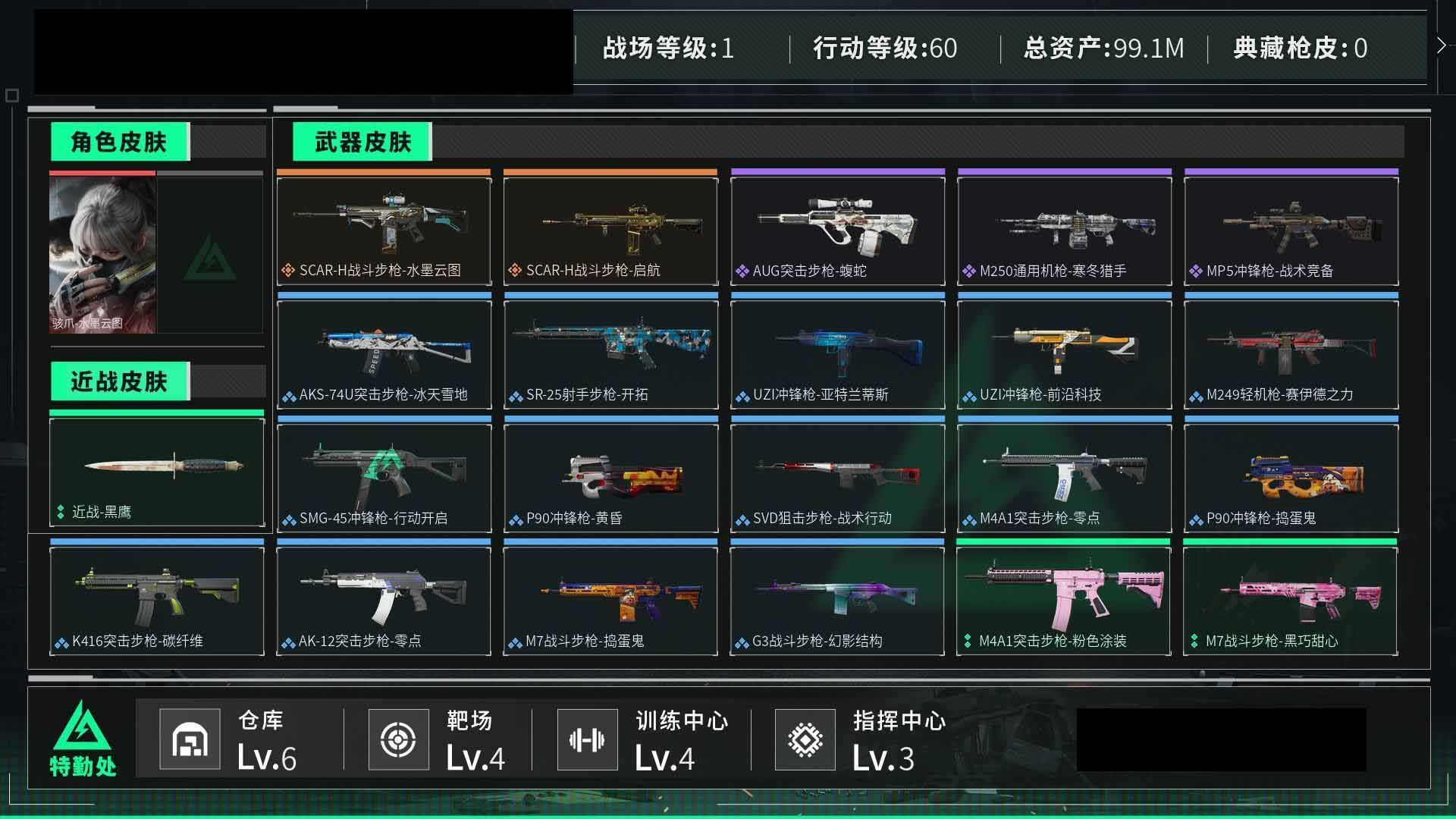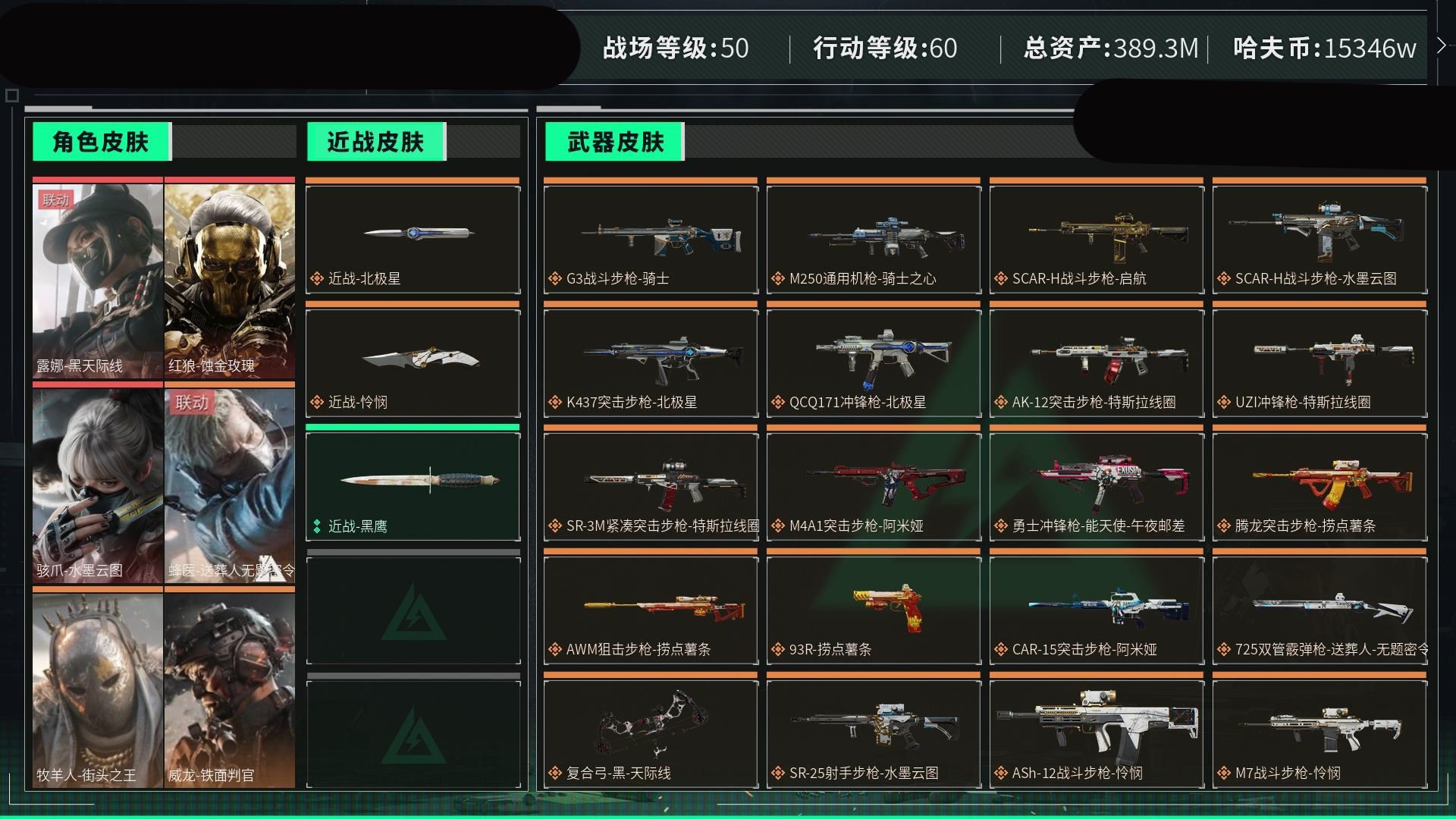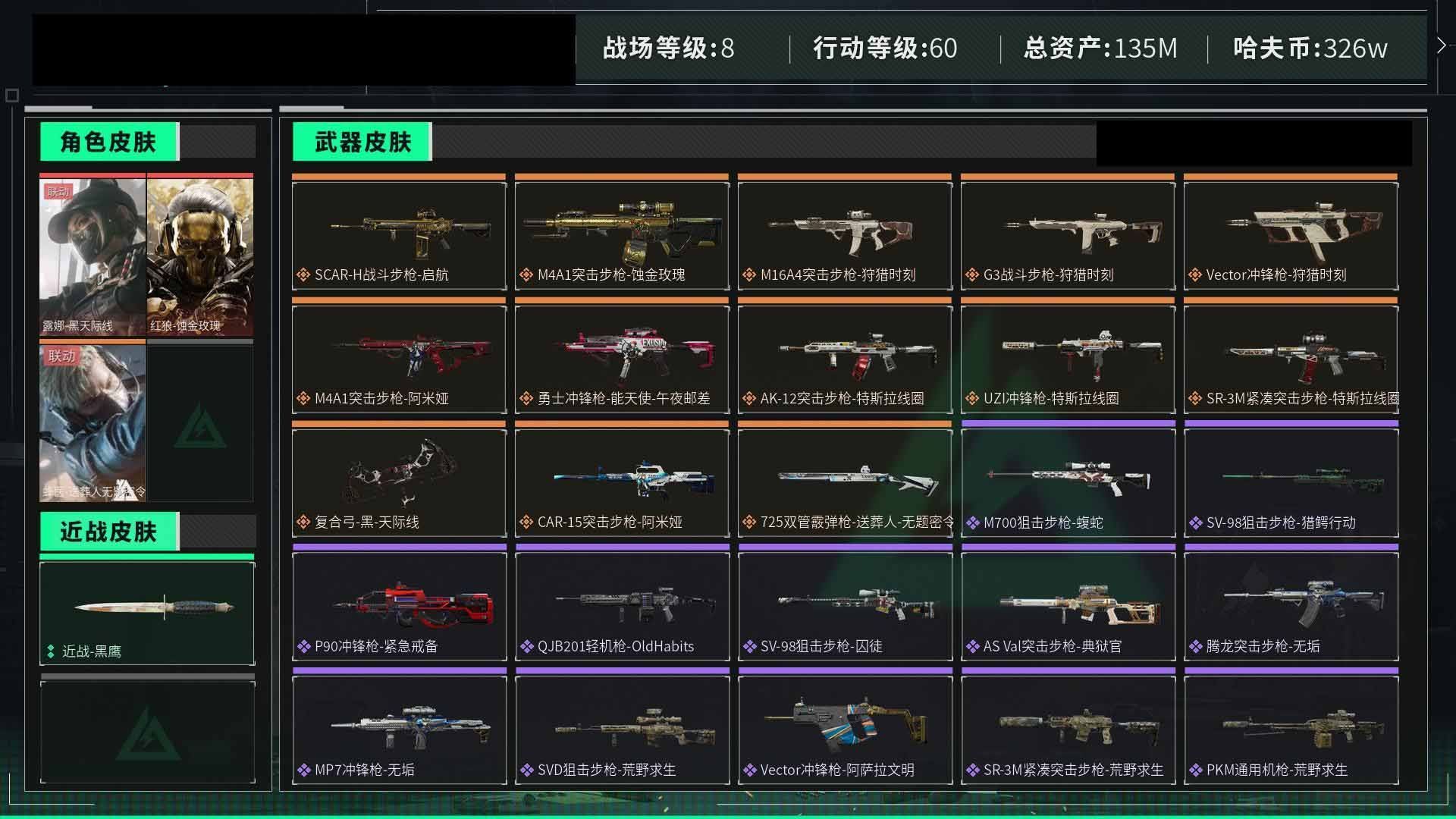 【账号佳】 汤26975 总资产 58.7m 哈夫币3901k 刀皮北极星 干员蚀金玫瑰 黑天际线 夜鹰 无题密令 仓库8级 训练7级 靶场7级详情看图