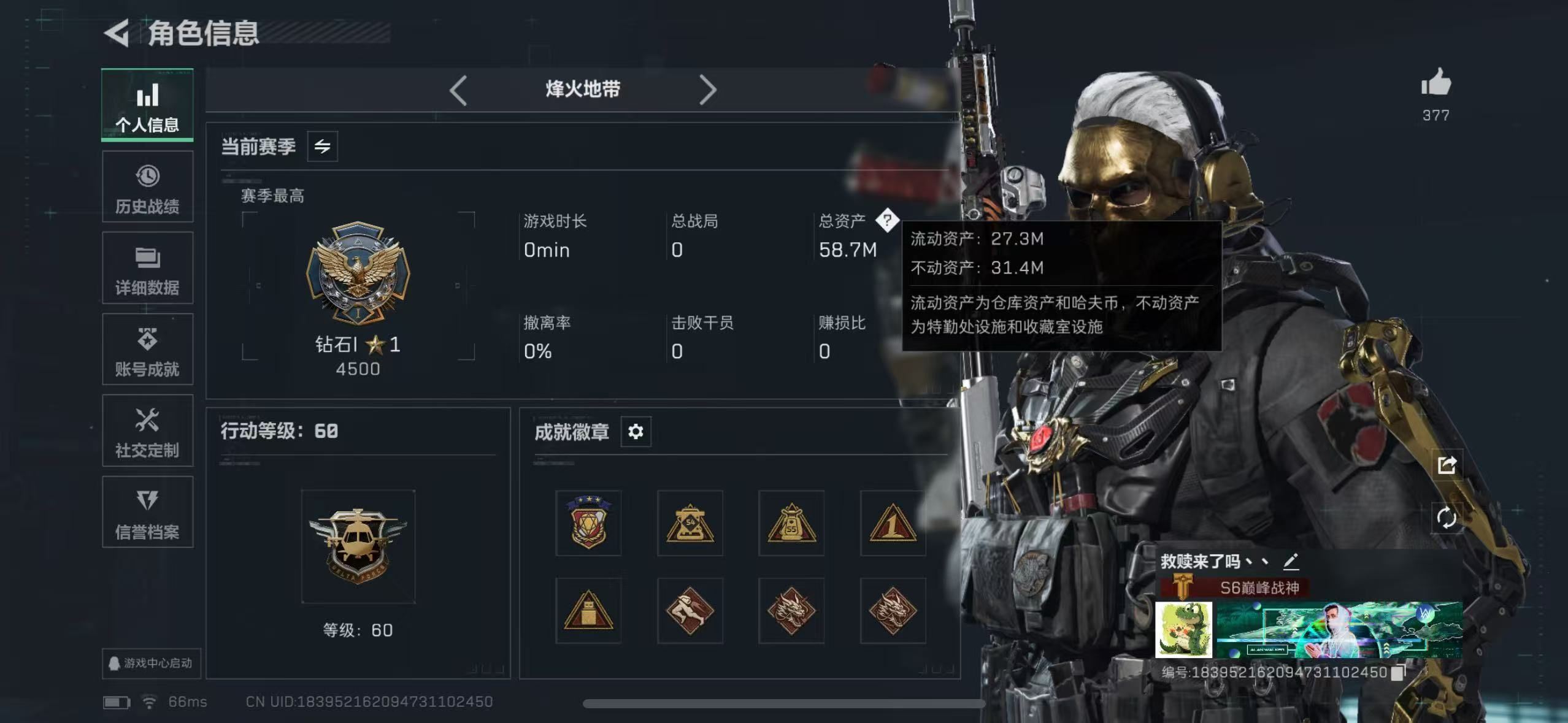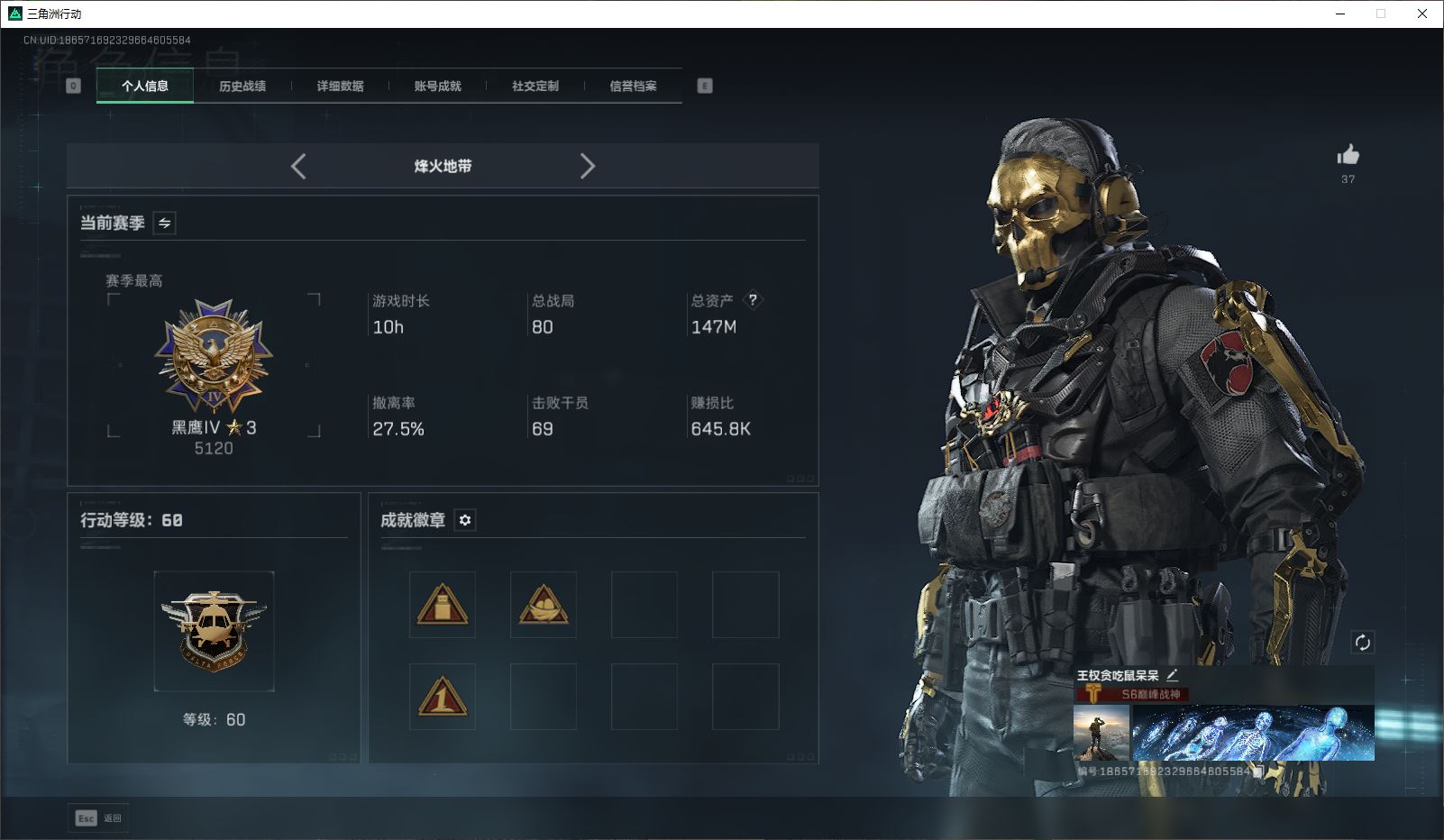 【账号佳】 ff3819 三角洲Q 行动等级60级总资产287M【北极星】特勤处877露娜天际线蜂医送葬人多捆绑包