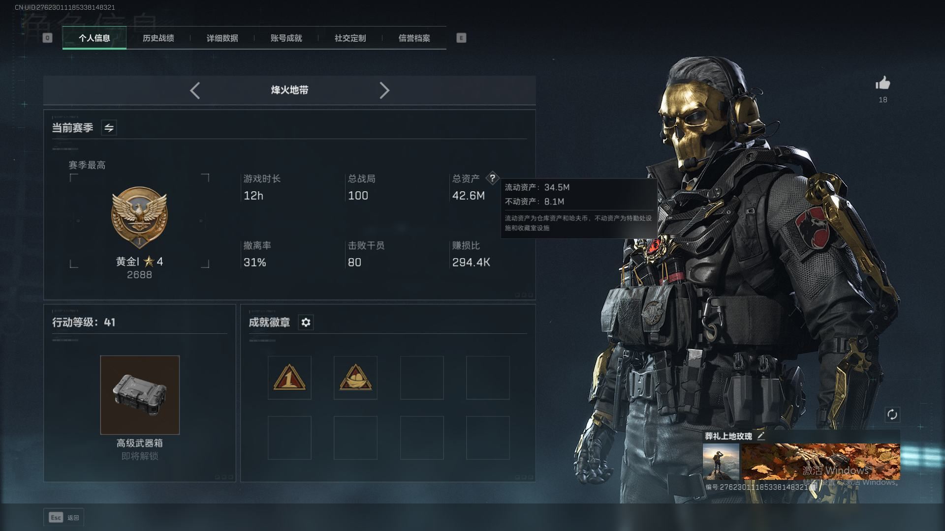 【账号佳】 汤18273总资产297M,哈夫币4735w,近战-北极星/红狼-蚀金玫瑰/蜂医-无题密令/无名-夜鹰,仓库lv9,靶场lv4,训练中心lv7,详情看图;