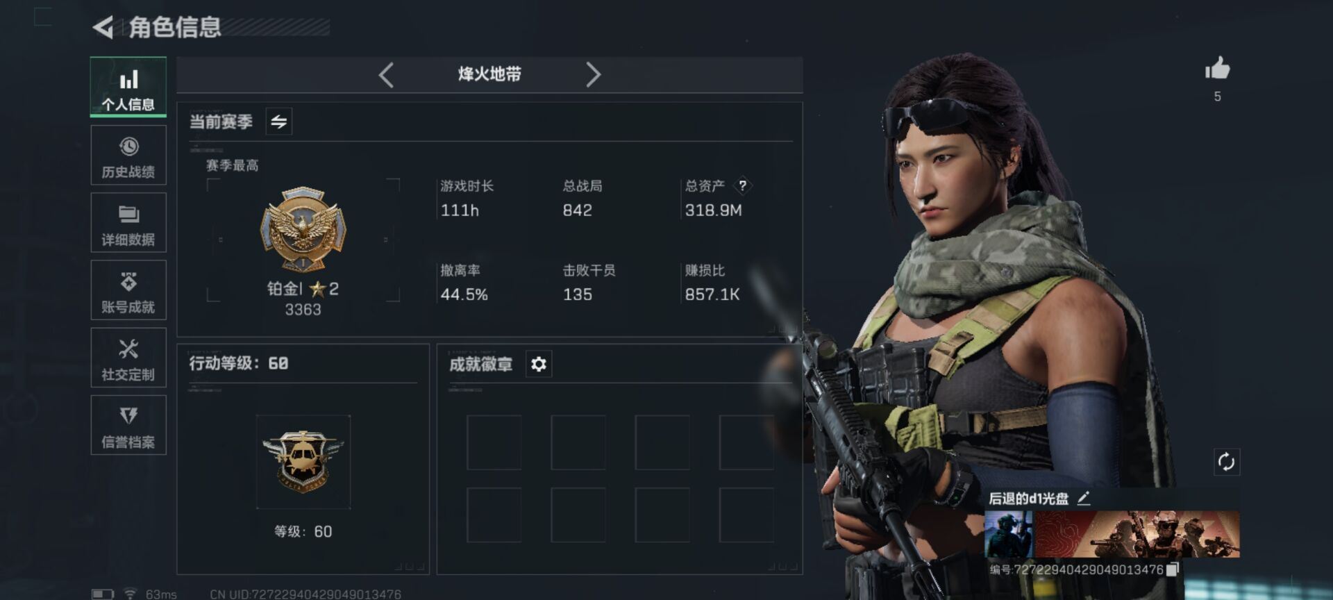 【账号佳】 R44231 可二次QQ【行动等级60】【总资产318.9m】【战场等级1】【刀:黑鹰】【蛊能天使午夜邮差】【m4突击步枪阿米娅+ash战斗步枪鹅鸭杀+m16突击步枪狩猎时刻+scar战斗步枪启航+g3战斗步枪狩猎时刻+vector冲锋枪能天使-狩猎时刻+勇士冲锋枪能天使午夜邮差+qcq冲锋枪鹅鸭杀+m250通用机枪骑士之心+qjb轻机枪鹅鸭杀+R93狙击步枪维什戴尔】详情请看图片【卖号买号首选亿梦】