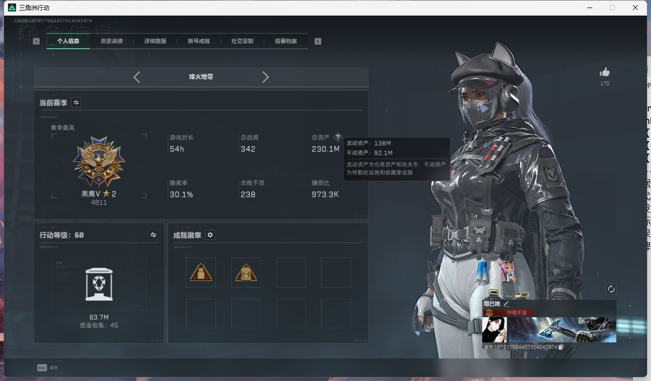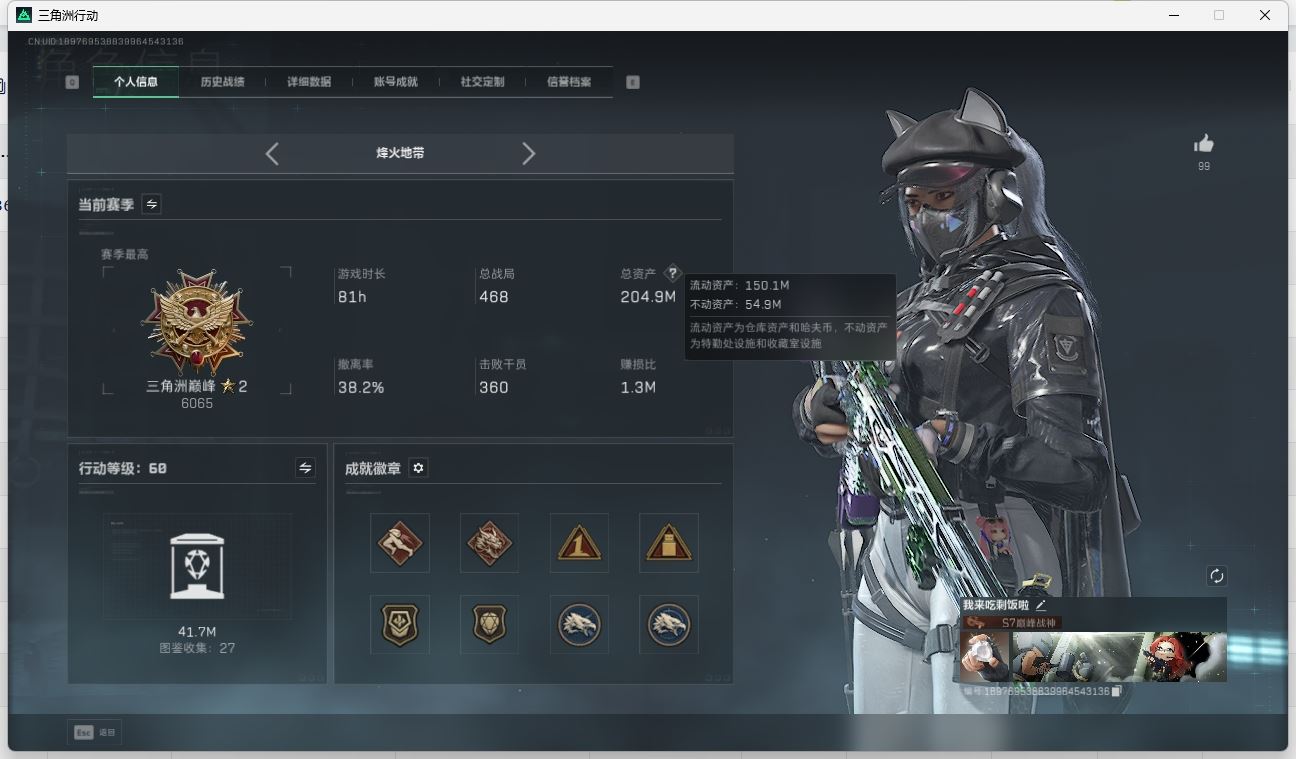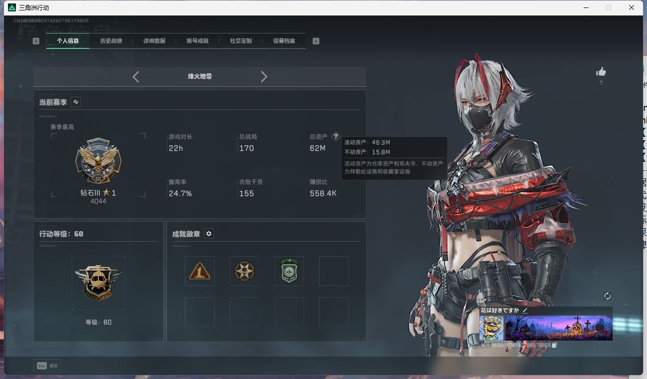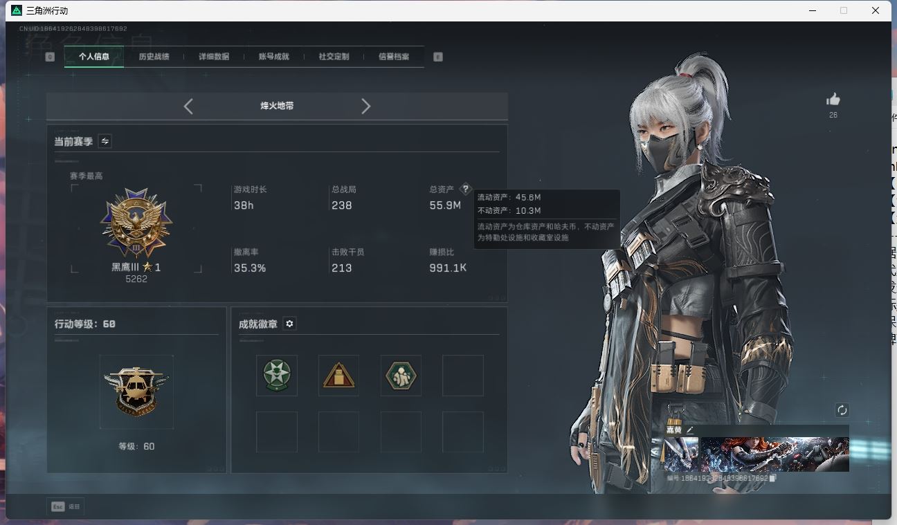 【账号佳】 hmcAK028690 行动等级:60白银,总资产220m哈夫币 【全满级特勤处 90aw子弹 格赫罗斯的密藏 s7赛季33 】【呛皮:KC17突击步枪-电锯惊魂SG552突击步枪-运动别】【近战:黑鹰 】----安全箱等时效性道具请以游戏内数据为准:详情请看图----截图展示段位不代实际段位,赛季更新等不可抗拒因素发生变化、时限道具不保证所剩时间、标题未写送三角币默认不送】【主播担保+安全至上+性价比 买号卖号只选金牌商家一左友】