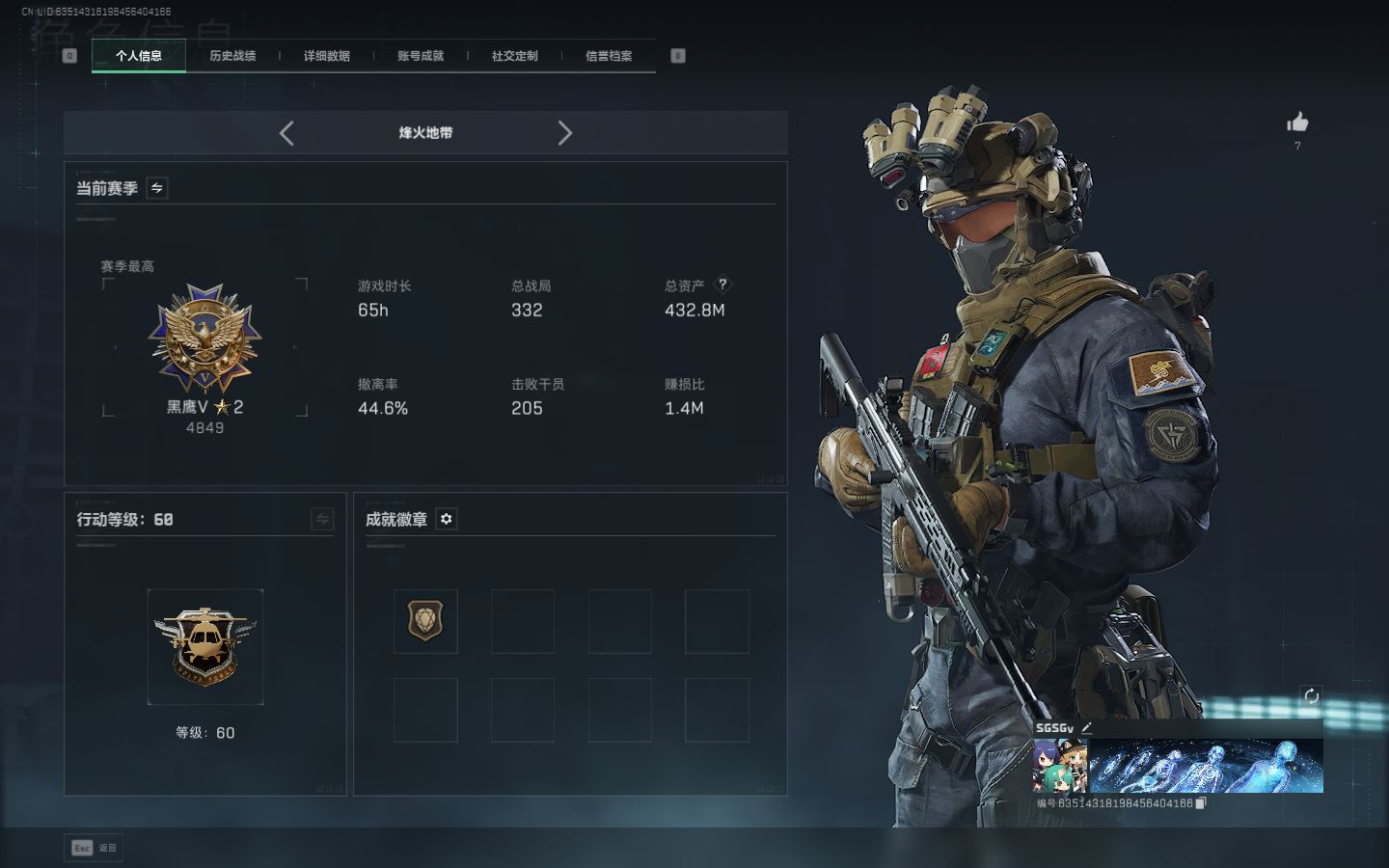 【账号佳】 ljh AK028687 包人脸 行动等级60黑鹰 总资产432.8m 满体s7赛季3*3 98发aw子弹【KC17突击步枪-电锯惊魂联动 R93狙击步枪-维什戴尔联动 CAR-15突击步枪-阿米娅G3战斗步枪-骑士联动 M4A1突击步枪-阿米娅SCAR-H战斗步枪-启航沙漠之鹰-曙光 】【近战 黑鹰】【角色皮肤 红狼-电锯惊魂 骇爪-维什戴尔 】----安全箱等时效性道具请以游戏内数据为准:详情请看图----截图展示段位不代实际段位,赛季更新等不可抗拒因素发生变化、时限道具不保证所剩时间、标题未写送三角券默认不送】【主播担保+安全至上+性价比 买号卖号只选金牌商家一左友】