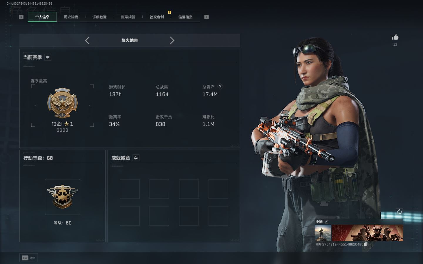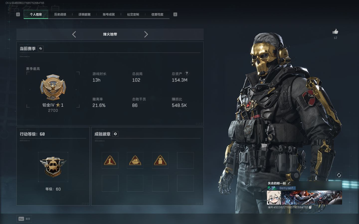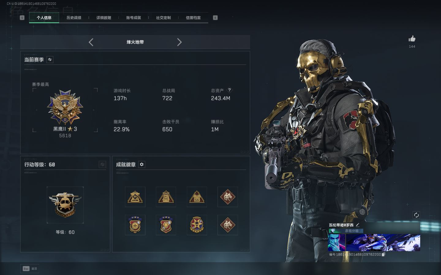 【账号佳】 ljh AK028637 有二次 行动等级60铂金 总资产17.4m 满体 s7赛季3*3 【KC17突击步枪-电锯惊魂P90冲锋枪-信条SR-25射手步枪-信条K437突击步枪-几何解构M250通用机枪-骑士之心 联动R93狙击步枪-维什戴尔SCAR-H战斗步枪-启航 】【近战 信条 黑鹰】【角色皮肤 红狼-电锯惊魂 深蓝-不破誓约 骇爪-维什戴尔 】----安全箱等时效性道具请以游戏内数据为准:详情请看图----截图展示段位不代实际段位,赛季更新等不可抗拒因素发生变化、时限道具不保证所剩时间、标题未写送三角券默认不送】【主播担保+安全至上+性价比 买号卖号只选金牌商家一左友】