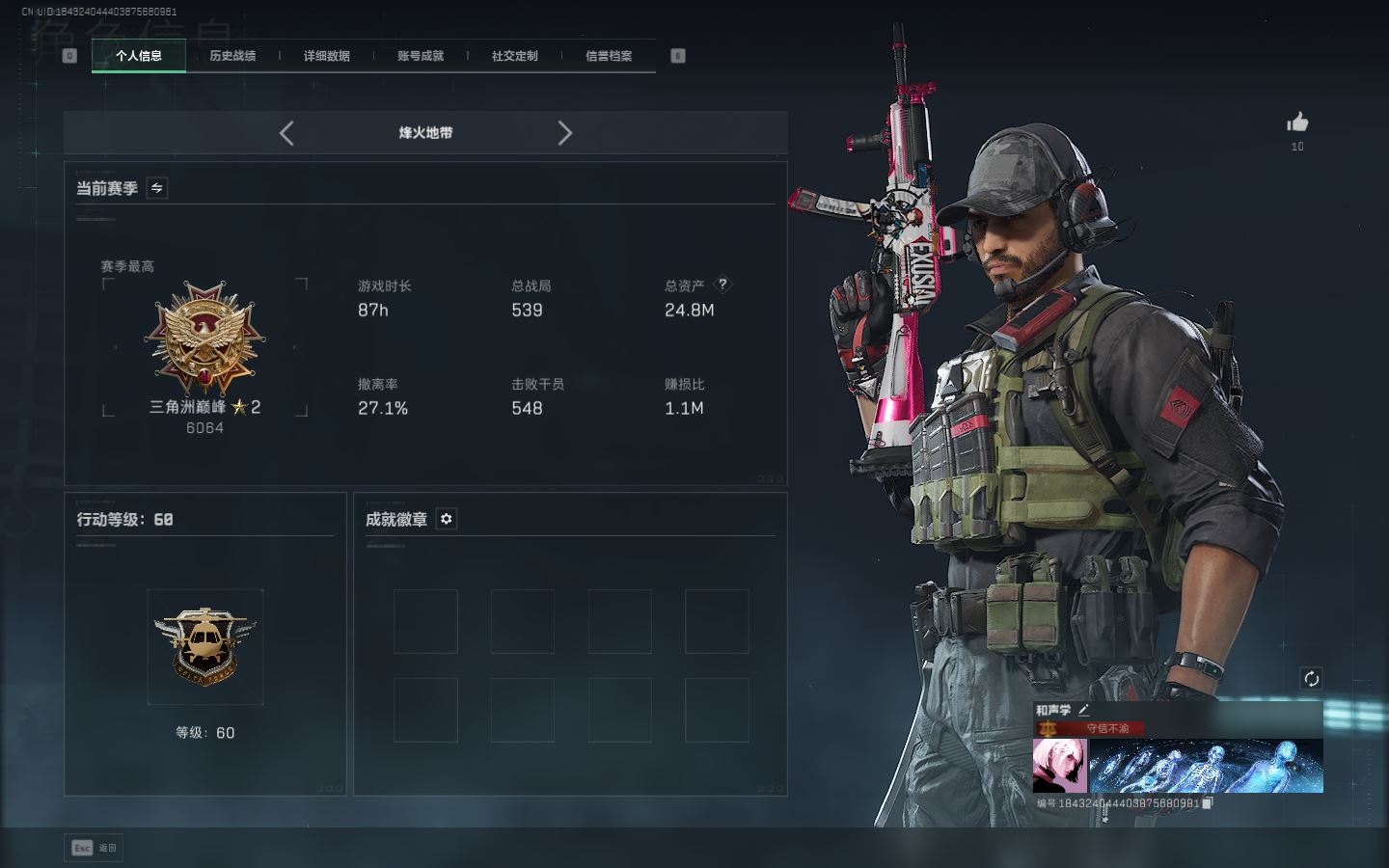 【账号佳】 ljh AK028658 包人脸 行动等级60巅峰 总资产24.8m s7赛季3*3 【连体瓦】【典藏 M7战斗步枪-棱镜攻势S2(优品b)】【P90冲锋枪-信条SR-25射手步枪-信条SG552突击步枪-运动员 KC17突击步枪-电锯惊魂M4A1突击步枪-蚀金玫瑰 SCAR-H战斗步枪-启航G3战斗步枪-骑士M250通用机枪-骑士之心AK-12突击步枪-特斯拉线圈 联动 Vector冲锋枪-能天使联动 725双管霰弹枪-送葬人-无题密令腾龙突击步枪-捞点薯条 】【近战 信条 北极星 黑鹰】【角色皮肤 红狼-电锯惊魂 蜂医-送葬人无题密令 】----安全箱等时效性道具请以游戏内数据为准:详情请看图----截图展示段位不代实际段位,赛季更新等不可抗拒因素发生变化、时限道具不保证所剩时间、标题未写送三角券默认不送】【主播担保+安全至上+性价比 买号卖号只选金牌商家一左友】