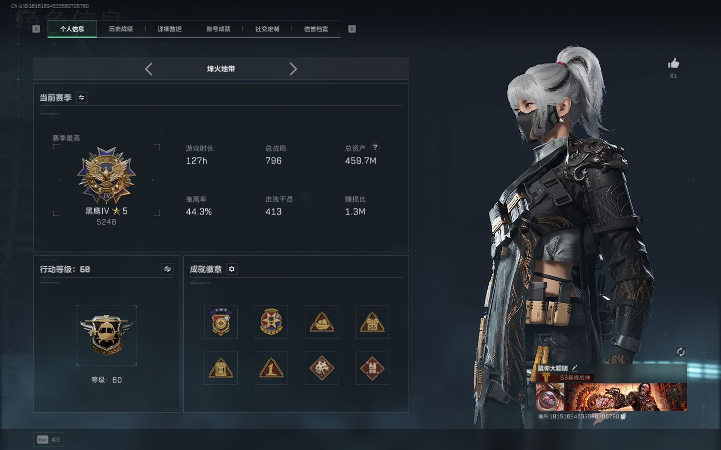 【账号佳】 ljh AK028685 包人脸 行动等级60黑鹰 总资产459.7m 满仓满体 s7赛季3*3 128发aw子弹【KC17突击步枪-电锯惊魂SG552突击步抢-运动员S12K霰弹枪-电锯惊魂M14射手步枪-电锯惊魂ASh-12战斗步枪-鹅鸭杀 G3战斗步枪-骑士M250通用机枪-骑士之心AK-12突击步枪-特斯拉线圈UZI冲锋枪-特斯拉线圈SR-3M紧凑突击步枪-特斯拉线圈 联动CAR-15突击步枪-阿米娅K437突击步枪-北极星QCQ171冲锋枪-北极星 】【近战 电锯 北极星 黑鹰】【角色皮肤 红狼-蚀金玫瑰 红狼-电锯惊魂 无名-夜鹰 蜂医-送葬人无题密令 深蓝-不破誓约 露娜-黑天际线 骇爪-水墨云图 】----安全箱等时效性道具请以游戏内数据为准:详情请看图----截图展示段位不代实际段位,赛季更新等不可抗拒因素发生变化、时限道具不保证所剩时间、标题未写送三角券默认不送】【主播担保+安全至上+性价比 买号卖号只选金牌商家一左友】