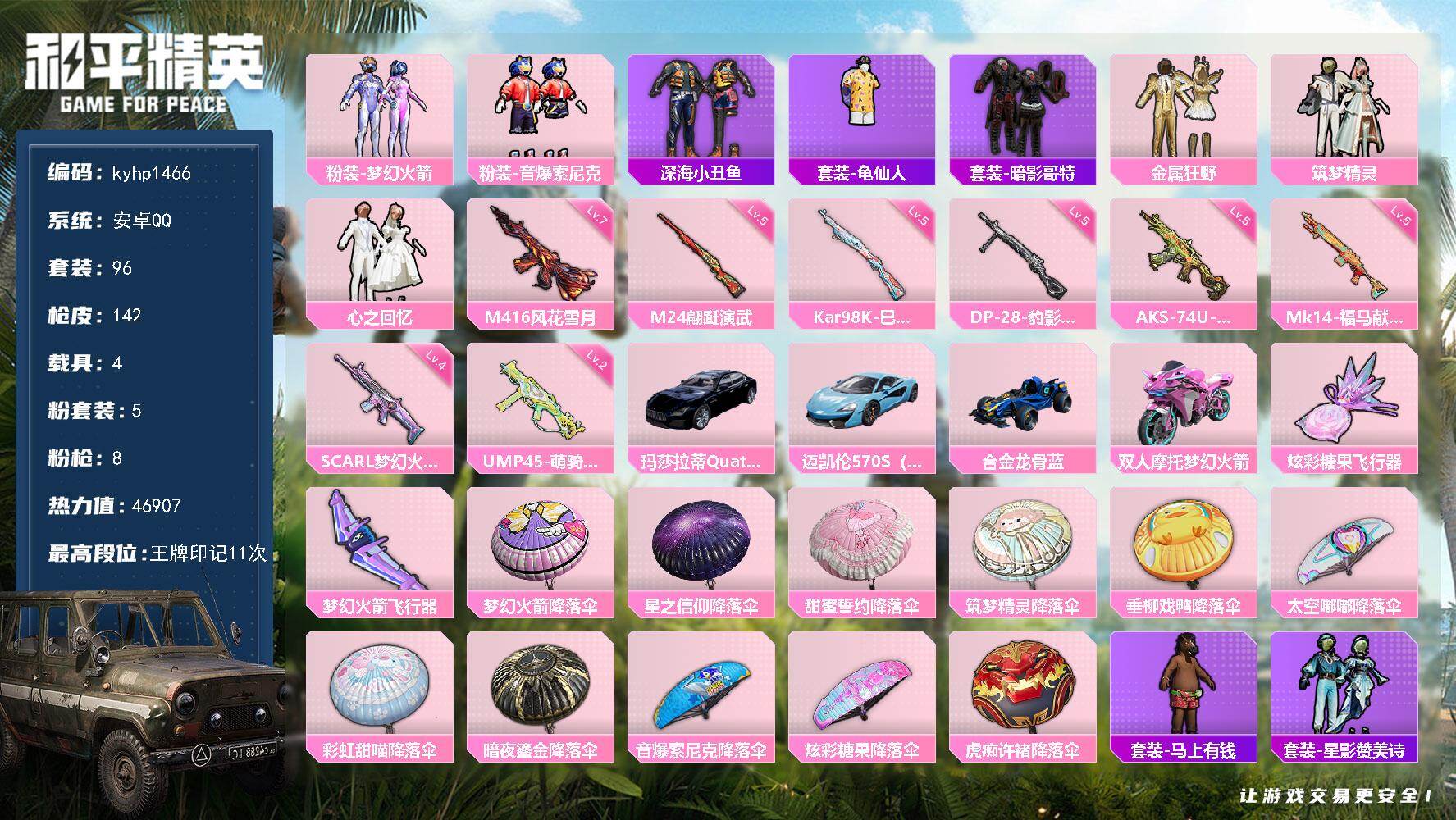 【账号佳】 【可二次实名】安卓 手Q1粉装-9特效枪-0载具-0粉色飞行器-44529热力值-3王牌印记-117套装-160枪皮 【粉色套装】:粉装-幻彩电音 【粉色枪皮等级】:SCAR-L-锦绣绵绵(五级),M416-电玩时刻(五级),GROZA-镜光银凌(五级),M762-青锋波束(五级),UMP45-量子极限(五级),Kar98K-巳巳如意(五级),Mk14-甜梦熊击(五级),DP-28-豹影疾电(五级),MG-36-沧焰双生(五级) 【粉色枪皮】:SCAR-L-锦绣绵绵,M416-电玩时刻,GROZA-镜光银凌,M762-青锋波束,UMP45-量子极限,Kar98K-巳巳如意,Mk14-甜梦熊击,DP-28-豹影疾电,MG-36-沧焰双生 【粉色降落伞】:洛神天依降落伞,炙焰牛王降落伞,旋转彩虹降落伞,萌酷奶龙降落伞,巴啦啦小魔仙降落伞,忍者神龟降落伞,幻影飞狐降落伞,幻彩电音降落伞 【稀有套装】:套装-巳巳如意,角色-甜心蒙太奇,套装-雪国风尚,套装-雏菊兔兔,套装-萝兰蝴蝶,套装-青团波波,角色-俏兔智灵,套装-燕燕于飞,套装-鱼渊荷华,角色-蜜桃派对,玩偶服-美羊羊,套装-书海巡游,套装-画境星梦,套装-琴音绮想,角色-碧青流霞 【稀有枪皮】:AKM-环太平洋,AKM-破晓战魂,M16A4-幻世战舞者,M16A4-甜心亚梦,SCAR-L-夜灯,SCAR-L-炫彩节奏,SCAR-L-玉兔迎春,SCAR-L-红色方程式,M416-糯团青竹,M416-红色方程式,M416-蓝色火焰,GROZA-田园牧歌,AUG-天降萌叽,AUG-耀粉歌者,QBZ-彩虹符号,Mk47-洛神天依,AC-VAL-天降萌叽,AC-VAL-快闪甜心,AC-VAL-甜心亚梦,蜜獾-天降萌叽,蜜獾-娇憨猪猪,Famas-桃粉嫣然,ACE32-画境星梦,UZI-啾咪啾咪,UZI-天降萌叽,UZI-娇憨猪猪,UZI-月影灵韵,UMP45-夜灯,UMP45-生命誓言,UMP45-蓝色火焰,Vector-焰鹰斗篷,Vector-田园牧歌,汤姆逊-天降萌叽,汤姆逊-奇异狩猎者,汤姆逊-耀粉歌者,MP5K-画境星梦,P90-快闪甜心,P90-巳巳如意,Kar98K-彩虹符号,Kar98K-红色方程式,M24-炫彩节奏,M24-樱桃泡泡,AWM-焰鹰斗篷,SKS-炫彩节奏,VSS-田园牧歌,Mini14-旋转彩虹,Mini14-炫彩节奏,Mk14-治愈之星,SLR-娇憨猪猪,MK20-H-快闪甜心,M1加兰德-画境星梦,S686-生命誓言,S686-红色方程式,S686-巳巳如意,S1897-炫彩节奏,S12K-玩趣呆呆,S12K-破晓战魂,S12K-夜灯,S12K-娇憨猪猪,DBS-焰鹰斗篷,DBS-彩虹符号,DBS-甜心亚梦,AA12-G-画境星梦,SPAS-12-田园牧歌,M249-彩虹符号,M249-破晓战魂,M249-糯团青竹,DP-28-焰鹰斗篷,DP-28-甜心亚梦,MG3-妙红点点,MG3-幻世战舞者,沙漠之鹰-快闪甜心,平底锅-画境星梦,破片手榴弹-巳巳如意 【其他套装】:套装-SS19特训,套装-SS20特训,套装-SS21特训,套装-SS22特训,套装-SS23特训,套装-SS25特训,套装-SS26特训,套装-SS27特训,套装-SS28特训,套装-SS29特训,套装-光之冒险,套装-冷焰舞者,套装-吉莉礼服,套装-夏日音浪,套装-完美偶像,套装-幻世战舞者,套装-幻影武者,套装-探宝勇士,套装-旭日情侣,套装-极速红龙,套装-柠萌假日,套装-海岛探路者,套装-深蓝色名流,套装-湖蓝色名流,套装-灼焰舞者,套装-牛气冲天,套装-猎鹰,套装-猛禽,套装-玉兔迎春,套装-甜蜜告白,套装-疯狂小兔子,套装-登山爱好者,套装-白色伏地魔,套装-破蛋小黄鸡,套装-空岛之星,套装-竞技名士,套装-红色运动,套装-绮丽涂鸦,套装-缤纷果语,套装-耀粉歌者,套装-蓝色运动,套装-街头潮人,套装-都市漫游者,套装-酒红色名流,套装-长空猛禽,套装-青年教官,套装-青涩时光,套装-魅力单车,套装-鹤鸣,套装-麻辣教官,套装-黄色伏地魔,套装-黄色名流,套装-黄色运动,套装-黎明保卫者,套装-黑色伏地魔,套装-龙的传人,套装-沙漠毒蛇,套装-鹰眼刺客,套装-金耀舞者,套装-冰川特警,套装-黑夜传说,套装-天籁歌者,套装-智慧隐士,套装-甜心亚梦,套装-虚音幻奏,套装-娇憨猪猪,套装-萌趣咩咩,套装-田园牧歌,套装-轻风白浪,套装-快闪甜心,套装-春光漫游,套装-焰鹰斗篷,套装-幻羽潜行,角色-情公主,套装-纯真浪花,套装-热情海星 【营地ID】:905941732
