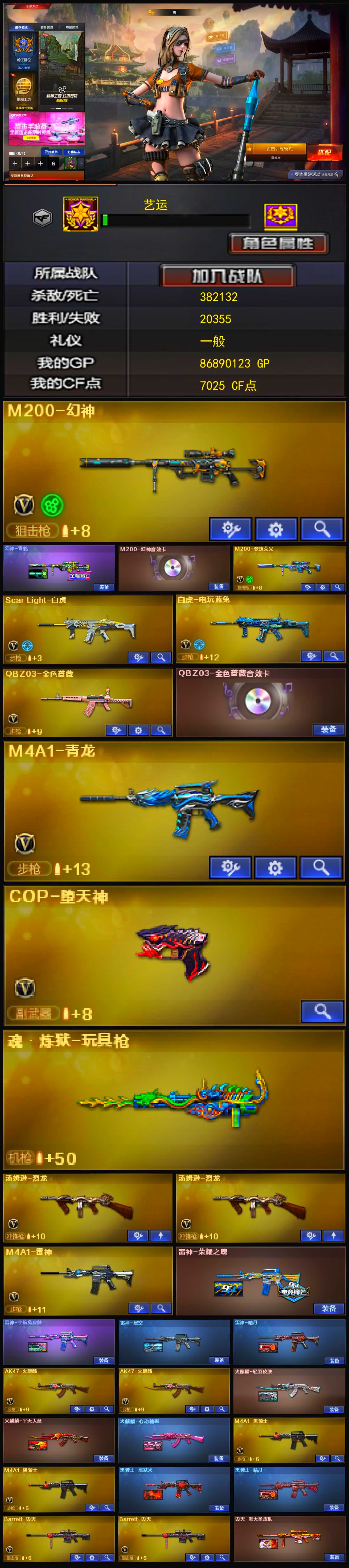 【账号佳】 【可二次实名】青鹤幻神音效卡+白虎+白虎电玩蓝兔+青龙+竞技荣光套+金色蔷薇音效卡+堕天神COP+2烈龙+雷神荣耀之魄+精品基础v【51v】 【可否排位】可排位 【账号状态】无封号 【区服】黑龙江区 【VIP】VIP6 【游戏段位】传奇5 【游戏等级】Lv.102 荣耀元帅 【段位排名】630160 【CF点】7025 【VVIP数量】51 【重要套装】 【重要角色】_葵/龙儿-小淘气/女战神/职业选手/_炽天使/铁骑荣耀 【传说武器】 【英雄武器】_M200-幻神/M200-竞技荣光/Barrett-毁灭(2)/Barrett-极光/M4A1-青龙/M4A1-雷神/M4A1-黑骑士(2)/_Scar Light-白虎/白虎-电玩蓝兔/AK47-火麒麟(2)/无影-神兵利器/AK-47-猩红传说(2)/AK47-B-战神/AN94-超新星/QBZ03-金色蔷薇/汤姆逊-烈龙(2)/COP-堕天神/沙鹰-天神/沙鹰-修罗/柯尔特-电竞装甲/麒麟刺/龙啸(3)/擎天-竞技荣光/屠龙/雷霆王者之锋-觉醒版/马来剑-夜魔/高爆手雷-夜魔/高爆手雷-竞技荣光(2)/烟雾弹-夜魔/烟雾弹-竞技荣光(2)/烟雾弹-电竞装甲/恶棍-电竞装甲/烟雾弹-雷霆王者-觉醒版/闪光弹-夜魔/闪光弹-竞技荣光(5)/闪光弹-电竞装甲/闪光弹-雷霆王者-觉醒版 【王者武器】高爆手雷-雷霆王者(2) 【小人枪】AWM-灵狐-15周年嘉年华/天龙-曼陀罗/冰火魔兽(3)/魔能飞环-曼陀罗/小飞碟-宇航兔兔 【其他重要武器】M4A1-十二生肖·龙-雷神/M4A1-秘银赤龙(3)/AK47-齐天大圣/AK47-苍龙/AK47-大帝林肯/M4A1-电音/AK47-十二生肖-蛇(2)/百城AK47(3)/百城M4A1/AK47-祥云苍龙/QBZ03-锋芒破茧/G3A3-SS-枪王排位(2)/AN94-青花瓷(2)/M4A1-樱/AK47-朋克/AK47-枪娘/M4A1-PINK/M4A1枪王排位II/AK47-QT/M4A1-战龙/AK47-十年火线/AK47-狂欢-CFS/M4A1-SS-枪王排位/AK47-轮回/AK-103-火线13周年/黄金AWM(2)/百城AWM(2)/M200-萌杀/AWM-S/M200-青帝/AWM-枪娘/AWM-摸金校尉/AWM-A枪王排位II/AWM-卡通(2)/M200-赤血龙魂/AWM-CFS 2020/AWM-Pink/M200-大黄蜂/破天狂龙/KAC-圣炎切割者III/M240B-卡通/EVOIII- 曹操/CPW-动力-潘多拉/P90-炫彩/SPAS-12-雷电核心/Spas-12-黑金/阐释者III/沙鹰-枪王排位(2)/mac-10-蒸汽钟表/新USP-枪王排位奖励(4)/柯尔特-百城(3)/MAC-10-幻能朋克/愤怒公牛左轮-枪王排位(2)/COP-金蝉子-枪王排位(2)/MAC-10-涂鸦/沙漠之鹰-A-摸金校尉/Anaconda-情人节2021/USP-黑大圣/新USP-怒火大圣/幻影Anaconda-枪王排位/迷彩沙鹰-70KG/COP 357--绚樱/金刚伞-电玩红兔/招财猫-枪王排位/不灭之拳(2)/丛林匕首-枪王排位/尼泊尔军刀-战龙(2)/匕首-幻能朋克/蝴蝶刀-枪王排位/Laser Sword-夏日/虹光丛林匕首-枪王排位(2)/虹光女皇利刃-枪王排位/虹光鹰爪-枪王排位/幻影双斧-枪王排位/唐刀-九五至尊/黄金刀锋手雷/生化手雷-机甲核心/胜利奖杯手雷-枪王排位(2)/闪光弹-枪王排位(6)/烟雾弹-机甲核心/胜利奖杯烟雾弹-枪王排位(2)/胜利奖杯闪光弹-枪王排位/幽灵宝宝手雷/手雷-能量核心 【重要武器皮肤】幻神-青鹤/毁灭-黑大圣皮肤/毁灭-青帝皮肤/极光-能量核心/天龙-CFSTAR/火麒麟-AG/火麒麟-平天大圣/火麒麟-心动糖果/火麒麟-轻羽皮肤/AK47-B-常胜将军-曹操/AK-47-雷神/雷神-荣耀之魄/雷神-宇航兔皮肤/雷神-暗月/雷神-星空/黑骑士-地狱火/黑骑士-暗月/屠龙-荣耀之锋 【重要光效】M200-幻神蓝粉色光效/王者之影金色光效/雷霆王者之锋光效/M4A1-雷神绿色光效/M4A1-雷神蓝粉色光效/M4A1-黑骑士蓝色光效/AN94-超新星蓝色光效/沙鹰-修罗蓝色光效 【重要音效卡】M200-幻神音效卡/QBZ03-金色蔷薇音效卡 【重要戒指】15周年限定戒指/龙眼(死神)/龙眼(鹰)/皇龙戒/银蛇戒/18赛季纪念戒指-耀金/20赛季纪念戒指-耀金/21赛季纪念戒指-耀银(拇指)/21赛季纪念戒指-耀银(食指)/22赛季纪念戒指-耀银(拇指)/22赛季纪念戒指-耀银(食指)/23赛季纪念戒指-耀银(拇指)/23赛季纪念戒指-耀银(食指)/24赛季纪念戒指-耀银(拇指)/25赛季纪