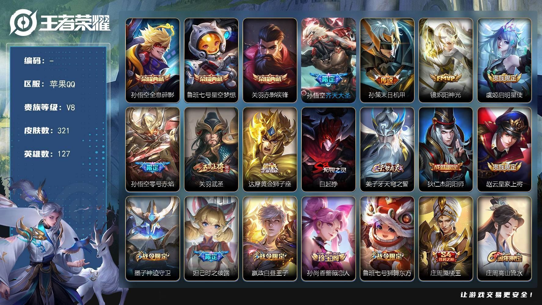 【账号佳】 【可二次实名】苹果Q V8 尊贵铂金I段位 127英雄 321皮肤 3典藏 0珍品无双 0无双 0珍品传说 7传说 96史诗大区:苹果Q,营地:213290588,贵族等级:8,【热门皮肤】:,【限定皮肤】:桑启线条小狗,虞姬溯影追猎,周瑜线条小狗,亚瑟荣光之誓,芈月红桃皇后,西施雪境奇遇,狂铁命运角斗场,戈娅玫蓝誓约,阿轲化蝶舞,姜子牙星梦巡礼,苍苍林狼骑,甄姬游园惊梦,露娜紫霞仙子,姬小满妄想食味,姜子牙天穹之誓,牛魔西部大镖客,镜炽阳神光,大司命暗都幽影,程咬金群星魔术团,刘邦剑破天穹,庄周鲤鱼之梦,廉颇功夫炙烤,伽罗琥珀纪元,嫦娥漠中幻影,扁鹊救世之瞳,海诺时空谍影,鬼谷子天穹祈灯,蒙恬荣光圣徽,后羿完美运算,蒙犽百解令,张飞五福同心,大乔猫狗日记,曹操决胜大满贯,兰陵王幻夜行动,阿古朵江河有灵,钟无艳聚星闪耀,亚连破局者,张良古海寻踪,亚瑟心灵战警,诸葛亮掌控之力,李元芳妄想特派,鲁班大师探海日志,姬小满零食大作战,莱西奥西部游侠,太乙真人劲辣红锅,裴擒虎擒涛扼浪,赵怀真太极少年,吕布野性能量,后羿阿尔法小队,白起乐园追猎者,程咬金星际陆战队,暃星界游侠,韩信街头霸王,白起白色死神,牛魔牛运亨通,猪八戒潮玩探月行,孙策猫狗日记,高渐离玩趣恶龙,孙悟空齐天大圣,嫦娥暖冬·兔眠,海月幻泉雾影,桑启海盐诗旅,梦奇顽趣,元歌无心,孙悟空孙行者,虞姬启明星使,鬼谷子五谷丰年,钟无艳超时空战士,刘备潮玩造梦师,大乔守护之力,甄姬落雪兰心,戈娅危途狂花,李元芳云中旅人,安琪拉玩偶对对碰,蒙恬蔚蓝守将,宫本武藏未来纪元,狂铁电玩高手,蒙犽胡桃狂想曲,墨子进击墨子号,沈梦溪大漠名商【荣耀典藏】:鲁班七号星空梦想,关羽赤影疾锋,孙悟空全息碎影【截图展示段位不代表实际段位,如赛季更新等不可抗拒因素发生变化、时限道具不保证所剩时间、标题未写送cf点默认不送】更多武器角色道具详情看图 ⭐️买号《无忧》 售后放心无忧⭐️