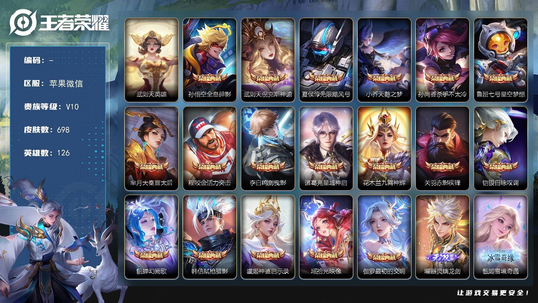 【账号佳】 【可二次实名】苹果WX V10 永恒钻石III段位 126英雄 698皮肤 18典藏 0珍品无双 8无双 7珍品传说 123传说 249史诗大区:苹果WX,营地:495464854,贵族等级:10,【热门皮肤】:,【限定皮肤】:敖隐赤刃凌霄,桑启线条小狗,莱西奥踏浪烽翎,蚩奼极光幻客,空空儿戏梦巡演,孙权径山谋武,虞姬溯影追猎,鲁班七号班班快跑,露娜命运加冕,雅典娜潮玩士官长,阿古朵布丁狗之约,瑶大耳狗之梦,安琪拉酷洛米之心,亚瑟布丁狗之誓,老夫子藏狐·褐绒,张良灵野札记,张飞兔狲·蓬尾,百里守约雪豹·霜爪,苏烈春野闲踪,周瑜雪夜绮愿,公孙离云诺千山,小乔秘证寻踪,狂铁龙之律动,钟馗虚灵犬护,沈梦溪鸭鸭历险记,刘禅鸭鸭历险记,刘备浪漫序章,阿轲化蝶舞,戈娅玫蓝誓约,明世隐景韶洛都,西施续相思,杨玉环星之鸣奏,嫦娥器灵·落星盏,赵怀真器灵·浮梦炉,达摩爆裂喵拳,少司缘灵卦秘语,弈星万物之道,曹操夜都魔契,后羿千劫归真,蔡文姬愿照·福禄聚,妲己愿照·众生和,女娲愿照·千秋盛,司空震愿照·山河定,虞姬愿照·岁时盈,澜愿照·九州拓,裴擒虎祥瑞亨通,姜子牙星梦巡礼,东皇太一金福满堂,西施雪境奇遇,孙策时之奇旅,典韦铁骨偃魂,上官婉儿妄想奇谈,影魅影绮裳,嬴政玄雷天君,孙膑茶境仙,马超访茗客,苍苍林狼骑,太乙真人谧流熔炉,牛魔星界战将,干将莫邪雾都夜雨,吕布逐霄战戟,鲁班七号江户川柯南,马可波罗怪盗基德,百里守约百相守梦,海诺时空谍影,澜逐花归海,王昭君映山客,米莱狄怪诞之夜,老夫子百相守梦,桑启鸣野蒿,艾琳陌上桑,亚瑟动物派对,东皇太一噬灭天穹,李白谪仙醉月,廉颇撼地雄心,盘古敬我三分,亚连破空之剑,弈星炽弈燎原,孙悟空神迹守卫,少司缘涂山红红【荣耀典藏】:武则天,伽罗最初的交响,铠银白咏叹调,关羽赤影疾锋,虞姬神鉴启示录,瑶拾光映像,韩信弑枪猎影,貂蝉幻阙歌,花木兰九霄神辉,诸葛亮星域神启,程咬金活力突击,李白鸣剑·曳影,夏侯惇无限飓风号,武则天倪克斯神谕,孙悟空全息碎影,小乔天鹅之梦,芈月大秦宣太后,孙尚香杀手不太冷,鲁班七号星空梦想【截图或标题展示段位不代表实际段位,赛季更新等不可抗拒因素发生变化、时限道具不保证所剩时间,详情请看截图哦~】