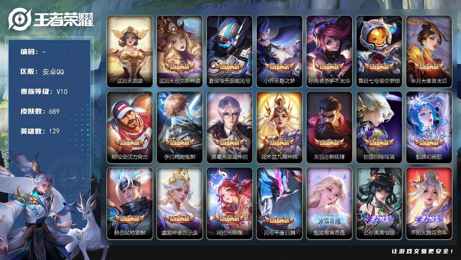 【账号佳】 【可二次实名】zxc(安卓QQ)【128英雄】【689极品皮肤】【17荣耀典藏水晶皮肤】【9无双+4珍品传说+119传说+242史诗+305限定+214勇者等】[超级极品!!!+具体看营地号!!!522503115!!!】【附带V10安卓手游穿越火线+冲了很多钱+双游戏可玩美滋滋【具体细节图往后看有图!!!+CF手游戏营地号:426946010】
