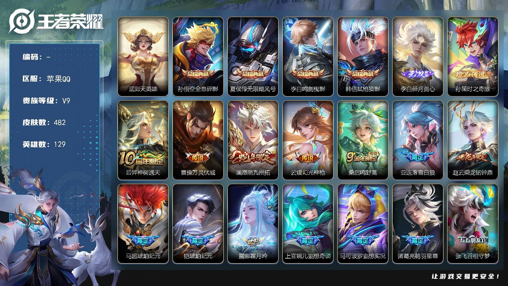 【账号佳】 【可二次实名】(苹果Q) V9 最强王者段位 129英雄 482皮肤 4典藏 0珍品无双 1无双 1珍品传说 42传说 152史诗大区:苹果Q,营地:78725661,贵族等级:9,【热门皮肤】:,【限定皮肤】:鬼谷子谜偶窥秘,廉颇撼地雄心,小乔线条小狗,吕布舞狮寰,周瑜线条小狗,暃埋骨钱,兰陵王雾影缉谜,敖隐赤刃凌霄,虞姬溯影追猎,鲁班七号班班快跑,桑启线条小狗,空空儿戏梦巡演,项羽九幽镇关,百里玄策罗小黑战记,蚩奼极光幻客,曹操逐霄之志,后羿神树通天,少司缘巫礼祀神,艾琳鹤鸣心笺,亚瑟荣光之誓,明世隐往忆晖光,莱西奥光弋星穹,孙权径山谋武,张良罗小黑战记,哪吒罗小黑战记,莱西奥踏浪烽翎,西施织梦人,公孙离涂山容容,鬼谷子克喵,云中君云械蓝图,甄姬逆浪荇歌,后羿石田雨龙,姬小满小满鸭,露娜命运加冕,杨戬潮玩骑兵,扁鹊奇幻香踪,阿古朵布丁狗之约,诸葛亮鹤羽星尊,露娜霜月吟,刘禅鸭鸭历险记,沈梦溪鸭鸭历险记,老夫子藏狐·褐绒,张良灵野札记,百里守约雪豹·霜爪,狂铁龙之律动,苏烈春野闲踪,钟馗虚灵犬护,刘备浪漫序章,戈娅玫蓝誓约,亚连破局者,阿轲化蝶舞,明世隐景韶洛都,戈娅危途狂花,蒙犽胡桃狂想曲,少司缘灵卦秘语,达摩爆裂喵拳,张飞百相守梦,公孙离祈雪灵祝,姬小满妄想食味,赵怀真器灵·浮梦炉,澜愿照·九州拓,姜子牙星梦巡礼,东皇太一金福满堂,西施雪境奇遇,马超神威,典韦铁骨偃魂,太乙真人谧流熔炉,马超访茗客,孙策时之奇旅,上官婉儿妄想奇谈,哪吒逐梦之翼,影魅影绮裳,孙膑茶境仙,夏洛特浮生妄,牛魔星界战将,苍苍林狼骑,百里守约百相守梦,老夫子百相守梦,桑启鸣野蒿,沈梦溪龙舞盛年【荣耀典藏】:武则天,韩信弑枪猎影,夏侯惇无限飓风号,李白鸣剑·曳影,孙悟空全息碎影【截图或标题展示段位不代表实际段位,赛季更新等不可抗拒因素发生变化、时限道具不保证所剩时间,详情请看截图哦~】