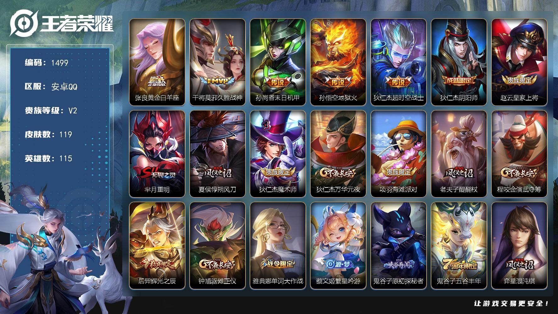 【账号佳】 【可二次实名】可二次 安卓Q-V2-最强王者段位-115英雄-119皮肤-5传说-26史诗【英雄全皮】:孙权全皮【传说皮肤】:张良黄金白羊座,干将莫邪久胜战神,孙尚香末日机甲,孙悟空地狱火,狄仁杰超时空战士【限定皮肤】:狄仁杰阴阳师,赵云皇家上将,芈月重明,夏侯惇朔风刀,狄仁杰魔术师,狄仁杰万华元夜,项羽海滩派对,老夫子醍醐杖,程咬金演武夺筹,后羿辉光之辰,钟馗驱傩正仪,雅典娜单词大作战,蔡文姬繁星吟游,鬼谷子原初探秘者,鬼谷子五谷丰年,弈星混沌棋,明世隐疑决卦,裴擒虎李小龙,狂铁御狮,米莱狄御霄,云中君纤云弄巧,盾山御銮,蒙犽狂想玩偶喵,艾琳女武神【年限皮肤】:后羿辉光之辰【赛季限定】:芈月重明,狂铁御狮,米莱狄御霄,盾山御銮,夏侯惇朔风刀,弈星混沌棋,明世隐疑决卦,老夫子醍醐杖,鬼谷子原初探秘者,狄仁杰万华元夜,程咬金演武夺筹,钟馗驱傩正仪,太乙真人谧流熔炉,钟馗虚灵犬护,甄姬逆浪荇歌,亚瑟荣光之誓【战令限定】:蒙犽狂想玩偶喵,雅典娜单词大作战,周瑜百相守梦,孙策百相守梦,周瑜线条小狗【史诗皮肤】:周瑜线条小狗,女娲万灵启世,公孙离涂山容容,黄忠百相守梦,周瑜百相守梦,狂铁龙之律动,鬼谷子五谷丰年,云中君纤云弄巧,裴擒虎李小龙,蒙犽狂想玩偶喵,蔡文姬繁星吟游,狄仁杰鹰眼统帅,孙策猫狗日记,程咬金功夫厨神,李元芳逐浪之夏,刘禅天才门将,铠曙光守护者,百里守约特工魅影,后羿辉光之辰,诸葛亮黄金分割率,兰陵王暗隐猎兽者,吕布圣诞狂欢,妲己魅力维加斯,孙尚香水果甜心,宫本武藏鬼剑武藏,狄仁杰魔术师,赵云皇家上将【其他皮肤】:兰陵王雾影缉谜,艾琳鹤鸣心笺,孙权径山谋武,亚瑟荣光之誓,哪吒罗小黑战记,莱西奥踏浪烽翎,庄周锦麟游梦,孙策百相守梦,甄姬逆浪荇歌,白起死霸装,钟馗虚灵犬护,典韦铁骨偃魂,太乙真人谧流熔炉,苍苍林狼骑,海诺时空谍影,妲己紫罗兰之誓,鲁班大师乓乓大师,钟馗驱傩正仪,张良缤纷绘卷,程咬金演武夺筹,杨戬次元傲视,狄仁杰万华元夜,雅典娜单词大作战,鬼谷子原初探秘者,老夫子醍醐杖,明世隐疑决卦,弈星混沌棋,夏侯惇朔风刀,姜子牙炽热元素使,沈梦溪鲨炮海盗猫,盾山御銮,米莱狄御霄,项羽科学大爆炸,大乔守护之力,苏烈坚韧之力,安琪拉如懿,狂铁御狮,诸葛亮掌控之力,孙尚香沉稳之力,芈月重明,钟无艳海滩丽影,关羽龙腾万里,狄仁杰阴阳师,宫本武藏万象初新,甄姬花好人间,张飞五福同心,花木兰兔女郎,达摩拳王,亚瑟死亡骑士,典韦黄金武士,妲己少女阿狸,姜子牙时尚教父,扁鹊救世之瞳,扁鹊化身博士,白起白色死神,艾琳女武神,芈月红桃皇后,赵云忍炎影,达摩大发明家,韩信街头霸王,韩信教廷特使,项羽海滩派对,司空震启蛰,云中君荷鲁斯之眼,盘古创世神祝,李信灼热之刃,沈梦溪棒球奇才,伽罗花见巫女,弈星踏雪寻梅,百里玄策威尼斯狂欢,铠龙域领主,干将莫邪第七人偶,东皇太一东海龙王,马可波罗激情绿茵,夏侯惇战争骑士,虞姬加勒比小姐,李白范海辛,兰陵王隐刃,周瑜海军大将,孙悟空西部大镖客,小乔万圣前夜,曹操死神来了,狄仁杰锦衣卫,貂蝉异域舞娘,项羽帝国元帅,鲁班七号木偶奇遇记,鲁班七号福禄兄弟【内测皮肤】:艾琳女武神【营地ID】:530947879各种道具详情看截图、低价出售找回包 赔、截图展示段位不代 表实际段位,如赛季更新等不可抗拒因素发生变化、时限道具不保证所剩时间、标题未写送点劵默认不送【卖号买号首选亿梦】