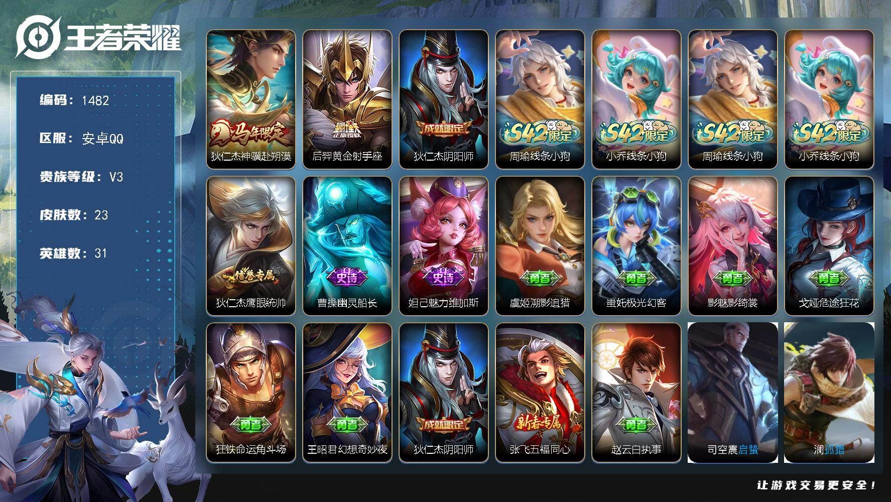 【账号佳】 【可二次实名】【wz494】【商品标题】:安卓Q-V3-至尊星耀III段位-123英雄-226皮肤-0典藏-0珍品无双-0无双-4珍品传说-7传说-65史诗 【珍品传说】:马可波罗怪盗基德,鲁班七号江户川柯南,孙策时之奇旅,嫦娥器灵落星盏 【传说皮肤】:虞姬愿照岁时盈,云缨幻光神枪,周瑜音你心动,诸葛亮时雨天司,铠绛天战甲,貂蝉猫影幻舞,干将莫邪久胜战神 【限定皮肤】:白起狰,狄仁杰阴阳师,虞姬凯尔特女王,赵云皇家上将,墨子神迹守卫,嬴政白昼王子,孙尚香蔷薇恋人,庄周蜃楼王,庄周高山流水,高渐离死亡摇滚,阿轲迷踪丽影,孙膑妖精王,扁鹊炼金王,芈月重明,芈月白晶晶,吕布猎兽之王,周瑜赤莲之焰,元歌云间偶戏,夏侯惇朔风刀,曹操烛龙,典韦穷奇,典韦蓝屏警告,马可波罗暗影游猎,狄仁杰魔术师,狄仁杰万华元夜,达摩星际陆战队,达摩沙漠行僧,项羽海滩派对,老夫子醍醐杖,老夫子航海奇遇记,关羽冰锋战神,程咬金演武夺筹,刘邦夺宝奇兵,韩信逐梦之影,兰陵王驯魔猎人,兰陵王金庭之子,亚瑟狮心王,亚瑟潮玩骑士王,孙悟空孙行者,牛魔御旌,后羿圣弓游侠,李元芳云中旅人,钟馗驱傩正仪,女娲朔望之晖,干将莫邪冰霜恋舞曲,干将莫邪真爱魔法,雅典娜单词大作战,雅典娜黎明之约,太乙真人饕餮,鬼谷子原初探秘者,诸葛亮时雨天司,黄忠烈魂,苏烈千军破阵,百里玄策原初追逐者,百里守约朱雀志,弈星混沌棋,梦奇顽趣,公孙离玉兔公主,沈梦溪大漠名商,明世隐疑决卦,裴擒虎李小龙,裴擒虎擒涛扼浪,狂铁御狮,米莱狄御霄,米莱狄胡桃异想国,云中君纤云弄巧,盾山御銮,猪八戒西部大镖客,猪八戒猪悟能,上官婉儿天狼绘梦者,嫦娥拒霜思,蒙犽狂想玩偶喵,镜匿光追影者,桑启海盐诗旅,张良古海寻踪,鬼谷子天穹祈灯 【年限皮肤】:百里守约朱雀志,诸葛亮时雨天司,黄忠烈魂 【赛季限定】:庄周蜃楼王,孙膑妖精王,扁鹊炼金王,白起狰,芈月重明,夏侯惇朔风刀,曹操烛龙,典韦穷奇,狄仁杰万华元夜,达摩沙漠行僧,老夫子醍醐杖,程咬金演武夺筹,兰陵王金庭之子,张良古海寻踪,亚瑟狮心王,牛魔御旌,李元芳云中旅人,虞姬凯尔特女王,钟馗驱傩正仪,雅典娜黎明之约,太乙真人饕餮,鬼谷子原初探秘者,苏烈千军破阵,百里玄策原初追逐者,弈星混沌棋,梦奇顽趣,沈梦溪大漠名商,明世隐疑决卦,裴擒虎擒涛扼浪,狂铁御狮,米莱狄御霄,盾山御銮,桑启海盐诗旅,鬼谷子天穹祈灯 【战令限定】:墨子神迹守卫,嬴政白昼王子,阿轲迷踪丽影,吕布猎兽之王,周瑜赤莲之焰,元歌云间偶戏,典韦蓝屏警告,马可波罗暗影游猎,达摩星际陆战队,老夫子航海奇遇记,刘邦夺宝奇兵,兰陵王驯魔猎人,亚瑟潮玩骑士王,后羿圣弓游侠,女娲朔望之晖,干将莫邪真爱魔法,雅典娜单词大作战,米莱狄胡桃异想国,猪八戒西部大镖客,蒙犽狂想玩偶喵 【史诗皮肤】:鲁班七号电玩小子,赵云皇家上将,赵云未来纪元,甄姬冰雪圆舞曲,王昭君偶像歌手,狄仁杰魔术师,孙尚香蔷薇恋人,孙尚香水果甜心,妲己魅力维加斯,墨子金属风暴,吕布圣诞狂欢,李白千年之狐,吕布末日机甲,关羽冰锋战神,花木兰水晶猎龙者,刘邦德古拉伯爵,韩信逐梦之影,夏侯惇乘风破浪,兰陵王暗隐猎兽者,诸葛亮黄金分割率,亚瑟心灵战警,雅典娜冰冠公主,百里守约特工魅影,刘禅天才门将,白起星夜王子,嬴政白昼王子,孙策猫狗日记,百里守约朱雀志,干将莫邪冰霜恋舞曲,典韦蓝屏警告,伽罗箭羽风息,狄仁杰鹰眼统帅,兰陵王驯魔猎人,不知火舞魅语,阿轲迷踪丽影,瑶遇见神鹿,黄忠烈魂,上官婉儿天狼绘梦者,马可波罗暗影游猎,蒙犽狂想玩偶喵,百里玄策原初追逐者,裴擒虎李小龙,云中君纤云弄巧,元歌云间偶戏,芈月白晶晶,米莱狄胡桃异想国,老夫子航海奇遇记,干将莫邪真爱魔法,沈梦溪月团寄思,安琪拉时之奇旅,孙悟空孙行者,猪八戒猪悟能,庄周高山流水,嫦娥拒霜思,镜匿光追影者,雅典娜黎明之约,公孙离玉兔公主,澜赏金猎手,梦奇顽趣,百里守约百相守梦,白起苍鳞隐世,阿轲化蝶舞,刘禅鸭鸭历险记,狂铁龙之律动,百里守约雪豹霜爪 【其他皮肤】:项羽海滩派对,韩信教廷特使,韩信街头霸王,露娜哥特玫瑰,阿轲爱心护理,武则天东方不败,扁鹊化身博士,安琪拉玩偶对对碰,孙膑天使之翼,妲己少女阿狸,典韦黄金武士,亚瑟死亡骑士,达摩拳王,花木兰兔女郎,张飞五福同心,刘备万事如意,宫本武藏万象初新,亚瑟狮心王,后羿阿尔法小队,狄仁杰阴阳师,庄周蜃楼王,刘备纽约教父,高渐离死亡摇滚,孙膑妖精王,刘备汉昭烈帝,扁鹊炼金王,关羽龙腾万里,虞姬凯尔特女王,白起狰,钟无艳海滩丽影,太乙真人饕餮,宫本武藏霸王丸,曹操烛龙,王昭君幻想奇妙夜,芈月重明,老夫子功夫老勺,牛魔制霸全明星,孙尚香沉稳之力,典韦穷奇,诸葛亮掌控之力,鬼谷子幻乐之宴,狂铁御狮,苏烈坚韧之力,米莱狄御霄,吕布猎兽之王,明世隐虹云星官,牛魔御旌,女娲朔望之晖,小乔