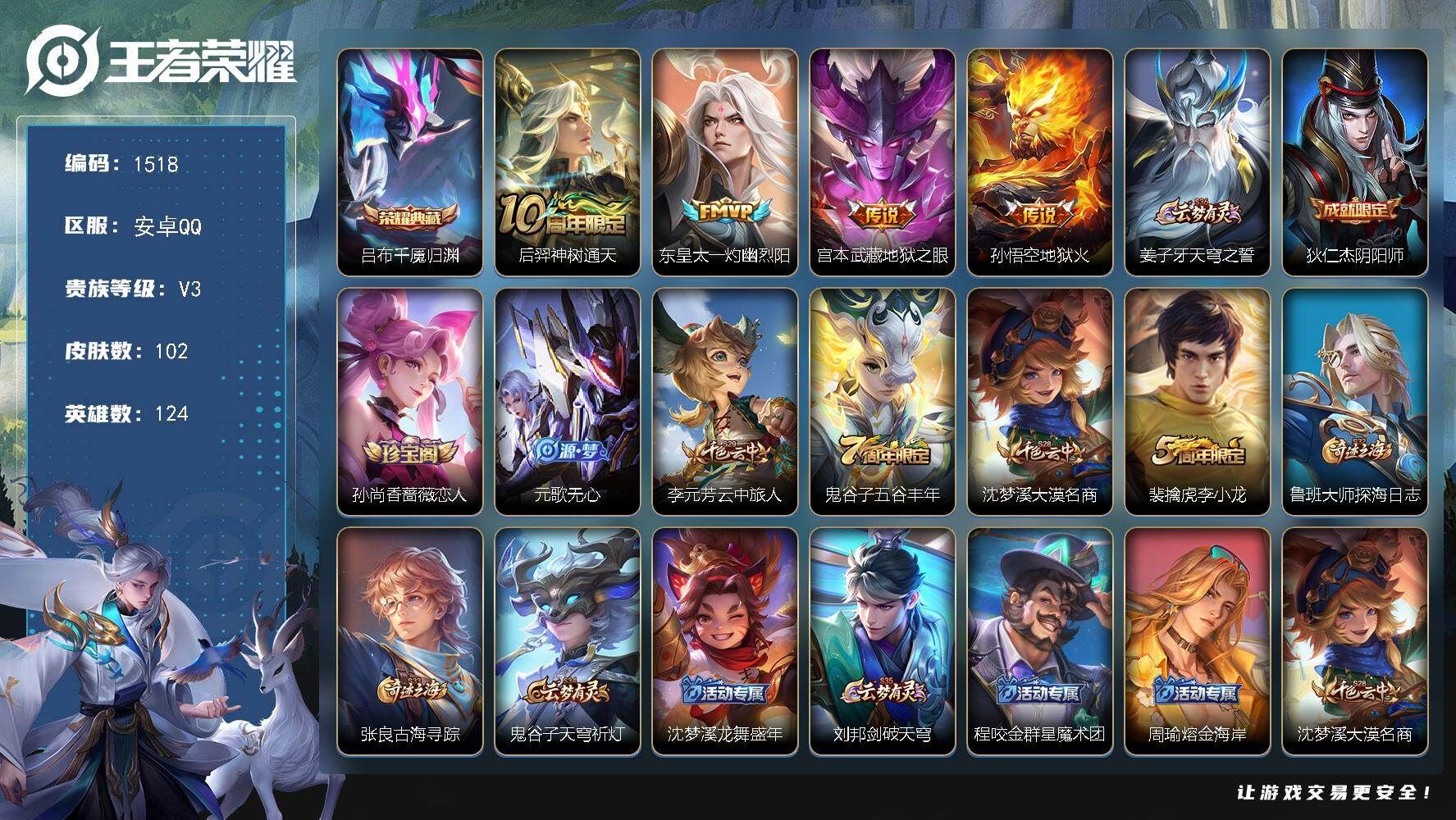 【账号佳】 【可二次实名】可二次安卓Q【营地:1786903843】-V3-最强王者段位-124英雄-102皮肤-1典藏皮肤-4传说-23史诗【英雄全皮】:孙权全皮【荣耀典藏】:吕布千魇归渊【传说皮肤】:后羿神树通天,东皇太一灼幽烈阳,宫本武藏地狱之眼,孙悟空地狱火【限定皮肤】:姜子牙天穹之誓,狄仁杰阴阳师,孙尚香蔷薇恋人,元歌无心,李元芳云中旅人,鬼谷子五谷丰年,沈梦溪大漠名商,裴擒虎李小龙,鲁班大师探海日志,张良古海寻踪,鬼谷子天穹祈灯,沈梦溪龙舞盛年,刘邦剑破天穹,程咬金群星魔术团,周瑜熔金海岸,各种道具详情看截图、低价出售找回包 赔、截图展示段位不代 表实际段位,如赛季更新等不可抗拒因素发生变化、时限道具不保证所剩时间、标题未写送点劵默认不送【卖号买号首选亿梦】