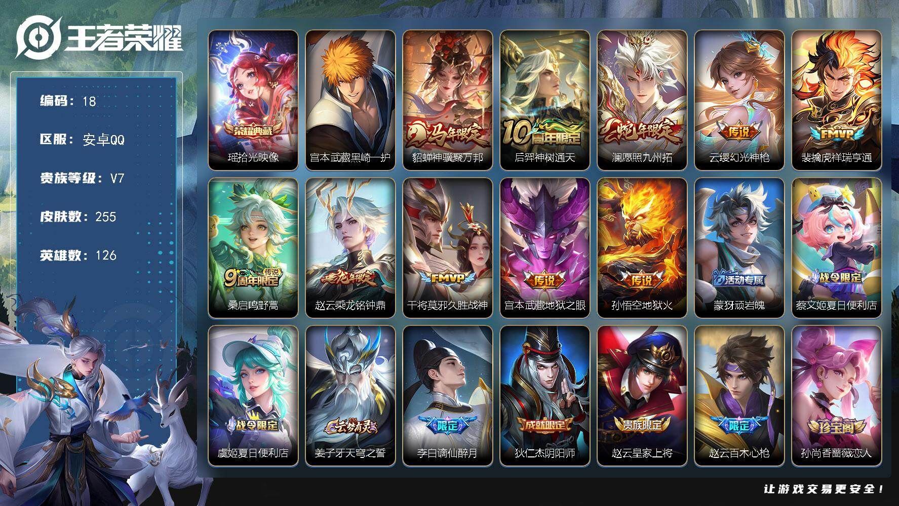 【账号佳】 【可二次实名】可二次安卓Q【营地:1712869062】-V7-最强王者段位-126英雄-255皮肤-1典藏皮肤-1珍品传说-10传说-78史诗【英雄全皮】:孙权全皮,敖隐全皮,空空儿全皮【荣耀典藏】:瑶拾光映像【珍品传说】:宫本武藏黑崎一护【传说皮肤】:貂蝉神骥聚万邦,后羿神树通天,澜愿照九州拓,云缨幻光神枪,裴擒虎祥瑞亨通,桑启鸣野蒿,赵云乘龙铭钟鼎,干将莫邪久胜战神,宫本武藏地狱之眼,孙悟空地狱火【史诗皮肤】:周瑜线条小狗,小乔线条小狗,项羽九幽镇关,少司缘巫礼祀神,莱西奥光弋星穹,公孙离涂山容容,朵莉亚幻珠鲛人,黄忠百相守梦,云缨赞萌露比,周瑜百相守梦,后羿石田雨龙,狂铁龙之律动,刘禅鸭鸭历险记,阿轲化蝶舞,弈星万物之道,白起苍鳞隐世,孙膑茶境仙,牛魔星界战将,百里守约百相守梦,艾琳陌上桑,李白谪仙醉月,亚连破空之剑,蒙犽顽岩魄,蔡文姬夏日便利店,黄忠怒海争锋,关羽决胜骁骑,镜青焰无极,鲁班七号蔬乡物语,高渐离燃音魔法,妲己灵卜魔法,阿古朵江河有灵,戈娅驭风魔法,马可波罗山海玄木吟,鬼谷子五谷丰年,澜赏金猎手,赵云百木心枪,韩信傲雪梅枪,杨戬天秀启明,云中君纤云弄巧,裴擒虎李小龙,百里玄策原初追逐者,蒙犽狂想玩偶喵,橘右京修罗,阿轲迷踪丽影,小乔青蛇,李元芳银河之约,上官婉儿梁祝,狄仁杰鹰眼统帅,典韦蓝屏警告,大乔猫狗日记,孙策猫狗日记,白起星夜王子,程咬金功夫厨神,李元芳逐浪之夏,刘禅天才门将,蔡文姬舞动绿茵,铠曙光守护者,百里守约特工魅影,安琪拉心灵骇客,兰陵王暗隐猎兽者,小乔缤纷独角兽,夏侯惇乘风破浪,刘邦德古拉伯爵,花木兰水晶猎龙者,张飞乱世虎臣,李白千年之狐,曹操幽灵船长,墨子金属风暴,墨子龙骑士,妲己女仆咖啡,孙尚香水果甜心,孙尚香蔷薇恋人,宫本武藏鬼剑武藏,廉颇地狱岩魂,狄仁杰魔术师,王昭君偶像歌手,甄姬冰雪圆舞曲,貂蝉圣诞恋歌,赵云皇家上将,露娜紫霞仙子,各种道具详情看截图、低价出售找回包 赔、截图展示段位不代 表实际段位,如赛季更新等不可抗拒因素发生变化、时限道具不保证所剩时间、标题未写送点劵默认不送【卖号买号首选亿梦】