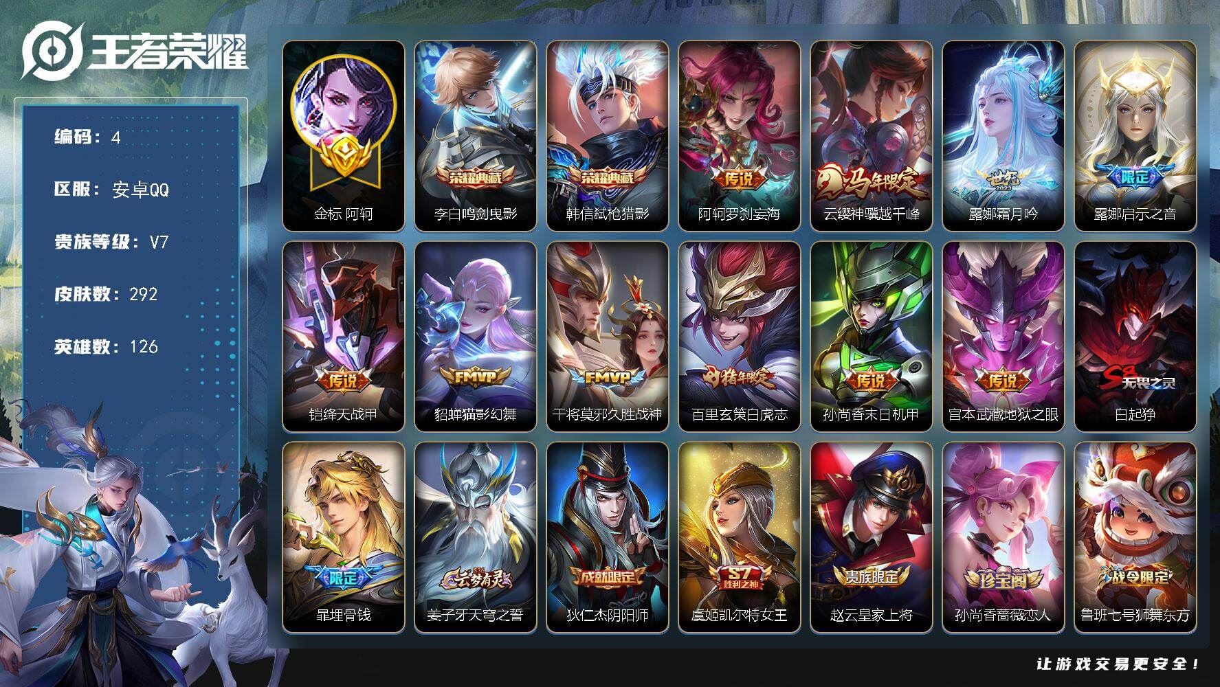 【账号佳】 【可二次实名】可二次安卓Q【营地:479775665】-V7-最强王者段位-126英雄-292皮肤-2典藏皮肤-10传说-84史诗【金标】:金标阿轲【一颗荣耀水晶】【英雄全皮】:露娜全皮,孙权全皮,影全皮【荣耀典藏】:李白鸣剑曳影,韩信弑枪猎影【传说皮肤】:阿轲罗刹妄海,云缨神骥越千峰,露娜霜月吟,露娜启示之音,铠绛天战甲,貂蝉猫影幻舞,干将莫邪久胜战神,百里玄策白虎志,孙尚香末日机甲,宫本武藏地狱之眼【史诗皮肤】:钟馗锁墨魂,周瑜线条小狗,项羽九幽镇关,女娲万灵启世,百里玄策罗小黑战记,公孙离涂山容容,西施织梦人,黄忠百相守梦,云缨赞萌露比,扁鹊灵蛊蚀心,狂铁龙之律动,阿轲化蝶舞,牛魔星界战将,暃埋骨钱,姬小满妄想食味,蒙恬荣光圣徽,阿古朵江河有灵,梦奇顽趣,元歌无心,鬼谷子五谷丰年,澜赏金猎手,夏洛特永昼,韩信傲雪梅枪,雅典娜黎明之约,镜匿光追影者,嫦娥拒霜思,庄周高山流水,猪八戒猪悟能,百里玄策热力回旋,云中君纤云弄巧,裴擒虎李小龙,百里玄策原初追逐者,蒙犽狂想玩偶喵,马可波罗暗影游猎,橘右京修罗,不知火舞魅语,韩信飞衡,娜可露露晚萤,李元芳银河之约,蔡文姬繁星吟游,上官婉儿梁祝,兰陵王驯魔猎人,狄仁杰鹰眼统帅,鲁班七号狮舞东方,伽罗箭羽风息,典韦蓝屏警告,露娜一生所爱,百里守约朱雀志,孙策猫狗日记,杨玉环遇见飞天,阿轲节奏热浪,白起星夜王子,程咬金功夫厨神,李元芳逐浪之夏,刘禅天才门将,安琪拉心灵骇客,雅典娜冰冠公主,甄姬游园惊梦,诸葛亮黄金分割率,兰陵王暗隐猎兽者,小乔缤纷独角兽,夏侯惇乘风破浪,刘邦德古拉伯爵,花木兰水晶猎龙者,孙悟空至尊宝,张飞乱世虎臣,吕布末日机甲,李白千年之狐,曹操幽灵船长,吕布圣诞狂欢,墨子金属风暴,嬴政摇滚巨星,嬴政暗夜贵公子,孙尚香水果甜心,孙尚香蔷薇恋人,宫本武藏鬼剑武藏,廉颇地狱岩魂,狄仁杰魔术师,王昭君偶像歌手,甄姬冰雪圆舞曲,貂蝉圣诞恋歌,赵云未来纪元,赵云皇家上将,阿轲暗夜猫娘,露娜紫霞仙子,各种道具详情看截图、低价出售找回包 赔、截图展示段位不代 表实际段位,如赛季更新等不可抗拒因素发生变化、时限道具不保证所剩时间、标题未写送点劵默认不送【卖号买号首选亿梦】