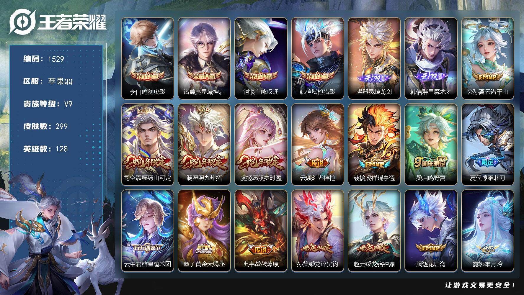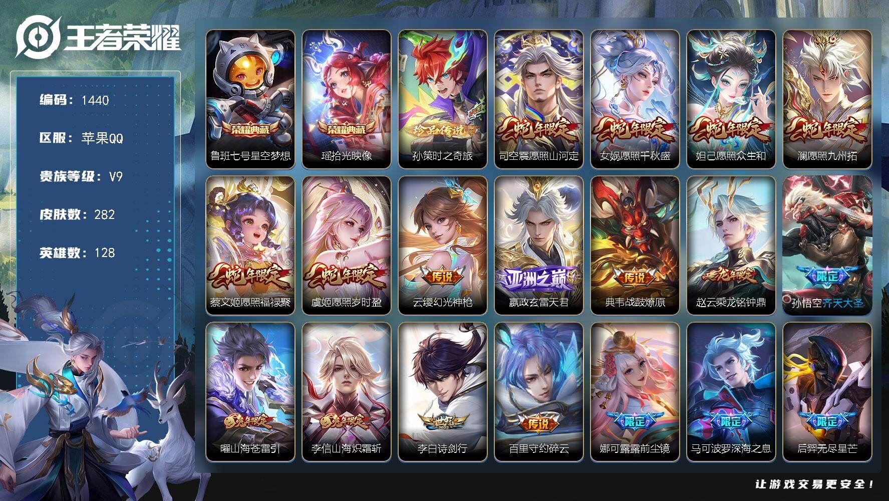 【账号佳】 【可二次实名】可二次 苹果Q-V9-至尊星耀IV段位-128英雄-299皮肤-4典藏皮肤-2无双-44传说-72史诗【英雄全皮】:孙权全皮,敖隐全皮,曜全皮,澜全皮【荣耀典藏】:李白鸣剑曳影,诸葛亮星域神启,铠银白咏叹调,韩信弑枪猎影【无双皮肤】:曜器灵螭龙剑,韩信群星魔术团【传说皮肤】:公孙离云诺千山,司空震愿照山河定,澜愿照九州拓,虞姬愿照岁时盈,云缨幻光神枪,裴擒虎祥瑞亨通,桑启鸣野蒿,夏侯惇霜北刀,云中君群星魔术团,墨子黄金天蝎座,典韦战鼓燎原,孙策乘龙淬吴钩,赵云乘龙铭钟鼎,澜逐花归海,露娜霜月吟,大乔时之奇旅,宫本武藏惊梅引,澜电玩雷克斯,花木兰燃星之曲,孙悟空齐天大圣,曜山海苍雷引,李信山海炽霜斩,吕布怒海麟威,狄仁杰神器狴犴令,马可波罗深海之息,孙策挚爱之约,孙策末日机甲,赵云淬星耀世,曜李逍遥 ,铠绛天战甲,虞姬启明星使,孙悟空零号赤焰,曜云鹰飞将,李信一念神魔,刘备时之恋人,貂蝉猫影幻舞,干将莫邪久胜战神,达摩黄金狮子座,花木兰冠军飞将,梦奇胖达荣荣,后羿黄金射手座,杨戬永曜之星,孙尚香末日机甲,宫本武藏地狱之眼【限定皮肤】:夏侯惇霜北刀,蔡文姬夏日便利店,虞姬夏日便利店,姜子牙天穹之誓,狄仁杰阴阳师,赵云皇家上将,赵云龙胆,赵云百木心枪,白起夜都怪侠,芈月幻夜卜梦,夏侯惇朔风刀,夏侯惇匿光决锋者,甄姬落雪兰心,马可波罗暗影游猎,马可波罗深海之息,马可波罗山海玄木吟,狄仁杰魔术师,狄仁杰神器狴犴令,达摩沙漠行僧,项羽海滩派对,老夫子醍醐杖,韩信傲雪梅枪,兰陵王金庭之子,花木兰燃星之曲,孙悟空零号赤焰,孙悟空齐天大圣,后羿辉光之辰,李元芳匿光侦查者,李元芳云中旅人,虞姬启明星使,杨戬永曜之星,大乔时之奇旅,黄忠烈魂,黄忠火炮绅士,弈星混沌棋,沈梦溪大漠名商,明世隐吟游魔法,裴擒虎擒涛扼浪,米莱狄御霄,李信山海炽霜斩,盾山御銮,孙策挚爱之约,嫦娥暖冬兔眠,曜李逍遥 ,曜山海苍雷引,盘古冰霜神祇,桑启海盐诗旅,暃星界游侠,张良古海寻踪,高渐离燃音魔法,妲己灵卜魔法,鬼谷子天穹祈灯,伽罗琥珀纪元,姬小满妄想食味,孙策乘龙淬吴钩,赵云乘龙铭钟鼎,百里玄策超元猎域,沈梦溪龙舞盛年,鲁班七号蔬乡物语,李元芳蔬乡物语,刘邦剑破天穹,上官婉儿群星魔术团,程咬金群星魔术团,韩信群星魔术团,云中君群星魔术团,镜青焰无极,项羽苍威无极,刘备异域游侠,周瑜熔金海岸【年限皮肤】:杨戬永曜之星,后羿辉光之辰,曜山海苍雷引,李信山海炽霜斩,马可波罗山海玄木吟,孙策乘龙淬吴钩,赵云乘龙铭钟鼎,司空震愿照山河定,澜愿照九州拓,虞姬愿照岁时盈【赛季限定】:米莱狄御霄,盾山御銮,夏侯惇朔风刀,弈星混沌棋,老夫子醍醐杖,达摩沙漠行僧,兰陵王金庭之子,沈梦溪大漠名商,李元芳云中旅人,桑启海盐诗旅,裴擒虎擒涛扼浪,张良古海寻踪,鬼谷子天穹祈灯,刘邦剑破天穹,姜子牙天穹之誓,太乙真人谧流熔炉,钟馗虚灵犬护,甄姬逆浪荇歌,亚瑟荣光之誓,牛魔星界战将,项羽九幽镇关【战令限定】:马可波罗暗影游猎,黄忠火炮绅士,芈月幻夜卜梦,明世隐吟游魔法,白起夜都怪侠,甄姬落雪兰心,暃星界游侠,嫦娥暖冬兔眠,高渐离燃音魔法,妲己灵卜魔法,鲁班七号蔬乡物语,李元芳蔬乡物语,镜青焰无极,项羽苍威无极,蔡文姬夏日便利店,虞姬夏日便利店,老夫子百相守梦,孙膑茶境仙,马超访茗客,莱西奥光弋星穹,明世隐往忆晖光,周瑜线条小狗【史诗皮肤】:周瑜线条小狗,项羽九幽镇关,莱西奥光弋星穹,黄忠百相守梦,钟无艳戍鼓铭心,狂铁龙之律动,阿轲化蝶舞,苍狼魂孤将,孙膑茶境仙,牛魔星界战将,马可波罗星界特工,蔡文姬夏日便利店,镜青焰无极,上官婉儿群星魔术团,鲁班七号蔬乡物语,百里玄策超元猎域,姬小满妄想食味,伽罗琥珀纪元,高渐离燃音魔法,妲己灵卜魔法,李元芳匿光侦查者,盘古冰霜神祇,马可波罗山海玄木吟,暃星界游侠,夏侯惇匿光决锋者,明世隐吟游魔法,澜赏金猎手,赵云百木心枪,夏洛特永昼,哪吒雪上飞焰,韩信傲雪梅枪,黄忠火炮绅士,杨戬天秀启明,马可波罗暗影游猎,孙尚香时之恋人,黄忠烈魂,赵云龙胆,橘右京修罗,不知火舞魅语,狄仁杰鹰眼统帅,伽罗箭羽风息,孙策猫狗日记,阿轲节奏热浪,白起星夜王子,程咬金功夫厨神,李元芳逐浪之夏,蔡文姬舞动绿茵,百里守约特工魅影,后羿辉光之辰,雅典娜冰冠公主,亚瑟心灵战警,兰陵王暗隐猎兽者,各种道具详情看截图、低价出售找回包 赔、截图展示段位不代 表实际段位,如赛季更新等不可抗拒因素发生变化、时限道具不保证所剩时间、标题未写送点劵默认不送【卖号买号首选亿梦】