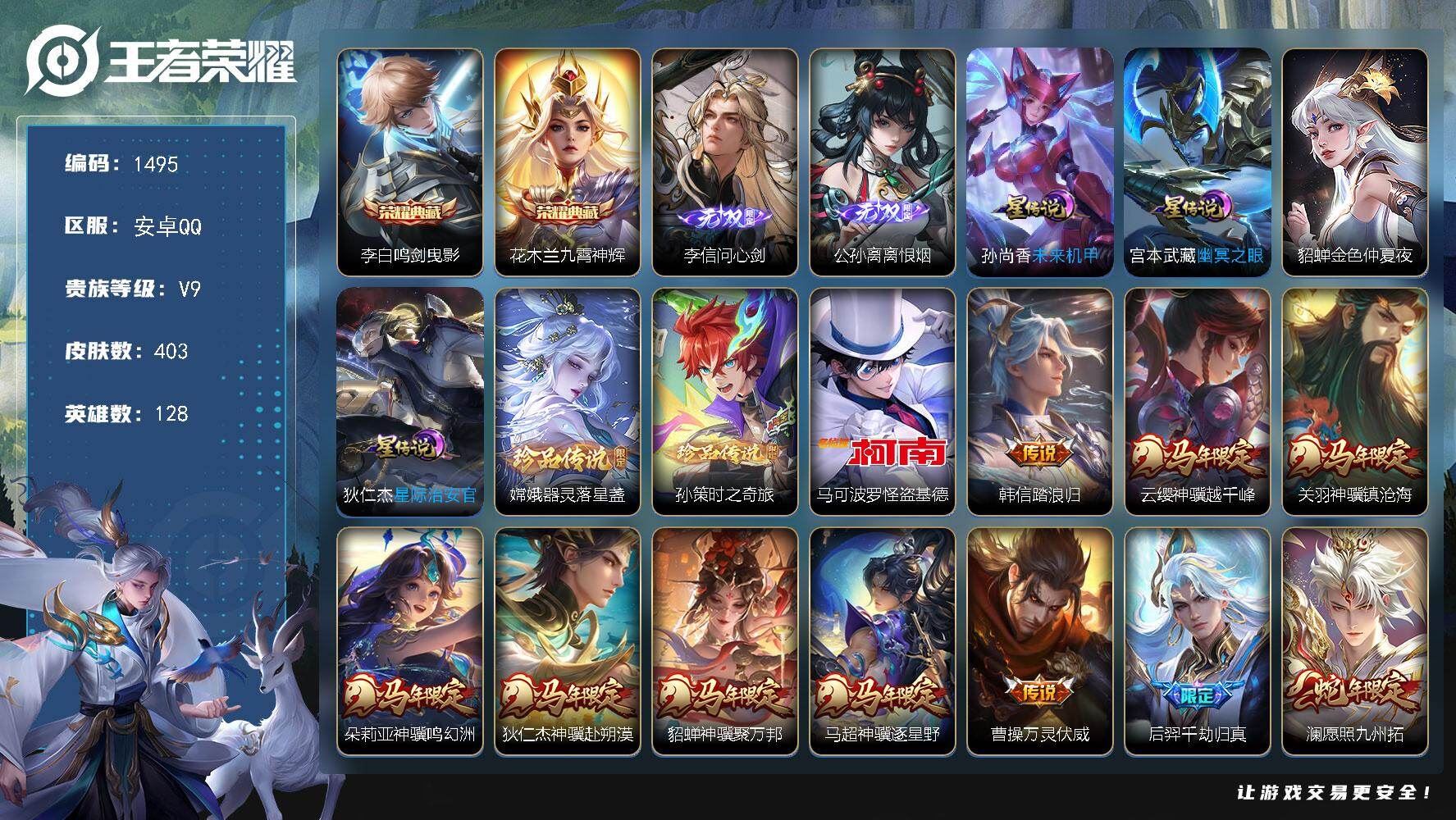 【账号佳】 【可二次实名】可二次安卓Q-V9-最强王者段位-128英雄-358皮肤-1典藏皮肤-1无双-3珍品传说-48传说-118史诗【英雄全皮】:孙权全皮,苍全皮,亚连全皮,敖隐全皮,夏洛特全皮,司空震全皮,空空儿全皮,海诺全皮【荣耀典藏】:铠银白咏叹调【无双皮肤】:曜器灵螭龙剑【珍品传说】:张飞兔狲蓬尾,嫦娥器灵落星盏,马可波罗怪盗基德【营地ID】:53060131【传说皮肤】:狄仁杰神骥赴朔漠,后羿神树通天,司空震愿照山河定,女娲愿照千秋盛,妲己愿照众生和,澜愿照九州拓,蔡文姬愿照福禄聚,虞姬愿照岁时盈,云缨幻光神枪,嬴政玄雷天君,王昭君映山客,桑启鸣野蒿,庄周牧神诗旅,夏侯惇霜北刀,亚连落雪白狼,孙尚香乘龙问璇玑,孙策乘龙淬吴钩,赵云乘龙铭钟鼎,诸葛亮鹤羽星尊,夏洛特浮生妄,干将莫邪画中仙,项羽无限倾心,伽罗炽翼辉光,曜山海苍雷引,李信山海炽霜斩,吕布怒海麟威,李白诗剑行,不知火舞绯月行,百里守约碎云,马可波罗深海之息,马超无双飞将,孙策末日机甲,裴擒虎寅虎赤拳,鲁班七号寅虎瑞焰,孙尚香异界灵契,周瑜音你心动,李元芳飞鸢探春,虞姬启明星使,曜云鹰飞将,李信一念神魔,张良黄金白羊座,干将莫邪久胜战神,虞姬云霓雀翎,达摩黄金狮子座,花木兰冠军飞将,后羿黄金射手座,诸葛亮武陵仙君,宫本武藏地狱之眼【限定皮肤】:白起狰,夏侯惇霜北刀,蔡文姬夏日便利店,虞姬夏日便利店,姜子牙天穹之誓,李白谪仙醉月,狄仁杰阴阳师,廉颇寅虎御盾,赵云皇家上将,赵云引擎之心,嬴政优雅恋人,孙尚香异界灵契,鲁班七号寅虎瑞焰,庄周高山流水,高渐离玩趣恶龙,钟无艳超时空战士,孙膑寅虎展翼,白起夜都怪侠,芈月重明,芈月幻夜卜梦,吕布御风骁将,周瑜真爱至上,周瑜赤莲之焰,夏侯惇朔风刀,甄姬游园惊梦,甄姬落雪兰心,曹操烛龙,典韦穷奇,马可波罗暗影游猎,马可波罗深海之息,马可波罗山海玄木吟,狄仁杰魔术师,狄仁杰万华元夜,达摩沙漠行僧,项羽海滩派对,项羽无限倾心,老夫子醍醐杖,老夫子航海奇遇记,程咬金演武夺筹,韩信傲雪梅枪,兰陵王金庭之子,不知火舞绯月行,孙悟空至尊宝,孙悟空孙行者,后羿圣弓游侠,李元芳银河之约,李元芳云中旅人,虞姬启明星使,钟馗驱傩正仪,杨玉环遇见飞天,杨玉环寅虎心曲,干将莫邪真爱魔法,干将莫邪画中仙,鬼谷子原初探秘者,鬼谷子五谷丰年,诸葛亮武陵仙君,诸葛亮鹤羽星尊,黄忠火炮绅士,苏烈千军破阵,百里玄策原初追逐者,弈星混沌棋,梦奇顽趣,公孙离玉兔公主,沈梦溪大漠名商,明世隐疑决卦,裴擒虎李小龙,裴擒虎寅虎赤拳,裴擒虎擒涛扼浪,狂铁御狮,米莱狄御霄,李信山海炽霜斩,伽罗炽翼辉光,盾山御銮,猪八戒猪悟能,上官婉儿梁祝,嫦娥拒霜思,嫦娥暖冬兔眠,曜山海苍雷引,蒙犽狂想玩偶喵,鲁班大师探海日志,镜匿光追影者,桑启海盐诗旅,夏洛特浮生妄,暃星界游侠,司空震地狱燃心,阿古朵江河有灵,张良古海寻踪,蒙犽百解令,蒙恬荣光圣徽,高渐离燃音魔法,妲己灵卜魔法,鬼谷子天穹祈灯,伽罗琥珀纪元,姬小满妄想食味,大乔乘龙忆丹青,安琪拉乘龙聚宝船,孙尚香乘龙问璇玑,孙策乘龙淬吴钩,赵云乘龙铭钟鼎,亚连落雪白狼,沈梦溪龙舞盛年,刘邦剑破天穹,程咬金群星魔术团,镜青焰无极,项羽苍威无极,海诺心动手记,周瑜熔金海岸【年限皮肤】:吕布御风骁将,裴擒虎寅虎赤拳,鲁班七号寅虎瑞焰,孙膑寅虎展翼,廉颇寅虎御盾,杨玉环寅虎心曲,曜山海苍雷引,李信山海炽霜斩,马可波罗山海玄木吟,孙尚香乘龙问璇玑,孙策乘龙淬吴钩,赵云乘龙铭钟鼎,大乔乘龙忆丹青,安琪拉乘龙聚宝船,司空震愿照山河定,女娲愿照千秋盛,妲己愿照众生和,澜愿照九州拓,蔡文姬愿照福禄聚,虞姬愿照岁时盈,各种道具详情看截图、低价出售找回包 赔、截图展示段位不代 表实际段位,如赛季更新等不可抗拒因素发生变化、时限道具不保证所剩时间、标题未写送点劵默认不送【卖号买号首选亿梦】
