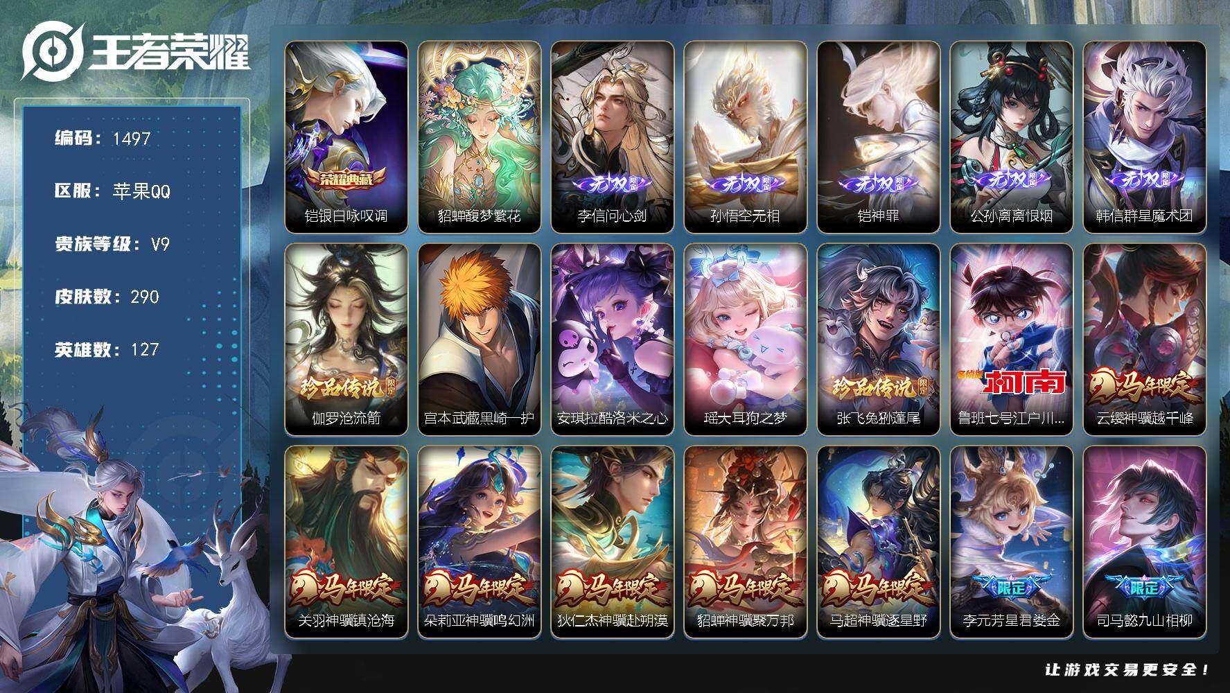 【账号佳】 【可二次实名】可二次 苹果Q-V9-最强王者段位-127英雄-290皮肤-1典藏皮肤-1珍品无双-5无双-6珍品传说-48传说-87史诗【英雄全皮】:司马懿全皮,孙权全皮,空空儿全皮【荣耀典藏】:铠银白咏叹调【珍品无双】:貂蝉馥梦繁花【无双皮肤】:李信问心剑,孙悟空无相,铠神罪,公孙离离恨烟,韩信群星魔术团【珍品传说】:伽罗沧流箭,宫本武藏黑崎一护,安琪拉酷洛米之心,瑶大耳狗之梦,张飞兔狲蓬尾,鲁班七号江户川柯南【传说皮肤】:云缨神骥越千峰,关羽神骥镇沧海,朵莉亚神骥鸣幻洲,狄仁杰神骥赴朔漠,貂蝉神骥聚万邦,马超神骥逐星野,李元芳星君娄金,司马懿九山相柳,公孙离云诺千山,司空震愿照山河定,女娲愿照千秋盛,妲己愿照众生和,澜愿照九州拓,云缨幻光神枪,亚连落雪白狼,典韦战鼓燎原,铠琥珀纪元,露娜霜月吟,宫本武藏惊梅引,东皇太一灼幽烈阳,诸葛亮鹤羽星尊,夏洛特浮生妄,孙悟空齐天大圣,小乔山海琳琅生,吕布怒海麟威,李白诗剑行,孙尚香音你闪耀,孙策末日机甲,赵云淬星耀世,王昭君乞巧织情,小乔音你心动,铠绛天战甲,虞姬启明星使,曜云鹰飞将,李信一念神魔,刘备时之恋人,貂蝉猫影幻舞,张良黄金白羊座,干将莫邪久胜战神,虞姬云霓雀翎,达摩黄金狮子座,百里玄策白虎志,梦奇胖达荣荣,后羿黄金射手座,貂蝉仲夏夜之梦,宫本武藏地狱之眼,孙悟空地狱火,狄仁杰超时空战士【限定皮肤】:公孙离离恨烟,姜子牙天穹之誓,李白谪仙醉月,狄仁杰阴阳师,小乔山海琳琅生,赵云皇家上将,妲己时之奇旅,鲁班七号狮舞东方,元歌无心,狄仁杰魔术师,项羽海滩派对,韩信傲雪梅枪,孙悟空美猴王,孙悟空至尊宝,孙悟空大圣娶亲,孙悟空孙行者,孙悟空齐天大圣,虞姬启明星使,干将莫邪冰霜恋舞曲,干将莫邪胡桃夹子,诸葛亮鹤羽星尊,百里玄策白虎志,百里玄策原初追逐者,沈梦溪星空之诺,裴擒虎擒涛扼浪,猪八戒猪悟能,上官婉儿梁祝,上官婉儿神器万象笔,鲁班大师探海日志,盘古冰霜神祇,夏洛特浮生妄,阿古朵江河有灵,张良古海寻踪,高渐离燃音魔法,妲己灵卜魔法,鬼谷子天穹祈灯,铠琥珀纪元,亚连落雪白狼,鲁班七号蔬乡物语,李元芳蔬乡物语,刘邦剑破天穹,程咬金群星魔术团,韩信群星魔术团,镜青焰无极,项羽苍威无极【年限皮肤】:孙悟空美猴王,百里玄策白虎志,小乔山海琳琅生,司空震愿照山河定,女娲愿照千秋盛,妲己愿照众生和,澜愿照九州拓【赛季限定】:裴擒虎擒涛扼浪,鲁班大师探海日志,张良古海寻踪,鬼谷子天穹祈灯,刘邦剑破天穹,姜子牙天穹之誓,东皇太一噬灭天穹,钟馗虚灵犬护,甄姬逆浪荇歌,百里玄策原初追逐者,牛魔星界战将,项羽九幽镇关【战令限定】:鲁班七号狮舞东方,沈梦溪星空之诺,高渐离燃音魔法,妲己灵卜魔法,鲁班七号蔬乡物语,李元芳蔬乡物语,镜青焰无极,项羽苍威无极,亚连破空之剑,孙悟空神迹守卫,百里守约百相守梦,老夫子百相守梦,孙膑茶境仙,马超访茗客,刘禅鸭鸭历险记,沈梦溪鸭鸭历险记,周瑜百相守梦,孙策百相守梦,莱西奥光弋星穹,明世隐往忆晖光,周瑜线条小狗,小乔线条小狗【史诗皮肤】:明世隐百晓客,蔡文姬奇遇梦乡,周瑜线条小狗,小乔线条小狗,项羽九幽镇关,莱西奥光弋星穹,公孙离涂山容容,黄忠百相守梦,云缨赞萌露比,周瑜百相守梦,后羿石田雨龙,老夫子藏狐褐绒,百里守约雪豹霜爪,狂铁龙之律动,刘禅鸭鸭历险记,阿轲化蝶舞,芈月瑰影绮梦,狄仁杰绮世丹青,孙膑茶境仙,牛魔星界战将,百里守约百相守梦,李白谪仙醉月,亚连破空之剑,镜青焰无极,鲁班七号蔬乡物语,高渐离燃音魔法,妲己灵卜魔法,阿古朵江河有灵,盘古冰霜神祇,元歌无心,上官婉儿神器万象笔,妲己时之奇旅,高渐离天秀音浪,韩信傲雪梅枪,司马懿暗渊魔法,猪八戒猪悟能,孙悟空孙行者,安琪拉时之奇旅,钟馗乐园奇幻夜,百里玄策原初追逐者,孙尚香时之恋人,橘右京修罗,不知火舞魅语,小乔青蛇,大乔白蛇,娜可露露晚萤,上官婉儿梁祝,鲁班七号狮舞东方,伽罗箭羽风息,孙悟空大圣娶亲,干将莫邪冰霜恋舞曲,孙策猫狗日记,阿轲节奏热浪,白起星夜王子,程咬金功夫厨神,李元芳逐浪之夏,刘禅天才门将,铠曙光守护者,百里守约特工魅影,安琪拉心灵骇客,亚瑟心灵战警,诸葛亮黄金分割率,兰陵王暗隐猎兽者,【营地ID】:1621164615,各种道具详情看截图、低价出售找回包 赔、截图展示段位不代 表实际段位,如赛季更新等不可抗拒因素发生变化、时限道具不保证所剩时间、标题未写送点劵默认不送【卖号买号首选亿梦】