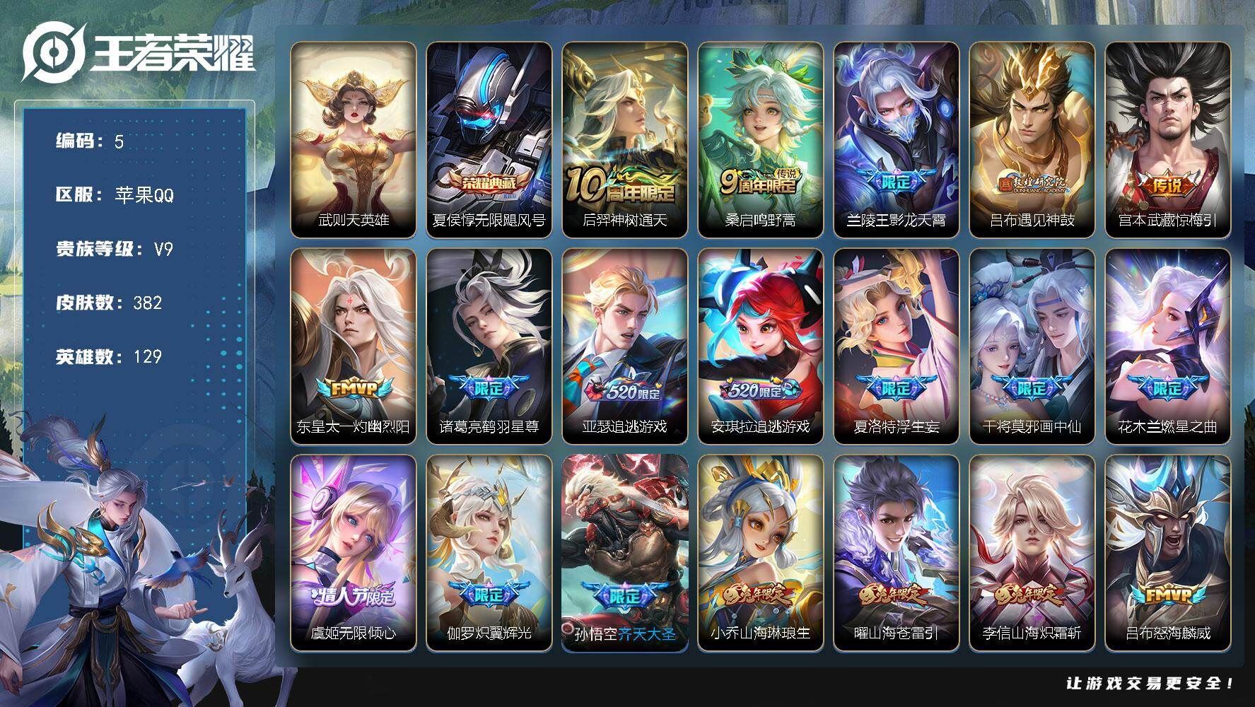 【账号佳】 【可二次实名】可二次苹果Q【营地:349617907】-V9-最强王者段位-129英雄-382皮肤-1典藏皮肤-1典藏英雄-50传说-129史诗【英雄全皮】:娜可露露全皮,橘右京全皮,夏洛特全皮,金蝉全皮【荣耀典藏】:武则天英雄,夏侯惇无限飓风号【传说皮肤】:后羿神树通天,桑启鸣野蒿,兰陵王影龙天霄,吕布遇见神鼓,宫本武藏惊梅引,东皇太一灼幽烈阳,诸葛亮鹤羽星尊,亚瑟追逃游戏,安琪拉追逃游戏,夏洛特浮生妄,干将莫邪画中仙,花木兰燃星之曲,虞姬无限倾心,伽罗炽翼辉光,孙悟空齐天大圣,小乔山海琳琅生,曜山海苍雷引,李信山海炽霜斩,吕布怒海麟威,李白诗剑行,狄仁杰神器狴犴令,不知火舞绯月行,王昭君星穹之声,百里守约碎云,橘右京枫霜尽,娜可露露前尘镜,孙尚香音你闪耀,马可波罗深海之息,后羿无尽星芒,大乔挚爱花嫁,孙策挚爱之约,蔡文姬花朝如约,鲁班七号寅虎瑞焰,孙尚香异界灵契,貂蝉遇见胡旋,赵云淬星耀世,王昭君乞巧织情,小乔音你心动,李元芳飞鸢探春,诸葛亮时雨天司,铠绛天战甲,虞姬启明星使,伽罗太华,貂蝉猫影幻舞,梦奇胖达荣荣,后羿黄金射手座,貂蝉仲夏夜之梦,宫本武藏地狱之眼,武则天海洋之心,狄仁杰超时空战士【限定皮肤】:白起狰,狄仁杰阴阳师,虞姬凯尔特女王,小乔山海琳琅生,赵云皇家上将,墨子神迹守卫,墨子降魔,妲己热情桑巴,妲己时之彼端,妲己时之奇旅,孙尚香异界灵契,鲁班七号乒乒小将,鲁班七号寅虎瑞焰,庄周蜃楼王,庄周玄嵩,庄周高山流水,钟无艳超时空战士,孙膑妖精王,孙膑寅虎展翼,扁鹊炼金王,扁鹊奇幻香踪,白起夜都怪侠,芈月重明,芈月幻夜卜梦,吕布遇见神鼓,甄姬幽恒,甄姬女儿国国王,甄姬游园惊梦,甄姬落雪兰心,曹操烛龙,典韦穷奇,马可波罗深海之息,马可波罗山海玄木吟,狄仁杰魔术师,狄仁杰万华元夜,狄仁杰神器狴犴令,关羽百相守梦,貂蝉遇见胡旋,安琪拉追逃游戏,花木兰瑞麟志,花木兰默契交锋,花木兰燃星之曲,不知火舞绯月行,娜可露露前尘镜,橘右京枫霜尽,亚瑟追逃游戏,孙悟空孙行者,孙悟空齐天大圣,牛魔御旌,后羿辉光之辰,后羿如梦令,后羿圣弓游侠,后羿无尽星芒,刘备百相守梦,李元芳匿光侦查者,李元芳云中旅人,虞姬启明星使,虞姬无限倾心,钟馗驱傩正仪,杨戬潮玩骑兵,干将莫邪真爱魔法,干将莫邪画中仙,雅典娜黎明之约,太乙真人饕餮,鬼谷子原初探秘者,鬼谷子五谷丰年,诸葛亮时雨天司,诸葛亮鹤羽星尊,大乔白鹤梁神女,大乔挚爱花嫁,黄忠火炮绅士,苏烈千军破阵,弈星混沌棋,梦奇顽趣,公孙离玉兔公主,沈梦溪大漠名商,沈梦溪匿光破解者,明世隐疑决卦,明世隐吟游魔法,裴擒虎天狼狩猎者,裴擒虎擒涛扼浪,狂铁御狮,狂铁电玩高手,瑶山海碧波行,李信山海炽霜斩,伽罗太华,伽罗天狼溯光者,伽罗炽翼辉光,盾山御銮,盾山梦圆繁星,孙策挚爱之约,猪八戒猪悟能,上官婉儿神器万象笔,嫦娥拒霜思,嫦娥暖冬兔眠,曜山海苍雷引,西施玲珑珍味,鲁班大师匿光启智者,鲁班大师探海日志,镜匿光追影者,桑启海盐诗旅,夏洛特浮生妄,金蝉唐三藏,暃星界游侠,艾琳女武神,艾琳流音漫舞,张良古海寻踪,妲己灵卜魔法,伽罗琥珀纪元,大乔乘龙忆丹青,安琪拉乘龙聚宝船,沈梦溪龙舞盛年,李元芳蔬乡物语【年限皮肤】:后羿辉光之辰,花木兰瑞麟志,庄周玄嵩,甄姬幽恒,伽罗太华,诸葛亮时雨天司,鲁班七号寅虎瑞焰,孙膑寅虎展翼,小乔山海琳琅生,曜山海苍雷引,李信山海炽霜斩,瑶山海碧波行,马可波罗山海玄木吟,大乔乘龙忆丹青,安琪拉乘龙聚宝船,各种道具详情看截图、低价出售找回包 赔、截图展示段位不代 表实际段位,如赛季更新等不可抗拒因素发生变化、时限道具不保证所剩时间、标题未写送点劵默认不送【卖号买号首选亿梦】