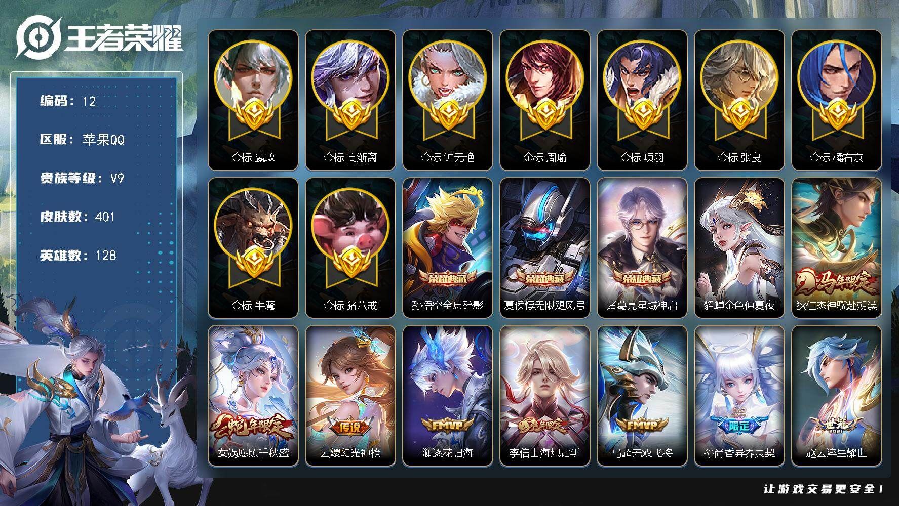 【账号佳】 【可二次实名】可二次苹果Q【营地:93669832】-V9-最强王者段位-128英雄-401皮肤-3典藏皮肤-28传说-118史诗【金标】:金标钟无艳,金标高渐离,金标橘右京,金标猪八戒,金标嬴政,金标项羽,金标牛魔,金标张良,金标周瑜【星元皮肤】:貂蝉金色仲夏夜【英雄全皮】:刘邦全皮,孙权全皮,敖隐全皮,金蝉全皮,空空儿全皮,影全皮【荣耀典藏】:孙悟空全息碎影,夏侯惇无限飓风号,诸葛亮星域神启【传说皮肤】:狄仁杰神骥赴朔漠,女娲愿照千秋盛,云缨幻光神枪,澜逐花归海,李信山海炽霜斩,马超无双飞将,孙尚香异界灵契,赵云淬星耀世,公孙离祈雪灵祝,镜炽阳神光,虞姬启明星使,孙悟空零号赤焰,曜云鹰飞将,刘备时之恋人,伽罗太华,貂蝉猫影幻舞,张良黄金白羊座,干将莫邪久胜战神,达摩黄金狮子座,花木兰冠军飞将,后羿黄金射手座,杨戬永曜之星,诸葛亮武陵仙君,貂蝉仲夏夜之梦,李白凤求凰,孙尚香末日机甲,宫本武藏地狱之眼,吕布天魔缭乱【限定皮肤】:白起狰,姜子牙天穹之誓,狄仁杰阴阳师,虞姬凯尔特女王,赵云皇家上将,赵云龙胆,墨子神迹守卫,妲己热情桑巴,妲己时之彼端,嬴政优雅恋人,嬴政白昼王子,孙尚香蔷薇恋人,孙尚香异界灵契,鲁班七号狮舞东方,庄周蜃楼王,庄周云端筑梦师,庄周玄嵩,庄周高山流水,高渐离死亡摇滚,阿轲迷踪丽影,钟无艳王者之锤,钟无艳超时空战士,孙膑妖精王,扁鹊炼金王,扁鹊奇幻香踪,芈月重明,芈月白晶晶,吕布天魔缭乱,吕布猎兽之王,元歌云间偶戏,元歌无心,夏侯惇朔风刀,甄姬幽恒,甄姬落雪兰心,曹操烛龙,典韦穷奇,典韦蓝屏警告,典韦岱宗,马可波罗暗影游猎,马可波罗山海玄木吟,狄仁杰魔术师,狄仁杰万华元夜,达摩星际陆战队,达摩沙漠行僧,项羽海滩派对,老夫子圣诞老人,老夫子醍醐杖,老夫子航海奇遇记,关羽冰锋战神,程咬金演武夺筹,刘邦夺宝奇兵,韩信飞衡,王昭君凤凰于飞,花木兰青春决赛季,亚瑟狮心王,亚瑟潮玩骑士王,孙悟空美猴王,孙悟空至尊宝,孙悟空大圣娶亲,孙悟空零号赤焰,牛魔御旌,牛魔奔雷神使,后羿辉光之辰,后羿如梦令,后羿圣弓游侠,李元芳银河之约,李元芳云中旅人,虞姬霸王别姬,虞姬启明星使,钟馗神迹守卫,钟馗驱傩正仪,杨玉环遇见飞天,杨戬永曜之星,杨戬潮玩骑兵,女娲朔望之晖,干将莫邪冰霜恋舞曲,干将莫邪真爱魔法,雅典娜单词大作战,雅典娜黎明之约,太乙真人饕餮,太乙真人华丽摇滚,鬼谷子原初探秘者,鬼谷子五谷丰年,诸葛亮武陵仙君,黄忠烈魂,苏烈千军破阵,百里玄策原初追逐者,弈星混沌棋,梦奇顽趣,公孙离祈雪灵祝,沈梦溪星空之诺,沈梦溪大漠名商,明世隐疑决卦,裴擒虎天狼狩猎者,裴擒虎李小龙,裴擒虎擒涛扼浪,狂铁御狮,米莱狄御霄,米莱狄胡桃异想国,云中君纤云弄巧,李信山海炽霜斩,伽罗太华,盾山御銮,猪八戒西部大镖客,上官婉儿梁祝,上官婉儿天狼绘梦者,嫦娥如梦令,嫦娥暖冬兔眠,蒙犽狂想玩偶喵,鲁班大师探海日志,桑启海盐诗旅,金蝉唐三藏,暃星界游侠,艾琳流音漫舞,司空震地狱燃心,阿古朵江河有灵,张良古海寻踪,高渐离燃音魔法,妲己灵卜魔法,鬼谷子天穹祈灯,沈梦溪龙舞盛年,鲁班七号蔬乡物语,李元芳蔬乡物语,刘邦剑破天穹,程咬金群星魔术团,周瑜熔金海岸【年限皮肤】:孙悟空美猴王,王昭君凤凰于飞,李白凤求凰,杨戬永曜之星,后羿辉光之辰,庄周玄嵩,甄姬幽恒,伽罗太华,典韦岱宗,韩信飞衡,公孙离祈雪灵祝,牛魔奔雷神使,李信山海炽霜斩,马可波罗山海玄木吟,女娲愿照千秋盛,各种道具详情看截图、低价出售找回包 赔、截图展示段位不代 表实际段位,如赛季更新等不可抗拒因素发生变化、时限道具不保证所剩时间、标题未写送点劵默认不送【卖号买号首选亿梦】