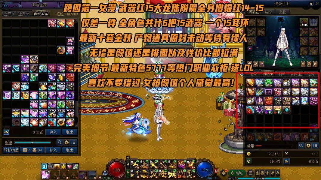 【账号佳】【地下城与勇士】【编号:1172260】【可二次实名】【信誉分900】【跨四第一女漫 武器红15大龙珠附魔】【最新金秋礼包 核心部位红15】男女枪手连体 全身增幅红14-15 仅差一件 全角色共计6把15武器 一个15耳环 全身13奶爸 最新十套金秋 产物道具原封未动等待有缘人 无论是颜值还是排面以及性价比都拉满 完美细节 最新特色5777等热门职业衣柜 送LOL 喜欢不要错过 女枪颜值个人感觉最高!金秋产物已分配到小号上面【女漫】【男漫】【剑魔】【奶爸】【奶妈】等热门职业【6把金色武器】【送lol 152皮肤】【超高信誉分】