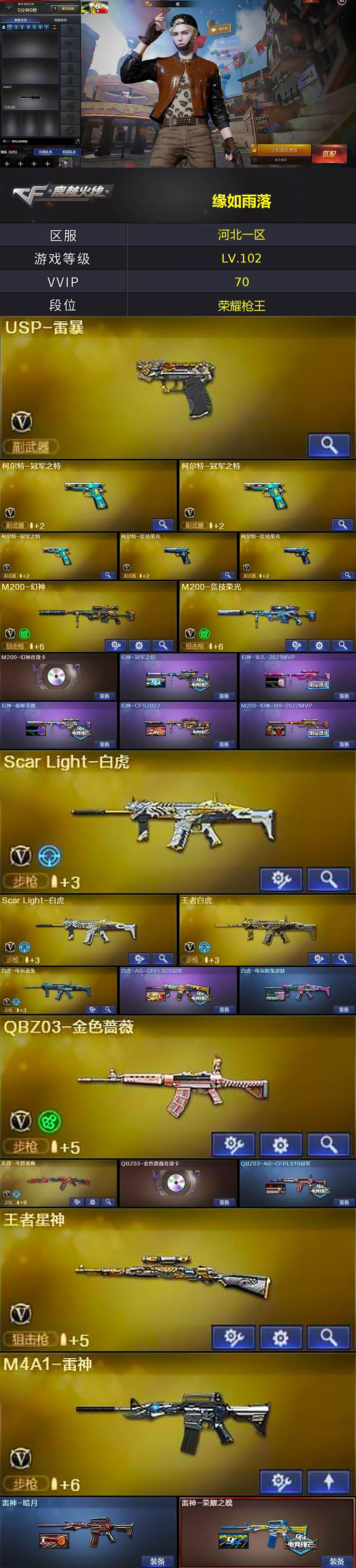 【账号佳】【穿越火线】【编号:962490】【可二次实名】河北一区84V-20王者武器数-2炫金武器数 【热门武器】:QBZ03-金色蔷薇,Scar Light-白虎*2,HK417-朱雀,M200-幻神,M200-竞技荣光,白虎-电玩蓝兔,柯尔特-冠军之特*3,M4A1-黑骑士*3,金色蔷薇-空,火麒麟-绝迹,USP-雷暴,沙鹰-修罗,金刚伞 【王者炫金武器】:王者之魄高爆手雷,高爆手雷-雷霆王者*5,炫金火麒麟,炫金修罗 【音效卡】:M200-幻神音效卡,M4A1-黑骑士音效卡,Barrett-毁灭音效卡,QBZ03-金色蔷薇音效卡 【皮肤】:幻神-冠军之幻,幻神-宠儿-2021MVP,幻神-巅峰荣耀,幻神-CFS2022,M200-幻神-N9-2022MVP,白虎-AG-CFPLS20冠军,白虎-电玩粉兔皮肤,QBZ03-AG-CFPLS19冠军,雷神-暗月,雷神-荣耀之魄,火麒麟-白虎,火麒麟-百城,火麒麟-心动糖果,毁灭-荣耀之怒,毁灭-英雄计划 皮肤,M4A1-千变-孔明皮肤,黑龙-冠军之武,战神-粉色甜心皮肤,战神-紫绶金章皮肤*2,AK47-B-常胜将军-曹操*2,AK47-B-常胜将军-刘备,AK47-B-常胜将军-孙权,屠龙-荣耀之锋*2,擎天-冠军之击 【角色】:炫,雨棠,电竞教官-云悠悠,鹰,乔伊教练,暗夜-X,芳心审判者,嘉年华灵狐,卡塔琳娜,兰-新年限定,灵动武士,灵狐者-七夕宝贝,麻雀,潘多拉-X,潘多拉-甜心教官,潜龙队-X,斯沃特-X,铁骑荣耀,影武者-X,团团 【人偶武器】:火麒麟-绝迹,M4A1-雷神-精英刀锋,金色蔷薇-空,AWM-灵狐-15周年嘉年华,迷你深渊冰龙,迷你生化手雷,闪光弹-貂蝉,高爆手雷-大乔,迷你超能女侍,灵狐娃娃手雷 【暴走生化】:超级对讲机 【挑战大师】:AK47-冰龙粉碎者*2,激光毁灭者III-白马银枪 【英雄级武器】:AK47-火麒麟*2,M4A1-黑龙,M4A1-雷神,M4A1-黑骑士*3,AK47-黑鲨,HK417-朱雀,Scar Light-白虎*2,无影-神兵利器,QBZ03-金色蔷薇,烈火-动感闪耀,AK-47-猩红传说*2,黑骑士-海王,AK47-B-常胜将军,王者白虎-觉醒版,白虎-电玩蓝兔,机械迷城-穹宇,AK47-B-身先士卒,AK47-B-战士,天罚-斗烈龙驹,Barrett-毁灭,Barrett-极光,M200-幻神,M200-竞技荣光,王者星神-觉醒版,Barrett-暗月传说*6,沙鹰-修罗,USP-雷暴,柯尔特-冠军之特*3,柯尔特-竞技荣光*2,天神-动感闪耀,屠龙*3,龙啸,麒麟刺-堕天神,擎天,幻灵之锋,擎天-竞技荣光,屠龙-动感闪耀,王者之啸-觉醒版,王者之刺-觉醒版,雷霆王者之锋-觉醒版,屠龙-斗烈龙驹,高爆手雷-堕天神,高爆手雷-幻灵,高爆手雷-竞技荣光*4,手雷-动感闪耀,高爆手雷-雷霆王者-觉醒版*5,闪光弹-堕天神,闪光弹-幻灵,闪光弹-竞技荣光*2,闪光弹-雷霆王者-觉醒版*5,烟雾弹-堕天神,烟雾弹-幻灵,烟雾弹-竞技荣光*2,烟雾弹-雷霆王者-觉醒版*4,M4A1-赤狱骑士,AK47-竞魂无影 【其他武器】:源-千变,源·火麒麟,魂·火麒麟-百城,源-黑龙,御·黑龙-龙太子,源·雷神,魂·M4A1-雷神-化蛇*2,魂·雷神-神秘按键,魂·雷神-新春神龙,魂-雷神-萌杀,魂·雷神-15周年嘉年华,御·雷神-机甲刑天,御·雷神-烈虎*2,雷神-赛博幻想,雷神-赛博朋克,源·黑骑士,魂·黑骑士-现代金属*2,魂·黑骑士-幻能朋克*2,魂·黑骑士-娜塔莉娅,源·无影*3,魂-死神-机甲核心,源·超新星,魂·龙血-锋芒破茧,源·青龙,魂·QBZ03-金色蔷薇-萌杀*2,源·猎神,AWM-裁决-百城联赛天津,魂·裁决-神秘按键,源·毁灭,魂·毁灭-航天科技*2,魂·毁灭-青帝*2,魂·毁灭-神秘黑洞,御·毁灭-葫芦兄弟*2,魂·Barrett-朱雀- 新春神龙,魂·炼狱-玩具枪*2,魂·炼狱-月,御·炼狱-女娲,魂·修罗-15周年嘉年华,魂·修罗-神兵利器,魂·修罗-现代金属,源·天神,魂·天神-宇航兔兔,源·擎天-萌杀*2,源-擎天*2,源·龙啸,魂·龙啸-NICE,魂·麒麟刺-神秘黑洞,灵·麒麟刺-穹宇 【道具】:EP战队炫彩背包,炫彩背包,超级背包,黄金生化钩,绿色巨人,灵魂忍者,迷雾幽灵,夺命之镰,防化服*2,金色流光-枪王排位*2,星辰流光-枪王排位,枪王排位28赛季金色流光,枪王排位29赛季金色流光,电玩兔兔表情,动感闪耀表情,EP战队击杀图标,C4-高无钳,C4-红龙,防弹头盔*6,防弹衣*4,C4工具钳*2,手雷包*2 【特殊枪械】:2白虎,3黑骑士