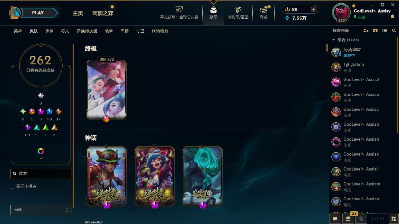 【账号佳】【英雄联盟】【编号:513216】【可包人脸】qzy【找回包赔】ak018052 恕瑞玛 等级489 英雄170 皮肤262 【终极3 神话3 限定38 传说17 史诗69 炫彩57】 【终极 k/da all out 萨勒芬妮】 【神话 十五周年纪念 希维尔 十周年纪念 安妮 源代码 乐芙兰】 【限定 暗杀星 奥莉安娜 暗影 沃里克 冰雪女神 辛德拉 点心宝贝 阿木木 都铎王朝 图奇 防暴士兵 格雷福斯 防暴士兵 辛吉德 防暴天使 凯尔 冠军之箭 艾希 广寒仙子 嫦娥 魅惑女巫 莫甘娜 觅心女王 艾希 胜利巨口 克格莫】 ----【截图展示段位不代表实际段位,如赛季更 新等不可抗拒因素发生变化、时限道具不保证所剩时间、标题未写送点卷默认不送】买号找【左友】永久包赔
