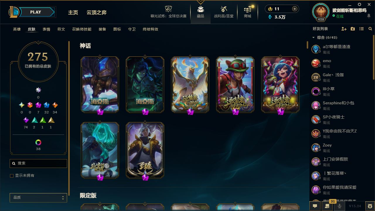 【账号佳】【英雄联盟】【编号:513234】【可二次实名】qzy ak021838【找回包赔】战争学院 428等级 171英雄 273皮肤 【7神话 31限定 34传说 74史诗 35炫彩】 【神话 海克斯科技 阿利斯塔 摄魂使者 薇恩 神凰行者 瑞羽圣凰 艾尼维亚 十周年纪念 安妮 源代码 乐芙兰 至臻 真实伤害 亚索】 【限定 冠军之隐 劫 寒冬精灵 璐璐 神凰行者 烈羽焰凰 霞 王国机神白虎 贾克斯 无头骑士 赫卡里姆 野兽猎人 瑟庄妮 泳池派对 菲奥娜 邪恶圣诞老人 维迦 都铎王朝 图奇】 ----【截图展示段位不代表实际段位,如赛季更 新等不可抗拒因素发生变化、时限道具不保证所剩时间、标题未写送点卷默认不送】买号找【左友】永久包赔