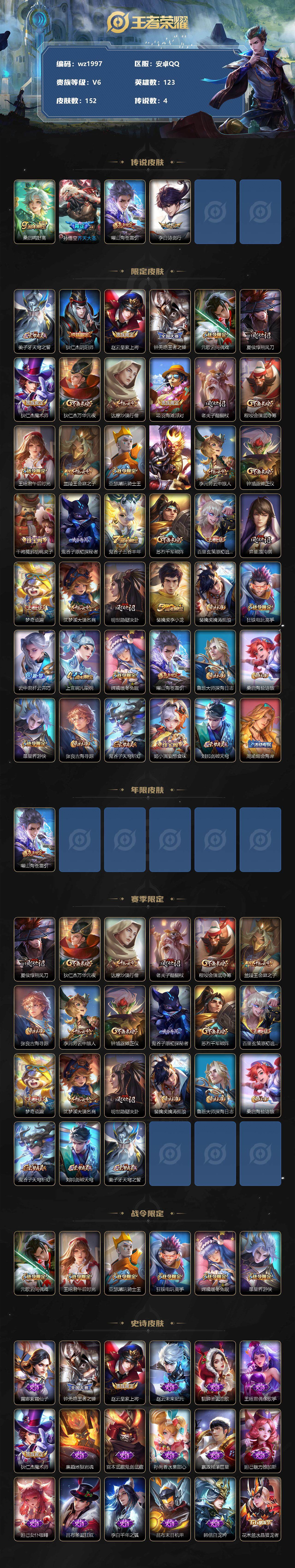 【账号佳】【王者荣耀】【编号:3339043】【可二次实名】【wz1997】安卓Q-V6-永恒钻石III段位-123英雄-152皮肤-0典藏-0珍品无双-0无双-0珍品传说-4传说-38史诗 【英雄全皮】:影全皮 【传说皮肤】:桑启鸣野蒿,孙悟空齐天大圣,曜山海苍雷引,李白诗剑行 【限定皮肤】:姜子牙天穹之誓,狄仁杰阴阳师,赵云皇家上将,钟无艳王者之锤,元歌云间偶戏,夏侯惇朔风刀,狄仁杰魔术师,狄仁杰万华元夜,达摩沙漠行僧,项羽海滩派对,老夫子醍醐杖,程咬金演武夺筹,王昭君午后时光,兰陵王金庭之子,亚瑟潮玩骑士王,孙悟空齐天大圣,李元芳云中旅人,钟馗驱傩正仪,干将莫邪胡桃夹子,鬼谷子原初探秘者,鬼谷子五谷丰年,苏烈千军破阵,百里玄策原初追逐者,弈星混沌棋,梦奇顽趣,沈梦溪大漠名商,明世隐疑决卦,裴擒虎李小龙,裴擒虎擒涛扼浪,狂铁电玩高手,云中君纤云弄巧,上官婉儿梁祝,嫦娥暖冬兔眠,曜山海苍雷引,鲁班大师探海日志,桑启海盐诗旅,暃星界游侠,张良古海寻踪,鬼谷子天穹祈灯,姬小满妄想食味,刘邦剑破天穹,周瑜熔金海岸 【年限皮肤】:曜山海苍雷引 【赛季限定】:夏侯惇朔风刀,狄仁杰万华元夜,达摩沙漠行僧,老夫子醍醐杖,程咬金演武夺筹,兰陵王金庭之子,张良古海寻踪,李元芳云中旅人,钟馗驱傩正仪,鬼谷子原初探秘者,苏烈千军破阵,百里玄策原初追逐者,弈星混沌棋,梦奇顽趣,沈梦溪大漠名商,明世隐疑决卦,裴擒虎擒涛扼浪,鲁班大师探海日志,桑启海盐诗旅,鬼谷子天穹祈灯,刘邦剑破天穹,姜子牙天穹之誓 【战令限定】:元歌云间偶戏,王昭君午后时光,亚瑟潮玩骑士王,狂铁电玩高手,嫦娥暖冬兔眠,暃星界游侠 【史诗皮肤】:露娜紫霞仙子,钟无艳王者之锤,赵云皇家上将,赵云未来纪元,貂蝉圣诞恋歌,王昭君偶像歌手,狄仁杰魔术师,廉颇地狱岩魂,宫本武藏鬼剑武藏,孙尚香水果甜心,嬴政摇滚巨星,妲己魅力维加斯,妲己女仆咖啡,吕布圣诞狂欢,李白千年之狐,吕布末日机甲,韩信白龙吟,花木兰水晶猎龙者,刘邦德古拉伯爵,兰陵王暗隐猎兽者,亚瑟心灵战警,百里守约特工魅影,铠曙光守护者,李元芳逐浪之夏,上官婉儿梁祝,不知火舞魅语,百里玄策原初追逐者,裴擒虎李小龙,云中君纤云弄巧,元歌云间偶戏,澜赏金猎手,狂铁电玩高手,鬼谷子五谷丰年,梦奇顽趣,暃星界游侠,姬小满妄想食味,牛魔星界战将,后羿石田雨龙 【其他皮肤】:项羽海滩派对,韩信教廷特使,韩信街头霸王,露娜哥特玫瑰,达摩大发明家,赵云忍炎影,白起白色死神,牛魔西部大镖客,武则天东方不败,扁鹊化身博士,宫本武藏未来纪元,孙膑天使之翼,妲己少女阿狸,典韦黄金武士,亚瑟死亡骑士,达摩拳王,花木兰兔女郎,宫本武藏万象初新,后羿阿尔法小队,狄仁杰阴阳师,刘备纽约教父,刘备汉昭烈帝,关羽龙腾万里,钟无艳海滩丽影,王昭君幻想奇妙夜,老夫子功夫老勺,诸葛亮掌控之力,李白敏锐之力,鬼谷子幻乐之宴,苏烈坚韧之力,明世隐虹云星官,小乔丁香结,沈梦溪鲨炮海盗猫,夏侯惇朔风刀,弈星混沌棋,哪吒次元突破,鲁班七号黑桃队长,明世隐疑决卦,老夫子醍醐杖,鬼谷子原初探秘者,狄仁杰万华元夜,亚瑟潮玩骑士王,刘禅秘密基地,程咬金演武夺筹,钟馗驱傩正仪,鲁班大师乓乓大师,苏烈千军破阵,干将莫邪胡桃夹子,达摩沙漠行僧,程咬金无双福将,兰陵王金庭之子,刘禅唤灵魔甲,王昭君午后时光,沈梦溪大漠名商,蒙恬蔚蓝守将,李元芳云中旅人,桑启海盐诗旅,嫦娥暖冬兔眠,海月幻泉雾影,猪八戒潮玩探月行,裴擒虎擒涛扼浪,太乙真人劲辣红锅,鲁班大师探海日志,张良古海寻踪,亚连破局者,鬼谷子天穹祈灯,廉颇功夫炙烤,刘邦剑破天穹,姜子牙天穹之誓,周瑜熔金海岸,盘古敬我三分,干将莫邪雾都夜雨,苍苍林狼骑,太乙真人谧流熔炉,典韦铁骨偃魂,影魅影绮裳,西施雪境奇遇,姜子牙星梦巡礼,东皇太一金福满堂,戈娅玫蓝誓约,鲁班七号福禄兄弟,项羽帝国元帅,露娜绯红之刃,钟无艳生化警戒,王昭君精灵公主,狄仁杰锦衣卫,孙悟空西部大镖客,马可波罗激情绿茵,苍维京掠夺者,诸葛亮星航指挥官,黄忠芝加哥教父,干将莫邪第七人偶,鬼谷子阿摩司公爵,百里守约绝影神枪,公孙离花间舞,裴擒虎街头旋风,元歌午夜歌剧院,司马懿魇语军师,伽罗花见巫女,上官婉儿修竹墨客,盘古创世神祝,云中君荷鲁斯之眼,曜归虚梦演,镜冰刃幻境,阿古朵熊喵少女,澜孤猎,司空震启蛰,云缨赤焰之缨,金蝉前尘,桑启画中游 【内测皮肤】:干将莫邪胡桃夹子 【营地ID】:1806737671