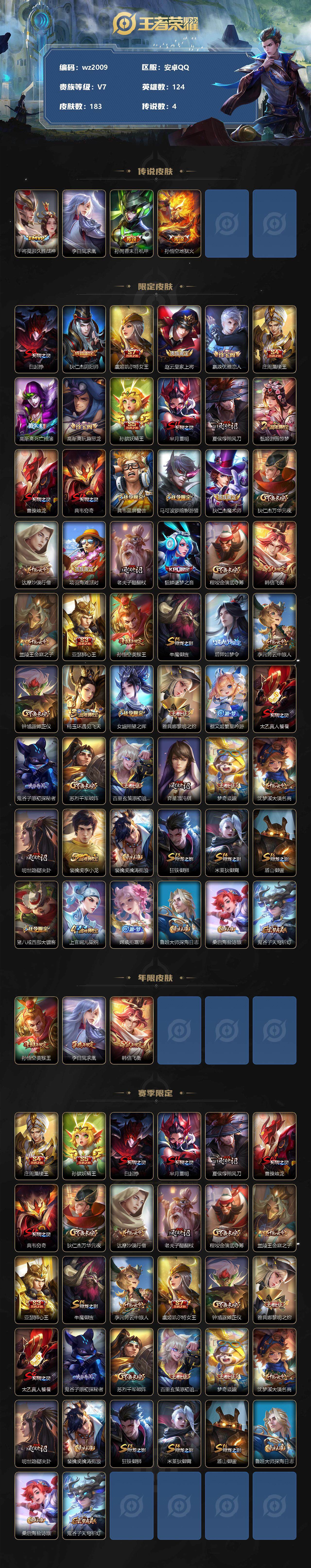 【账号佳】【王者荣耀】【编号:3339048】【可二次实名】【wz2009】安卓Q-V7-永恒钻石I段位-124英雄-183皮肤-0典藏-0珍品无双-0无双-0珍品传说-4传说-38史诗 【传说皮肤】:干将莫邪久胜战神,李白凤求凰,孙尚香末日机甲,孙悟空地狱火 【限定皮肤】:白起狰,狄仁杰阴阳师,虞姬凯尔特女王,赵云皇家上将,嬴政优雅恋人,庄周蜃楼王,高渐离死亡摇滚,高渐离玩趣恶龙,孙膑妖精王,芈月重明,夏侯惇朔风刀,甄姬游园惊梦,曹操烛龙,典韦穷奇,典韦蓝屏警告,马可波罗暗影游猎,狄仁杰魔术师,狄仁杰万华元夜,达摩沙漠行僧,项羽海滩派对,老夫子醍醐杖,貂蝉逐梦之音,程咬金演武夺筹,韩信飞衡,兰陵王金庭之子,亚瑟狮心王,孙悟空美猴王,牛魔御旌,后羿如梦令,李元芳云中旅人,钟馗驱傩正仪,杨玉环遇见飞天,女娲朔望之晖,雅典娜黎明之约,蔡文姬繁星吟游,太乙真人饕餮,鬼谷子原初探秘者,苏烈千军破阵,百里玄策原初追逐者,弈星混沌棋,梦奇顽趣,沈梦溪大漠名商,明世隐疑决卦,裴擒虎李小龙,裴擒虎擒涛扼浪,狂铁御狮,米莱狄御霄,盾山御銮,猪八戒西部大镖客,上官婉儿梁祝,嫦娥拒霜思,鲁班大师探海日志,桑启海盐诗旅,鬼谷子天穹祈灯 【年限皮肤】:孙悟空美猴王,李白凤求凰,韩信飞衡 【赛季限定】:庄周蜃楼王,孙膑妖精王,白起狰,芈月重明,夏侯惇朔风刀,曹操烛龙,典韦穷奇,狄仁杰万华元夜,达摩沙漠行僧,老夫子醍醐杖,程咬金演武夺筹,兰陵王金庭之子,亚瑟狮心王,牛魔御旌,李元芳云中旅人,虞姬凯尔特女王,钟馗驱傩正仪,雅典娜黎明之约,太乙真人饕餮,鬼谷子原初探秘者,苏烈千军破阵,百里玄策原初追逐者,弈星混沌棋,梦奇顽趣,沈梦溪大漠名商,明世隐疑决卦,裴擒虎擒涛扼浪,狂铁御狮,米莱狄御霄,盾山御銮,鲁班大师探海日志,桑启海盐诗旅,鬼谷子天穹祈灯 【战令限定】:典韦蓝屏警告,马可波罗暗影游猎,女娲朔望之晖,猪八戒西部大镖客 【史诗皮肤】:露娜紫霞仙子,赵云皇家上将,甄姬冰雪圆舞曲,狄仁杰魔术师,宫本武藏鬼剑武藏,孙尚香水果甜心,嬴政优雅恋人,嬴政摇滚巨星,妲己魅力维加斯,墨子金属风暴,曹操幽灵船长,李白千年之狐,张飞乱世虎臣,貂蝉逐梦之音,花木兰水晶猎龙者,兰陵王暗隐猎兽者,甄姬游园惊梦,雅典娜冰冠公主,百里守约特工魅影,铠曙光守护者,李元芳逐浪之夏,杨玉环遇见飞天,孙策猫狗日记,典韦蓝屏警告,狄仁杰鹰眼统帅,公孙离无限星赏官,上官婉儿梁祝,蔡文姬繁星吟游,韩信飞衡,后羿如梦令,橘右京修罗,马可波罗暗影游猎,百里玄策原初追逐者,裴擒虎李小龙,嫦娥拒霜思,雅典娜黎明之约,梦奇顽趣,阿轲化蝶舞 【其他皮肤】:项羽海滩派对,韩信教廷特使,韩信街头霸王,露娜哥特玫瑰,阿轲致命风华,阿轲爱心护理,达摩大发明家,赵云白执事,赵云忍炎影,芈月红桃皇后,白起白色死神,扁鹊化身博士,妲己少女阿狸,亚瑟死亡骑士,孙悟空美猴王,花木兰兔女郎,张飞五福同心,刘备万事如意,宫本武藏万象初新,亚瑟狮心王,后羿阿尔法小队,狄仁杰阴阳师,庄周蜃楼王,刘备纽约教父,高渐离死亡摇滚,孙膑妖精王,刘备汉昭烈帝,关羽龙腾万里,虞姬凯尔特女王,墨子进击墨子号,白起狰,钟无艳海滩丽影,太乙真人饕餮,宫本武藏霸王丸,曹操烛龙,王昭君幻想奇妙夜,芈月重明,老夫子功夫老勺,典韦穷奇,诸葛亮掌控之力,李白敏锐之力,鬼谷子幻乐之宴,狂铁御狮,安琪拉如懿,苏烈坚韧之力,大乔守护之力,项羽科学大爆炸,米莱狄御霄,明世隐虹云星官,张良幽兰居士,牛魔御旌,女娲朔望之晖,小乔丁香结,吕布野性能量,盾山御銮,孙膑归虚梦演,高渐离玩趣恶龙,沈梦溪鲨炮海盗猫,姜子牙炽热元素使,夏侯惇朔风刀,弈星混沌棋,哪吒次元突破,鲁班七号黑桃队长,明世隐疑决卦,盾山圆桌骑士,老夫子醍醐杖,猪八戒西部大镖客,狂铁特工战影,鬼谷子原初探秘者,狄仁杰万华元夜,刘禅秘密基地,程咬金演武夺筹,张良缤纷绘卷,钟馗驱傩正仪,鲁班大师乓乓大师,苏烈千军破阵,达摩沙漠行僧,程咬金无双福将,兰陵王金庭之子,沈梦溪大漠名商,李元芳云中旅人,桑启海盐诗旅,猪八戒潮玩探月行,裴擒虎擒涛扼浪,鲁班大师探海日志,鬼谷子天穹祈灯,廉颇功夫炙烤,戈娅玫蓝誓约,莱西奥踏浪烽翎,鲁班七号福禄兄弟,鲁班七号木偶奇遇记,高渐离金属狂潮,项羽帝国元帅,露娜绯红之刃,貂蝉异域舞娘,花木兰剑舞者,老夫子潮流仙人,曹操超能战警,小乔万圣前夜,孙膑未来旅行,孙悟空西部大镖客,周瑜海军大将,后羿精灵王,李白范海辛,钟馗地府判官,李元芳特种部队,虞姬加勒比小姐,关羽天启骑士,蔡文姬蔷薇王座,马可波罗激情绿茵,苍维京掠夺者,杨戬埃及法老,哪吒三太子,黄忠芝加哥教父,大乔伊势巫女,东皇太一东海龙王,鬼谷子阿摩司公爵,铠龙域领主,百里守约绝影神枪,苏烈爱与和平,公孙离花间舞,裴擒虎街头旋风,元歌午夜歌剧院,孙策海之征途,司马懿魇语军师,伽罗花见巫女,沈梦溪