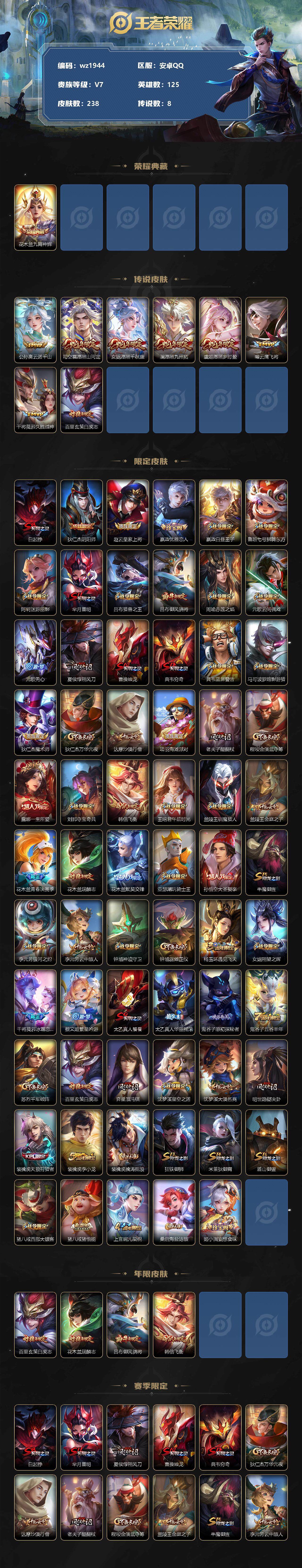【账号佳】【王者荣耀】【编号:3339085】【可二次实名】【wz1944】安卓Q-V7-至尊星耀II段位-125英雄-238皮肤-1典藏-0珍品无双-0无双-0珍品传说-8传说-60史诗 【英雄全皮】:阿轲全皮,猪八戒全皮 【荣耀典藏】:花木兰九霄神辉 【传说皮肤】:公孙离云诺千山,司空震愿照山河定,女娲愿照千秋盛,澜愿照九州拓,虞姬愿照岁时盈,曜云鹰飞将,干将莫邪久胜战神,百里玄策白虎志 【限定皮肤】:白起狰,狄仁杰阴阳师,赵云皇家上将,嬴政优雅恋人,嬴政白昼王子,鲁班七号狮舞东方,阿轲迷踪丽影,芈月重明,吕布猎兽之王,吕布御风骁将,周瑜赤莲之焰,元歌云间偶戏,元歌无心,夏侯惇朔风刀,曹操烛龙,典韦穷奇,典韦蓝屏警告,马可波罗暗影游猎,狄仁杰魔术师,狄仁杰万华元夜,达摩沙漠行僧,项羽海滩派对,老夫子醍醐杖,程咬金演武夺筹,露娜一生所爱,刘邦夺宝奇兵,韩信飞衡,王昭君午后时光,兰陵王驯魔猎人,兰陵王金庭之子,花木兰青春决赛季,花木兰瑞麟志,花木兰默契交锋,亚瑟潮玩骑士王,孙悟空大圣娶亲,牛魔御旌,李元芳银河之约,李元芳云中旅人,钟馗神迹守卫,钟馗驱傩正仪,杨玉环遇见飞天,女娲朔望之晖,干将莫邪冰霜恋舞曲,蔡文姬繁星吟游,太乙真人饕餮,太乙真人华丽摇滚,鬼谷子原初探秘者,鬼谷子五谷丰年,苏烈千军破阵,百里玄策白虎志,弈星混沌棋,沈梦溪星空之诺,沈梦溪大漠名商,明世隐疑决卦,裴擒虎天狼狩猎者,裴擒虎李小龙,裴擒虎擒涛扼浪,狂铁御狮,米莱狄御霄,盾山御銮,猪八戒西部大镖客,猪八戒猪悟能,上官婉儿梁祝,桑启海盐诗旅,姬小满妄想食味 【年限皮肤】:百里玄策白虎志,花木兰瑞麟志,吕布御风骁将,韩信飞衡 【赛季限定】:白起狰,芈月重明,夏侯惇朔风刀,曹操烛龙,典韦穷奇,狄仁杰万华元夜,达摩沙漠行僧,老夫子醍醐杖,程咬金演武夺筹,兰陵王金庭之子,牛魔御旌,李元芳云中旅人,钟馗驱傩正仪,太乙真人饕餮,鬼谷子原初探秘者,苏烈千军破阵,弈星混沌棋,沈梦溪大漠名商,明世隐疑决卦,裴擒虎擒涛扼浪,狂铁御狮,米莱狄御霄,盾山御銮,桑启海盐诗旅 【战令限定】:嬴政白昼王子,鲁班七号狮舞东方,阿轲迷踪丽影,吕布猎兽之王,周瑜赤莲之焰,元歌云间偶戏,典韦蓝屏警告,马可波罗暗影游猎,刘邦夺宝奇兵,王昭君午后时光,兰陵王驯魔猎人,亚瑟潮玩骑士王,李元芳银河之约,钟馗神迹守卫,女娲朔望之晖,沈梦溪星空之诺,猪八戒西部大镖客 【史诗皮肤】:露娜紫霞仙子,阿轲暗夜猫娘,赵云皇家上将,赵云未来纪元,貂蝉圣诞恋歌,甄姬冰雪圆舞曲,王昭君偶像歌手,狄仁杰魔术师,廉颇地狱岩魂,宫本武藏鬼剑武藏,孙尚香水果甜心,嬴政优雅恋人,嬴政暗夜贵公子,妲己女仆咖啡,刘禅绅士熊喵,曹操幽灵船长,李白千年之狐,吕布末日机甲,张飞乱世虎臣,花木兰水晶猎龙者,刘邦德古拉伯爵,夏侯惇乘风破浪,小乔缤纷独角兽,兰陵王暗隐猎兽者,诸葛亮黄金分割率,亚瑟心灵战警,雅典娜冰冠公主,花木兰青春决赛季,蔡文姬舞动绿茵,刘禅天才门将,阿轲节奏热浪,杨玉环遇见飞天,嬴政白昼王子,干将莫邪冰霜恋舞曲,露娜一生所爱,孙悟空大圣娶亲,花木兰瑞麟志,典韦蓝屏警告,裴擒虎天狼狩猎者,鲁班七号狮舞东方,狄仁杰鹰眼统帅,公孙离无限星赏官,兰陵王驯魔猎人,上官婉儿梁祝,蔡文姬繁星吟游,李元芳银河之约,韩信飞衡,阿轲迷踪丽影,马可波罗暗影游猎,裴擒虎李小龙,元歌云间偶戏,吕布御风骁将,花木兰默契交锋,猪八戒猪悟能,鬼谷子五谷丰年,元歌无心,刘禅电玩爆裂旋风,姬小满妄想食味,阿轲化蝶舞,黄忠百相守梦 【其他皮肤】:项羽海滩派对,韩信教廷特使,韩信街头霸王,露娜哥特玫瑰,阿轲致命风华,阿轲爱心护理,达摩大发明家,赵云白执事,赵云忍炎影,白起白色死神,扁鹊化身博士,孙膑天使之翼,妲己少女阿狸,典韦黄金武士,达摩拳王,花木兰兔女郎,张飞五福同心,甄姬花好人间,刘备万事如意,宫本武藏万象初新,后羿阿尔法小队,狄仁杰阴阳师,刘备纽约教父,刘备汉昭烈帝,关羽龙腾万里,墨子进击墨子号,白起狰,钟无艳海滩丽影,太乙真人饕餮,宫本武藏霸王丸,曹操烛龙,王昭君幻想奇妙夜,芈月重明,狂铁命运角斗场,老夫子功夫老勺,牛魔制霸全明星,孙尚香沉稳之力,典韦穷奇,李白敏锐之力,鬼谷子幻乐之宴,狂铁御狮,安琪拉如懿,太乙真人华丽摇滚,苏烈坚韧之力,大乔守护之力,项羽科学大爆炸,米莱狄御霄,吕布猎兽之王,明世隐虹云星官,张良幽兰居士,庄周奇妙博物学,牛魔御旌,女娲朔望之晖,小乔丁香结,吕布野性能量,钟馗神迹守卫,盾山御銮,孙膑归虚梦演,沈梦溪鲨炮海盗猫,姜子牙炽热元素使,夏侯惇朔风刀,周瑜赤莲之焰,沈梦溪星空之诺,弈星混沌棋,哪吒次元突破,鲁班七号黑桃队长,明世隐疑决卦,刘邦夺宝奇兵,盾山圆桌骑士,老夫子醍醐杖,猪八戒西部大镖客,狂铁特工战影,鬼谷子原初探秘者,狄仁杰万华元夜,亚瑟潮玩骑士王,刘禅秘密基地,杨戬次元傲视,